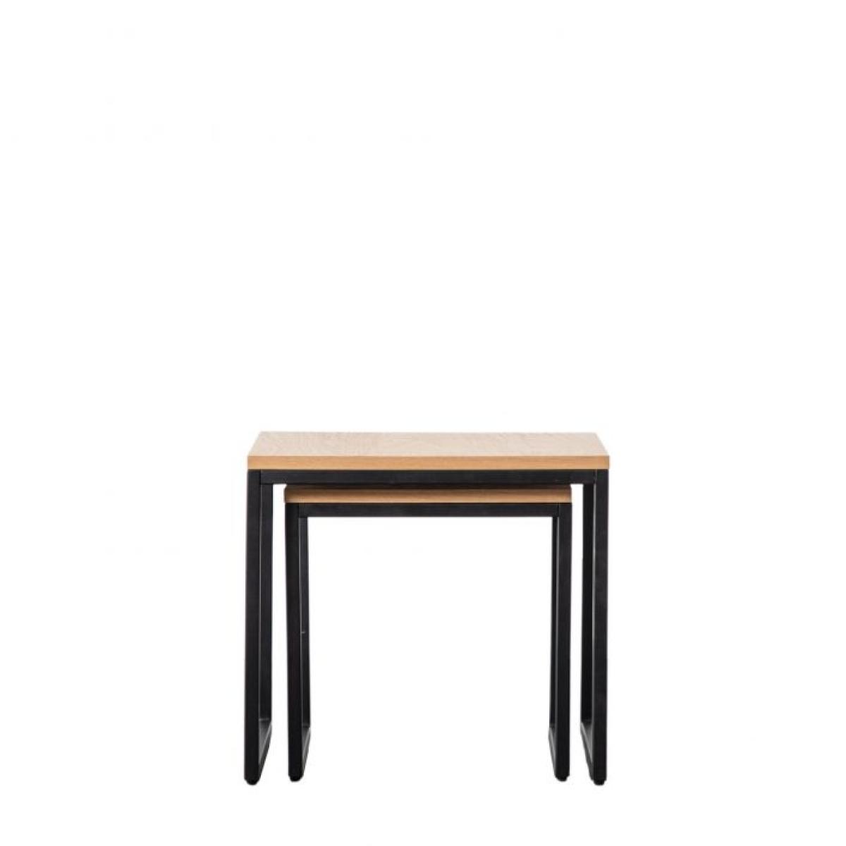 This stunning nest of tables combines clean sharp lines with natural oak veneer tops and matt black metal bases to offer crisp contemporary style. The smaller table fits under the larger one when not in use. It is part of a collection which offers a range of tables plus a display unit. The collection is part of our Packed-Flat Design Project, offering easy delivery to any room in any property, whilst reducing the packaging needed. Easy assembly is required, but all the tools needed are supplied.