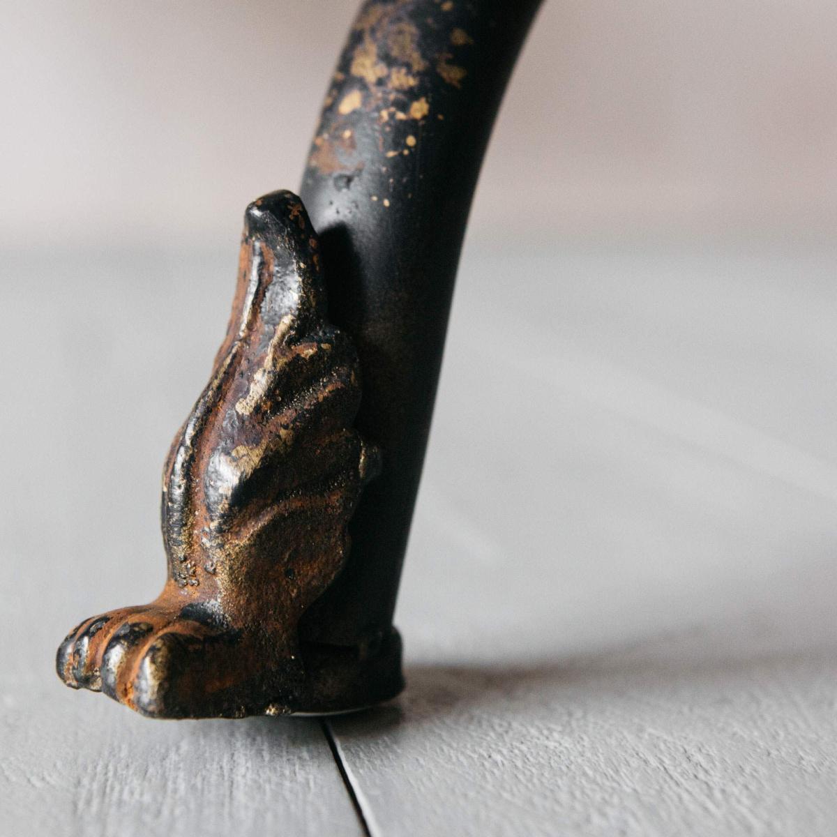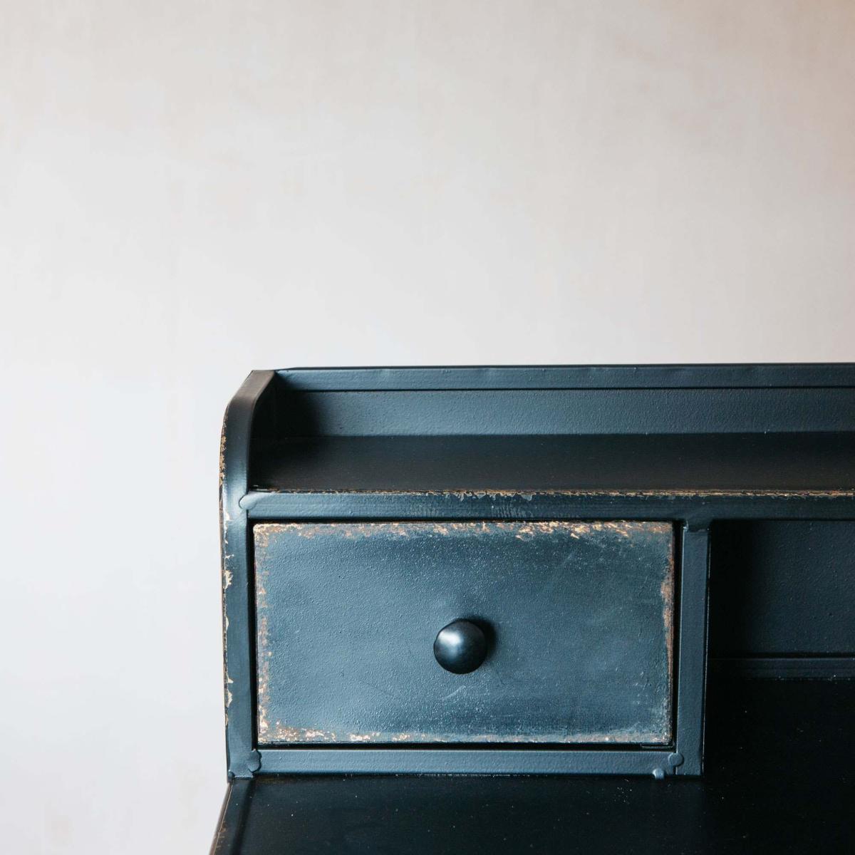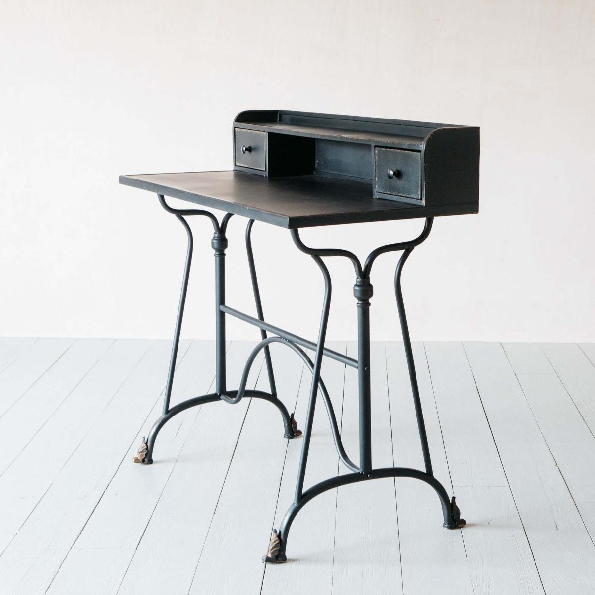 An industrial-inspired desk made of iron with rust detailing, featuring two drawers and a handy shelf to ensure your work surface remains clutter-free.