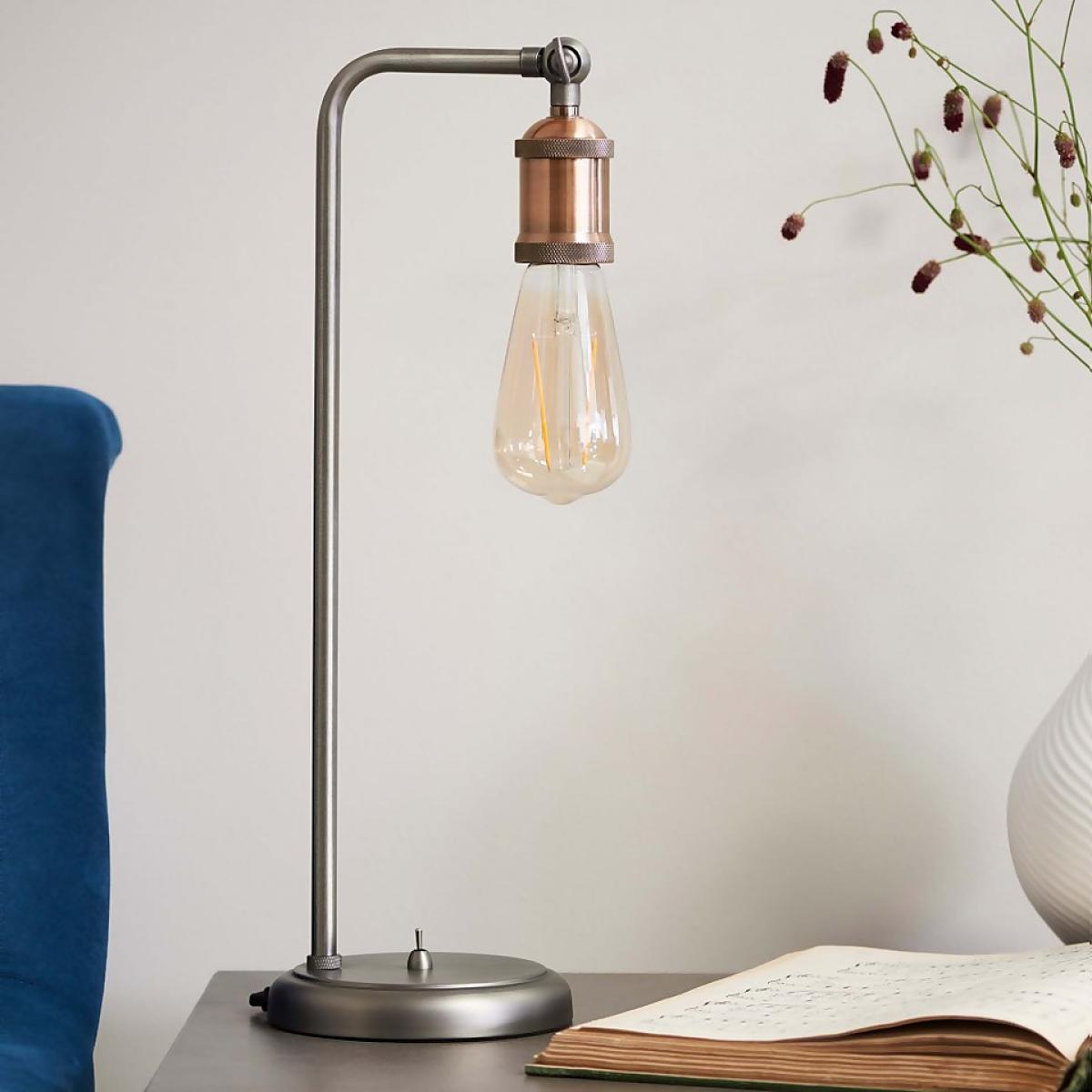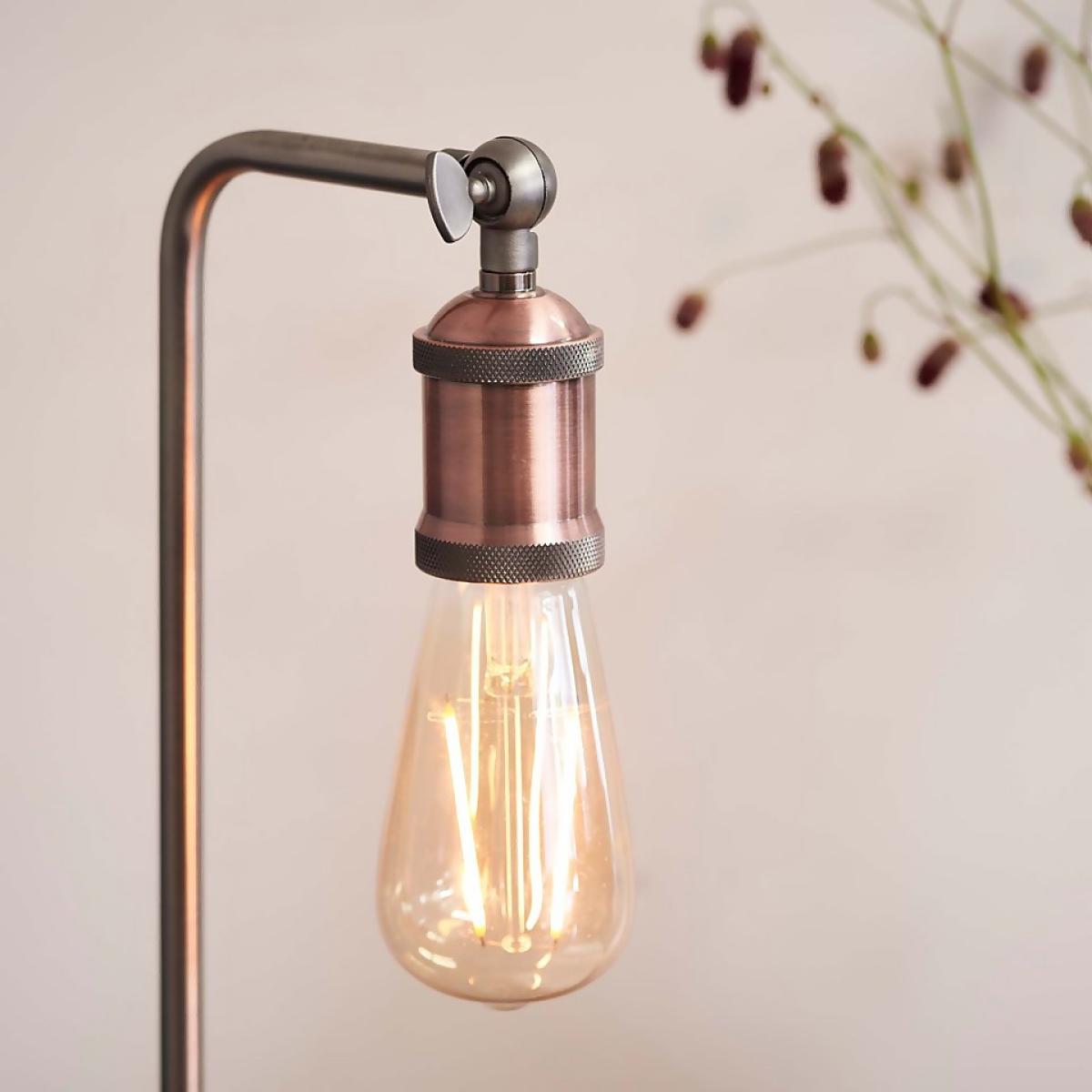 An industrial styled table light, finished in aged pewter and aged copper, making it bang up to date with on-trend 'resto' styling. Adjustable knuckles and knurled lamp holders complete the authentic look. Perfect when paired with filament LED lamps and easily controlled by a simple on/off base switch.