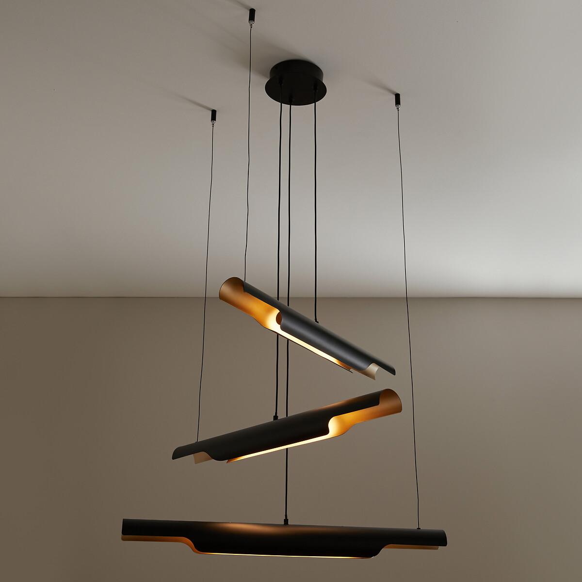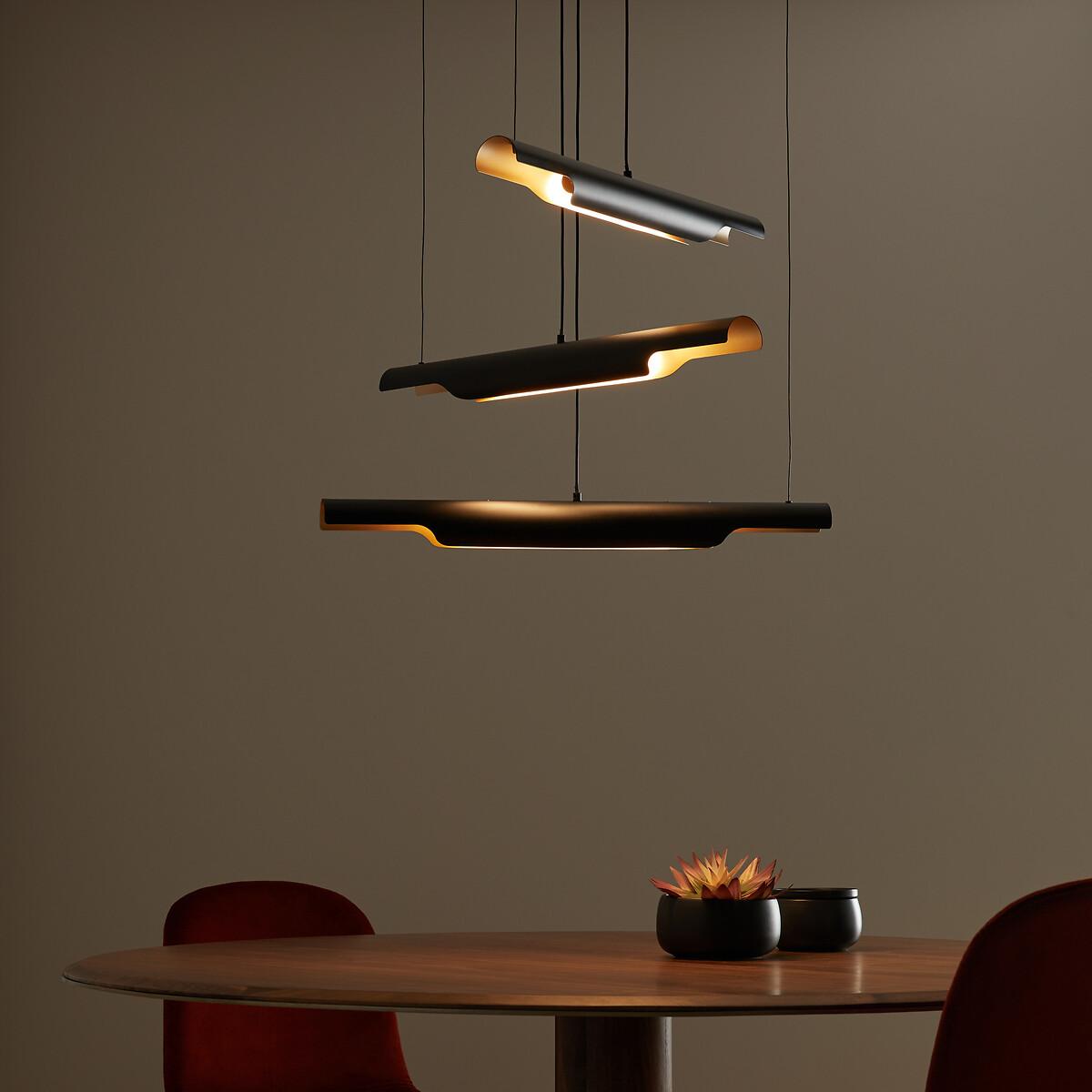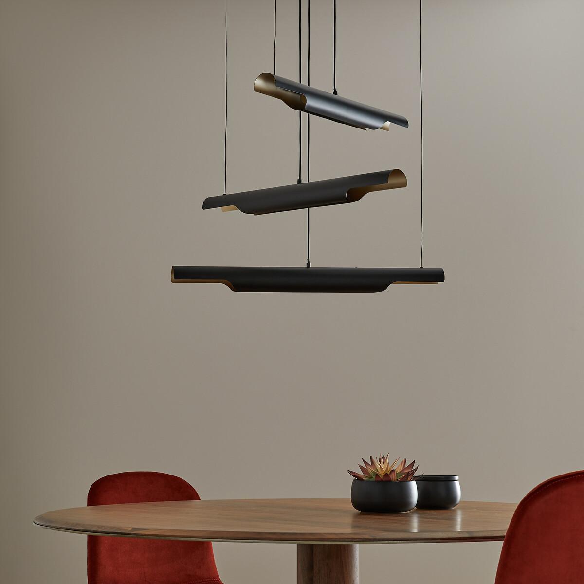 Graphic and decorative, the Henrio ceiling light and its tubular shapes are reminiscent of 70s design. Diffusing soft and subtle lighting, Henrio lends a warm atmosphere. The three cables are fixed to the ceiling and adjusted by adapting the length of each, iso you can choose a style that suits you best. Product Details • Exterior in iron with black epoxy finish • Brass-finish iron interior • 3 integrated LED tubes, 800 lumens/tube • Colour temperature: 3000. K • Not compatible with a dimmer switch. Dimensions • Tube length: 65cm • Tube diameter: 6cm • Adjustable height, 110cm max • Fixing plate: Diameter 15 x Height 4cmDelivery:. Sold pre-assembled. Note! Please check that all access points are large enough to accommodate your delivery (doors, stairs, lifts).Dimensions and weight of parcel1 parcel • L27 x H9.5 x D87.5cm, 3.3kg