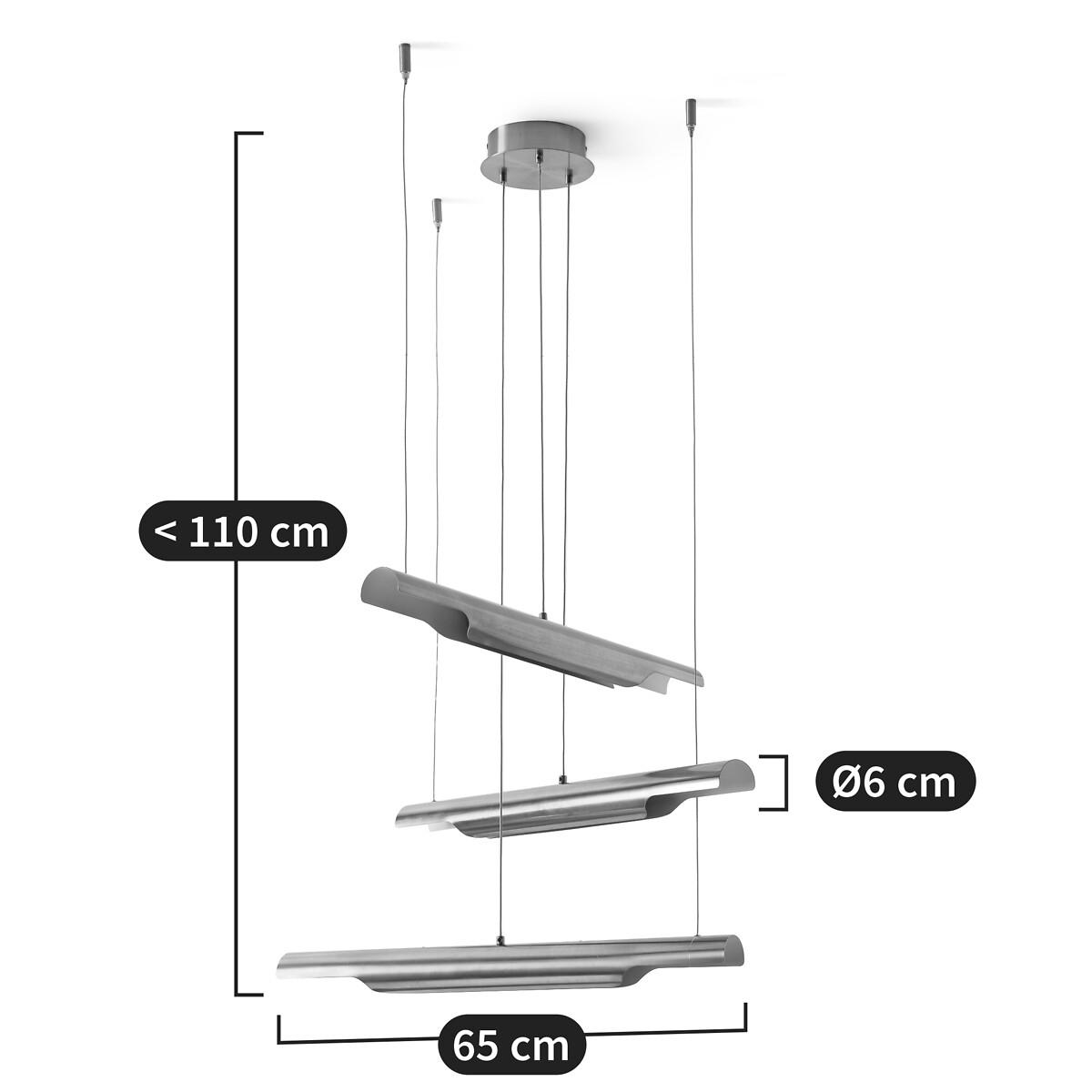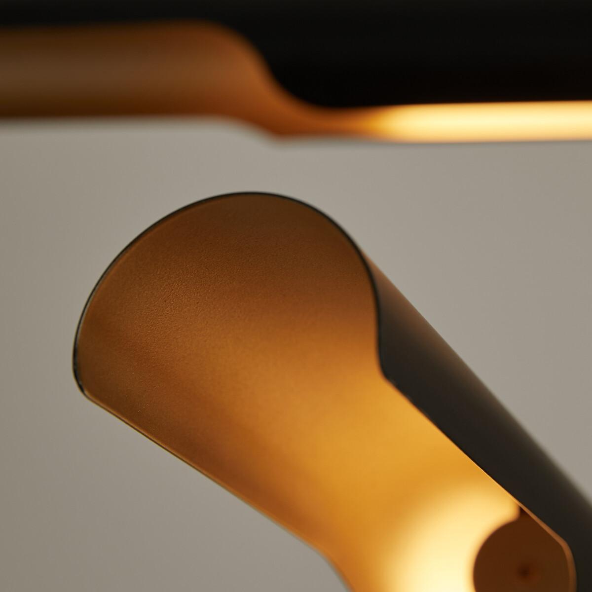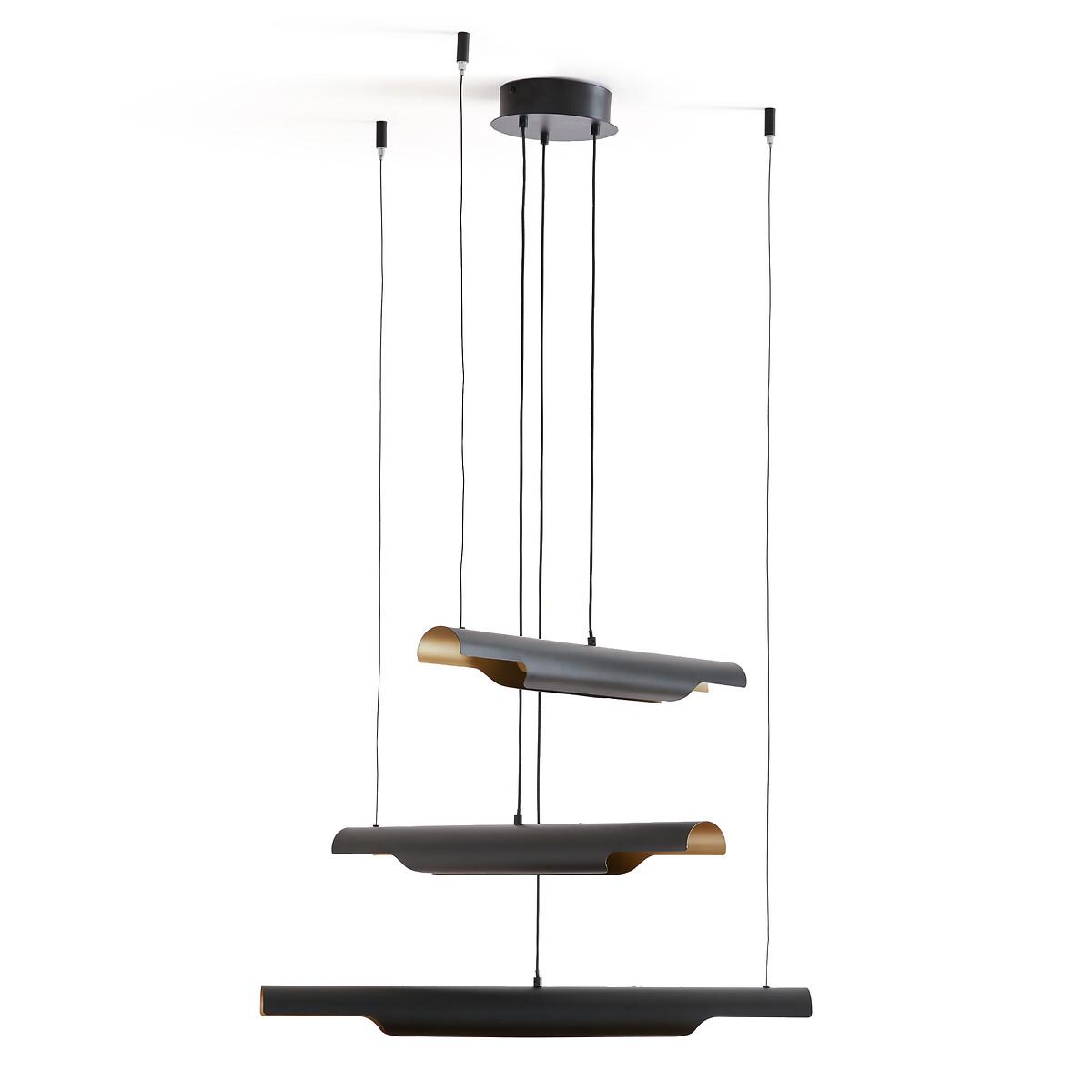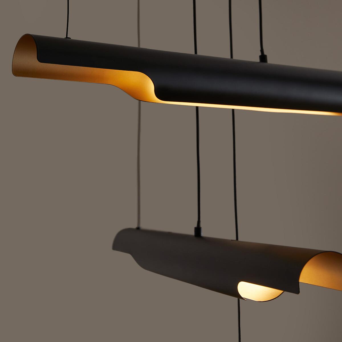 Graphic and decorative, the Henrio ceiling light and its tubular shapes are reminiscent of 70s design. Diffusing soft and subtle lighting, Henrio lends a warm atmosphere. The three cables are fixed to the ceiling and adjusted by adapting the length of each, iso you can choose a style that suits you best. Product Details • Exterior in iron with black epoxy finish • Brass-finish iron interior • 3 integrated LED tubes, 800 lumens/tube • Colour temperature: 3000. K • Not compatible with a dimmer switch. Dimensions • Tube length: 65cm • Tube diameter: 6cm • Adjustable height, 110cm max • Fixing plate: Diameter 15 x Height 4cmDelivery:. Sold pre-assembled. Note! Please check that all access points are large enough to accommodate your delivery (doors, stairs, lifts).Dimensions and weight of parcel1 parcel • L27 x H9.5 x D87.5cm, 3.3kg