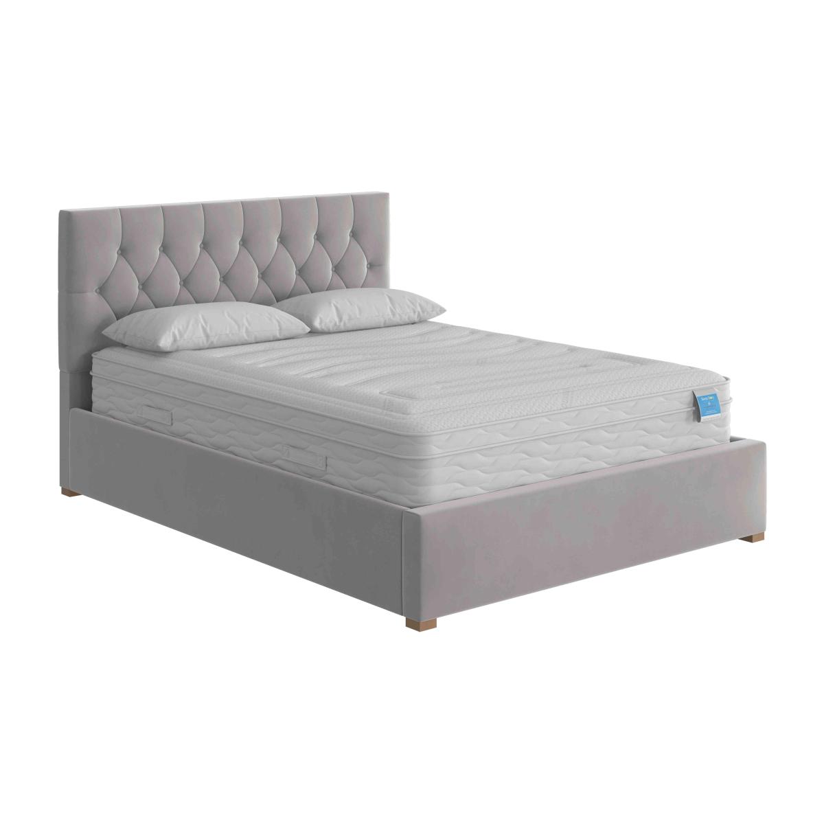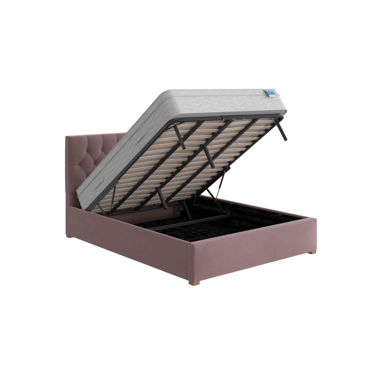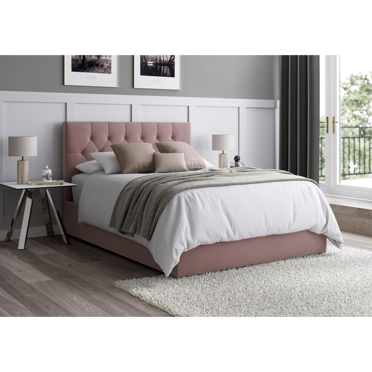 Classic Chesterfield-style buttoned headboard meets a contemporary lower profile in this beautifully upholstered ottoman bed frame with large storage space. Why you'll love it This lovely ottoman bed frame wows with classic Chesterfield buttoning. Contemporary silhouette with a lower headboard to fit in front of a window. Upholstered by hand. Hand pleating enhances the sumptuous padded look. With a roomy end-opening ottoman storage compartment. Enjoy easy access to the storage space with the piston-assisted lift design. Choice of high-quality velvet or linen-look fabric in a range of colours. In double, king and super king bed sizes. This ottoman bed frame is beautifully made in the UK. What you need to know Please take care when opening and closing the ottoman storage space. Mattress weight limit for all sizes is 80 kg. Clean upholstery weekly using a soft brush or vacuum with the curtain attachment. Professional cleaning advised for oil- and grease-based stains. Some fabrics can show wear on areas of more use or in direct sunlight.