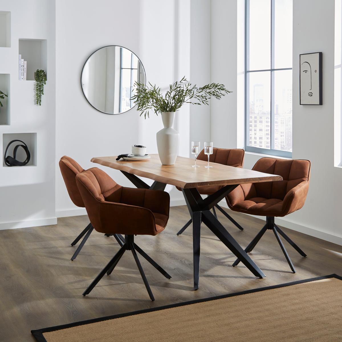 I really like the Henson Swivel Dining Chair for its blend of comfort and modern style. The tan suede finish adds warmth and texture, making it versatile enough to suit both contemporary and mid-century interiors. It works particularly well in spaces that aim for a cosy yet polished look - think open-plan kitchens, breakfast rooms, or even home offices. My styling tip would be to pair it with neutral or earthy-toned tableware and accessories to highlight its rich colour, or contrast it with sleek, minimalist surroundings for a striking effect. The swivel function is also a pragmatic touch, making it as functional as it is stylish.