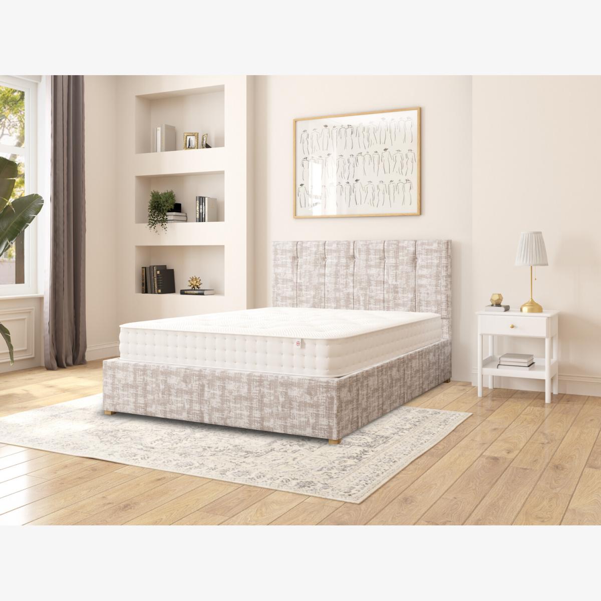 Quality upholstered ottoman storage bed, hand crafted in the UK. Each headboard is constructed with deep foam padding perfect for sitting up in bed and reading. We believe quality has no short cuts, meaning all our designs are hand upholstered by our skilled craftsmen. Our UK ottoman design features chunky upholstered panels, which means it is built to last. Quality sprung slats improve comfort and mattress lifespan. The easy lift ottoman mechanism is supported with quality gas pistons, enabling the storage to be accessed with minimal effort. Once the ottoman is elevated it will hold position, allowing hands free access to storage. Our ottomans offer the perfect storage solutions for rooms with no or limited space with a spacious storage area of approximately 28cm. The fabric base attaches to the underside of the bed, protecting your stored items. Each ottoman is finished with hardwood feet which have been hand turned and varnished.