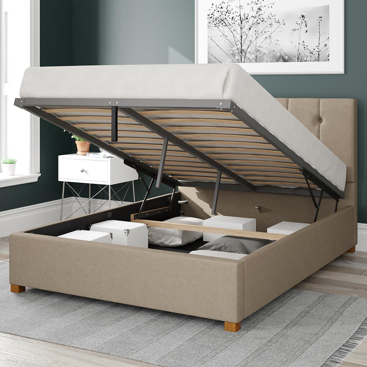 Slumber in style with the Hepburn Ottoman bed. A statement headboard with vertical buttoned design creates a sleek and clean aesthetic. Generous levels of deep padding create extra comfort. With its gas lift pistons, the ottoman bed provides ample storage space that can be easily accessed with minimal effort. It's worth noting that the storage area is not a boarded base, instead a fabric dust protection sheet attaches to the underside of the bed to keep your items neat and clean. Supportive sprung slats create a sturdy base with air-circulation, all finish with square-shaped solid wood feet which have been hand-turned to create an elegant finish. Product details:• Ottoman storage bed• Hand upholstered vertically buttoned headboard design• Upholstered in a plain weave linen. A tight and robust flat weave creates a classic look which is strong and durable• End-lift mechanism for convenient access• Large storage area with fabric dust protection sheet base• Durable gas pistons ensure the storage area remains securely open for hands-free use• Solid hand-turned hardwood feet• Sprung slatted base• Foam fillings• Made to order and expertly hand finished right here in the UK • Assembly required (2 person recommended)• Mattress not included• 12 month manufacturers warranty• Care advice:Wipe clean with a soft cloth Composition • Upholstery - Eire Linen (100% polyester)• Fillings - Foam • Frame - Chipboard, Plywood, MDF, Steel. This product will be dispatched by one of our trusted suppliers. You’ll be contacted by their selected courier about your delivery. Please note this item will be delivered to your doorstep. Please note that this item cannot be delivered to the Offshore Islands, Northern Ireland or the Republic of Ireland. Product Dimensions Single • Total Dimensions - H112cm x W100cm x L209cm• Storage Area Dimensions - W94 cm x L193 cm x H26 cm • Suitable for use with standard single mattresses (90cm x 190cm)Small Double • Total Dimensions - H112cm x W130cm x L209cm• Storage Area Dimensions - W122 cm x L193 cm x H26 cm • Suitable for use with standard small double mattresses (120cm x 190cm)Double • Total Dimensions - H112cm x W147cm x L209cm• Storage Area Dimensions - W141 cm x L193 cm x H26 cm • Suitable for use with standard double mattresses (135cm x 190cm)King• Total Dimensions - H112cm x W160cm x L219cm• Storage Area Dimensions - W154cm x L204 cm x H26 cm • Suitable for use with standard king mattresses (150cm x 200cm)Super King• Total Dimensions - H112cm x W190cm x L219cm• Storage Area Dimensions - W184 cm x L204 cm x H26 cm • Suitable for use with standard king mattresses (180cm x 200cm)Other dimensions• Headboard Height - 110 cm• Footboard Height: 30cm• Underbed Clearance: 5cm• Ottoman lift mechanism functions with a mattress with weight of up to 60 kg. Package DimensionsSingle:. Parcel 1 - 140cm x 113cm x 12cm, Weight: 12kg Parcel 2 - 212cm x 32cm x 19cm, Weight: 13kg Parcel 3 - 240cm x 180cm x 12, Weight: 18kg. Small Double:Parcel 1 - 140cm x 113cm x 12cm, Weight: 19kg Parcel 2 - 212cm x 32cm x 19cm, Weight: 17kg Parcel 3 - 240cm x 180cm x 12cm, Weight: 22kgDouble: Parcel 1 - 171cm x 113cm x 12cm, Weight: 22kg Parcel 2 - 212cm x 32cm x 19cm, Weight: 18kg Parcel 3 - 240cm x 180cm x 12cm, Weight: 23kgKing:. Parcel 1 - 171cm x 113cm x 12cm, Weight: 27kg Parcel 2 - 212cm x 32cm x 19cm, Weight: 22kg Parcel 3 - 240cm x 180cm x 12cm, Weight: 25kg Super King:Parcel 1 - 201cm x 113cm x 12cm, Weight: 30kg Parcel 2 - 212cm x 32cm x 19cm, Weight: 25kg Parcel 3 - 240cm x 180cm x 12cm, Weight: 27kg