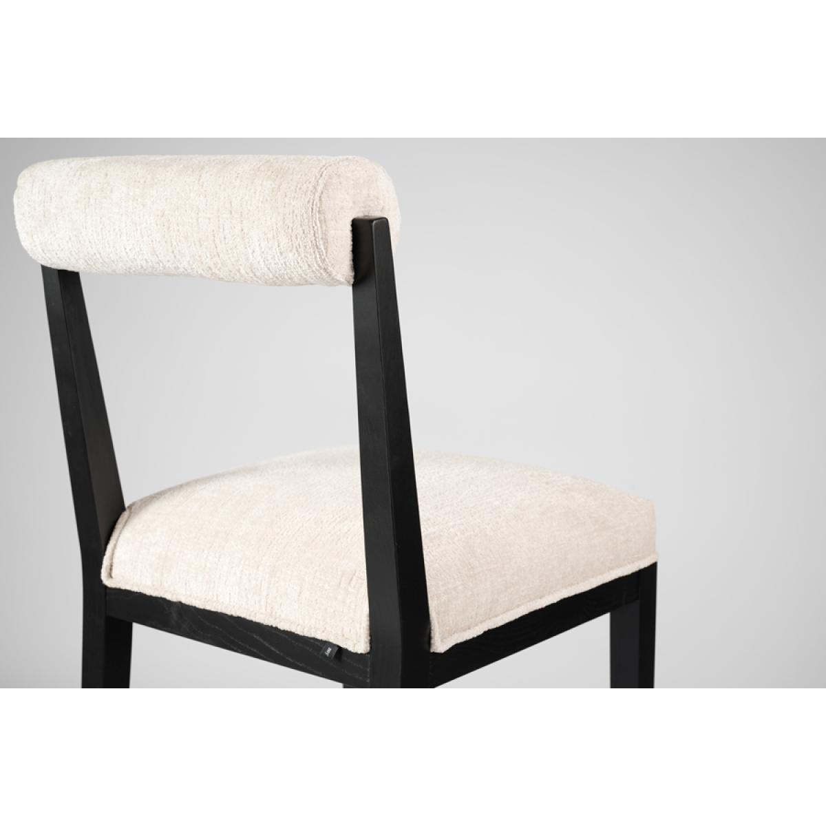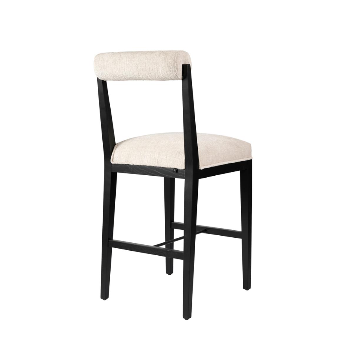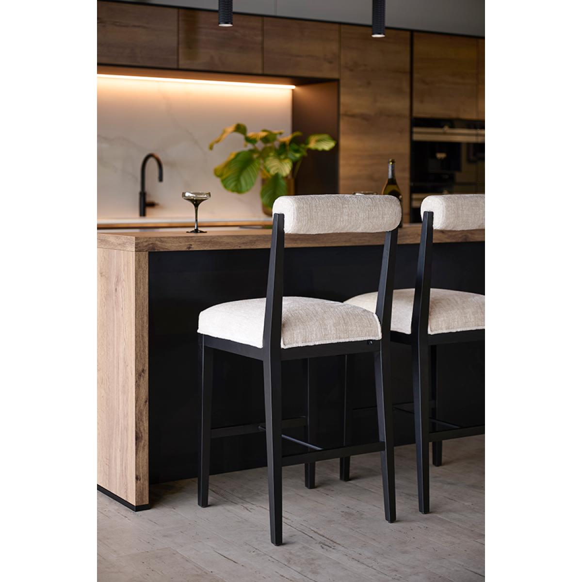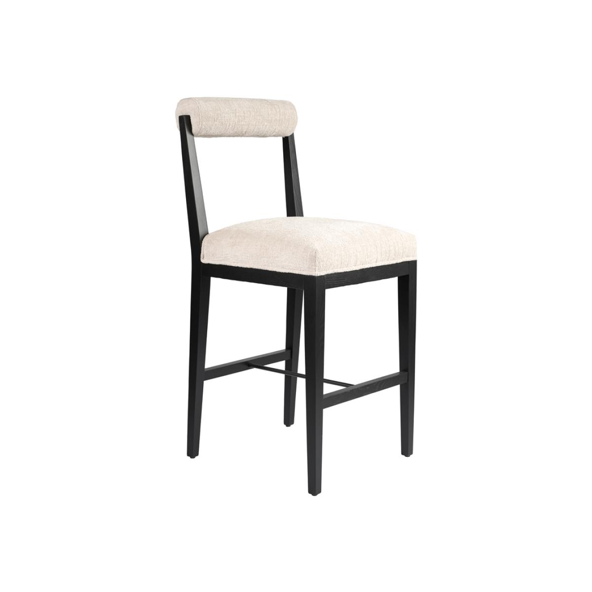 A stylish and modern counter stool with a touch of playful elegance. Comfortable sprung seat with generous deep padding. Bolster pillow backrest. Solid ash frame and legs with matt black stained finish. Upholstered in a soft, tactile, chenille fabric. Supplied fully assembled.