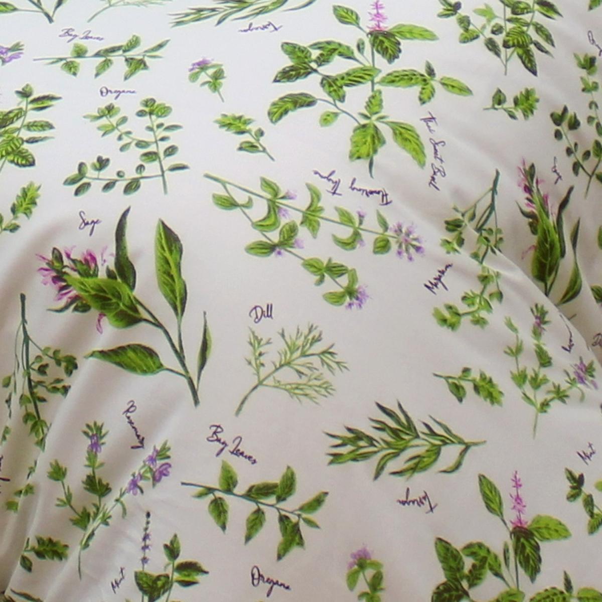 This beautifully printed duvet cover features a variety of herbs such as oregano, dill, sage thyme, rosemary etc. and flowers in shades of green, pink and purple on an off-white ground.