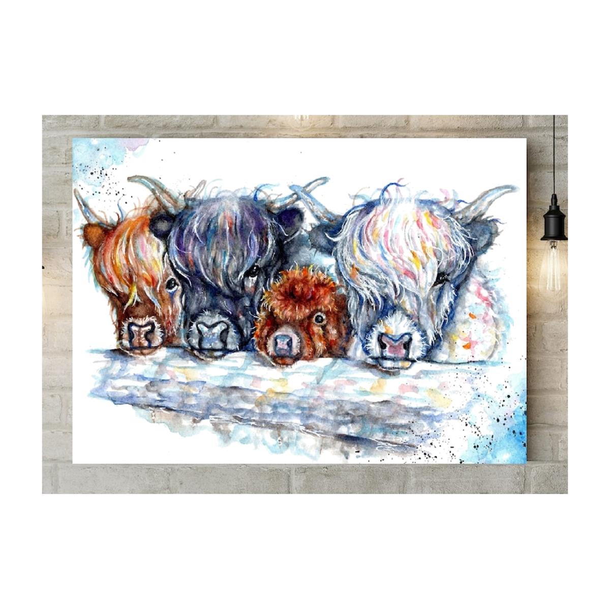 Inspired by the beauty of nature, Be Coventry originally painted this scene of a Herd of Hairy Cows in professional watercolours. Now recreated in print on a box canvas, this artwork will enhance any room in your home. The watercolour design is printed onto 260gsm Matte Polyester canvas, and attached to quality pine timber. The canvas is taped on the rear and is supplied with a wall-hanging kit.
