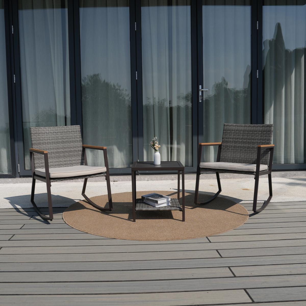 Transform your outdoor space into a peaceful haven with the Hereford Bistro Set. Designed for both style and comfort, this set features an elegant metal slate tabletop, ideal for enjoying a refreshing drink while enhancing the sophistication of your patio or balcony. The two exquisitely crafted synthetic rattan rocking chairs provide a cosy and relaxing spot to unwind in the open air. Built with weather-resistant materials for long-lasting durability, this compact set combines practicality with charm. Whether you're relaxing solo or hosting guests, this bistro set creates a welcoming, serene atmosphere, turning any outdoor area into a tranquil retreat. Make your outdoor space an oasis with this perfect addition.
