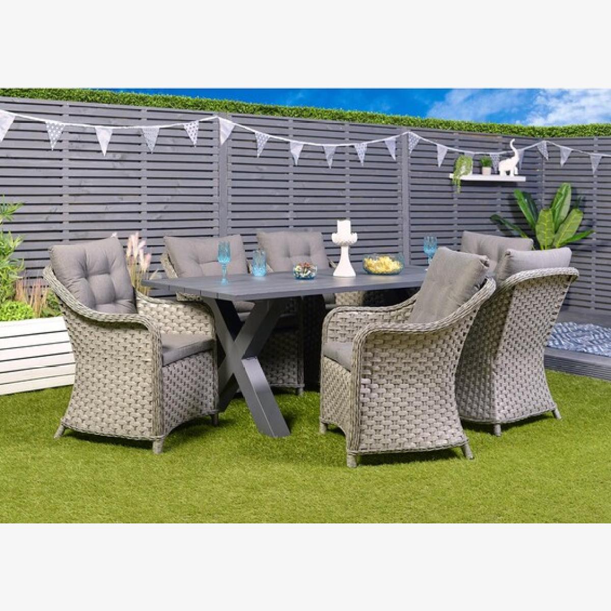 I really like this dining set for its versatile and timeless appeal, making it a great centrepiece for both modern and traditional interiors. The mix of solid and textured finishes adds visual interest without overwhelming the space. It works particularly well in a relaxed, outdoor setting like a garden or patio, but can also complement cosy, country-style kitchens indoors. For styling tips, pair it with neutral or earthy tones to keep the look calm, or add colourful cushions for a pop of vibrancy. Practical ideas include using a table runner or placemats to protect the surface and layered textiles like cushions to enhance comfort and visual appeal. This set's balanced silhouette and durable materials make it a reliable choice for everyday use, blending practical design with inviting charm.