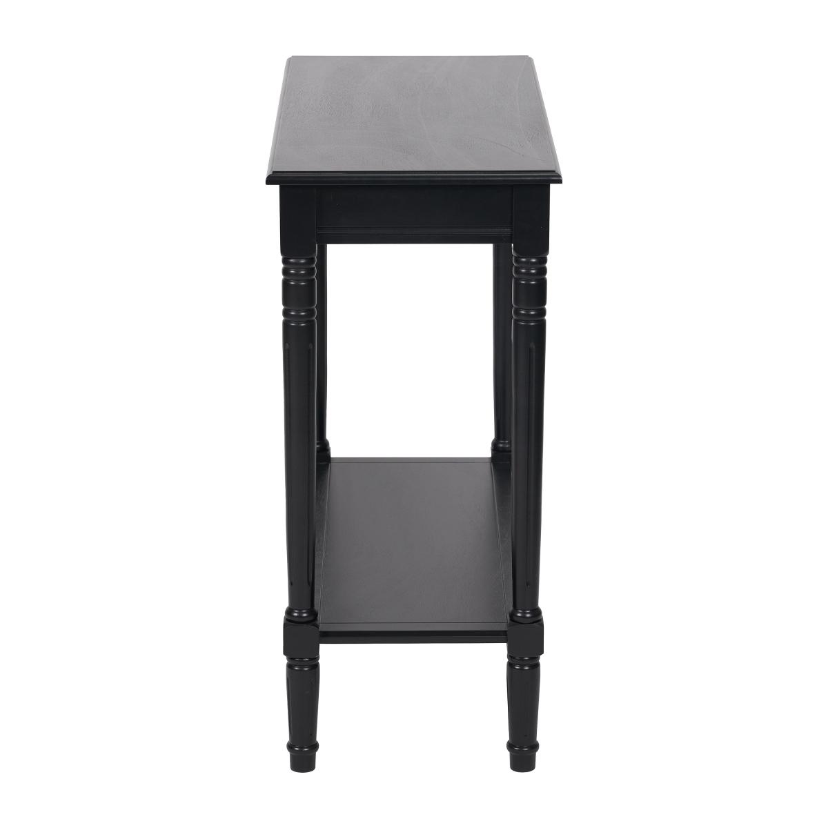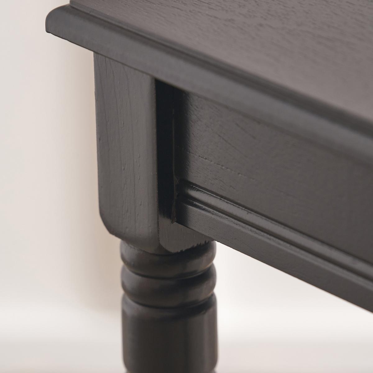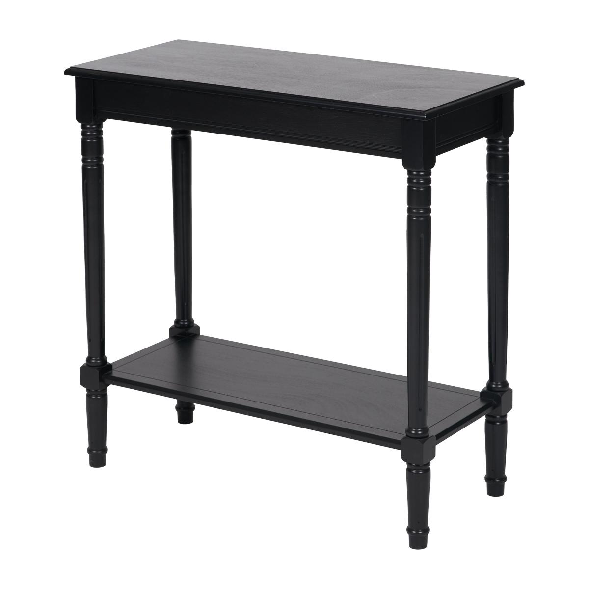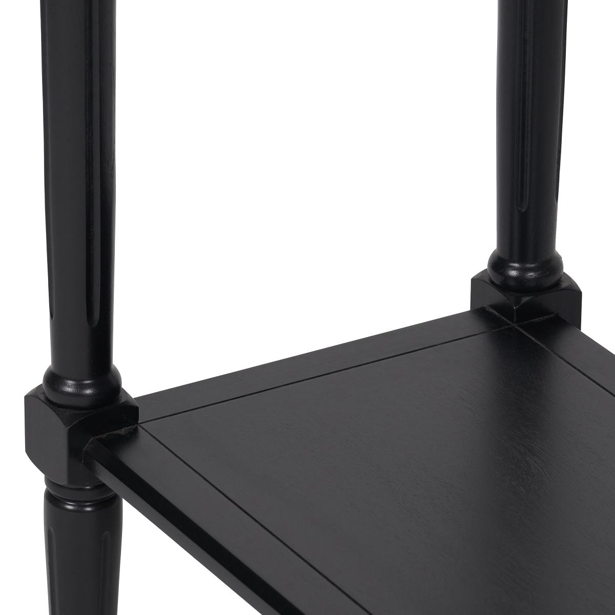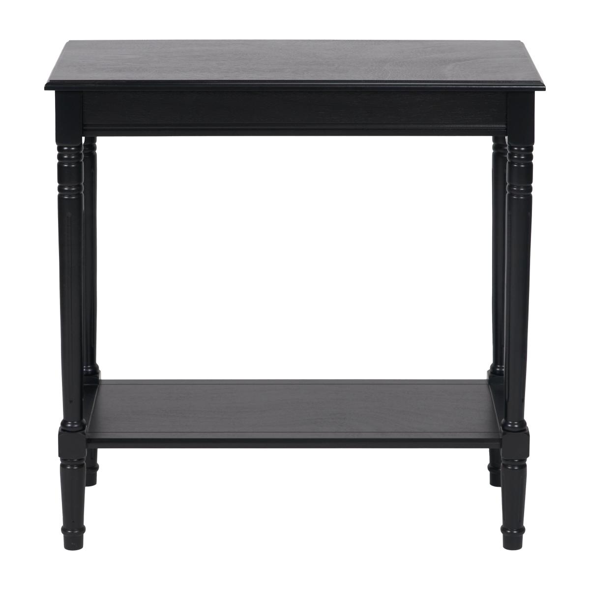 * Pine wood frame* Lacquered finish* Storage options Featuring a lipped top and cut-out detail with an added shelf for extra storage, this side table offers both style and functionality. Made from pine wood lacquered in striking black, this console table provides a practical surface for your decorative items while enhancing the overall aesthetic of your space.