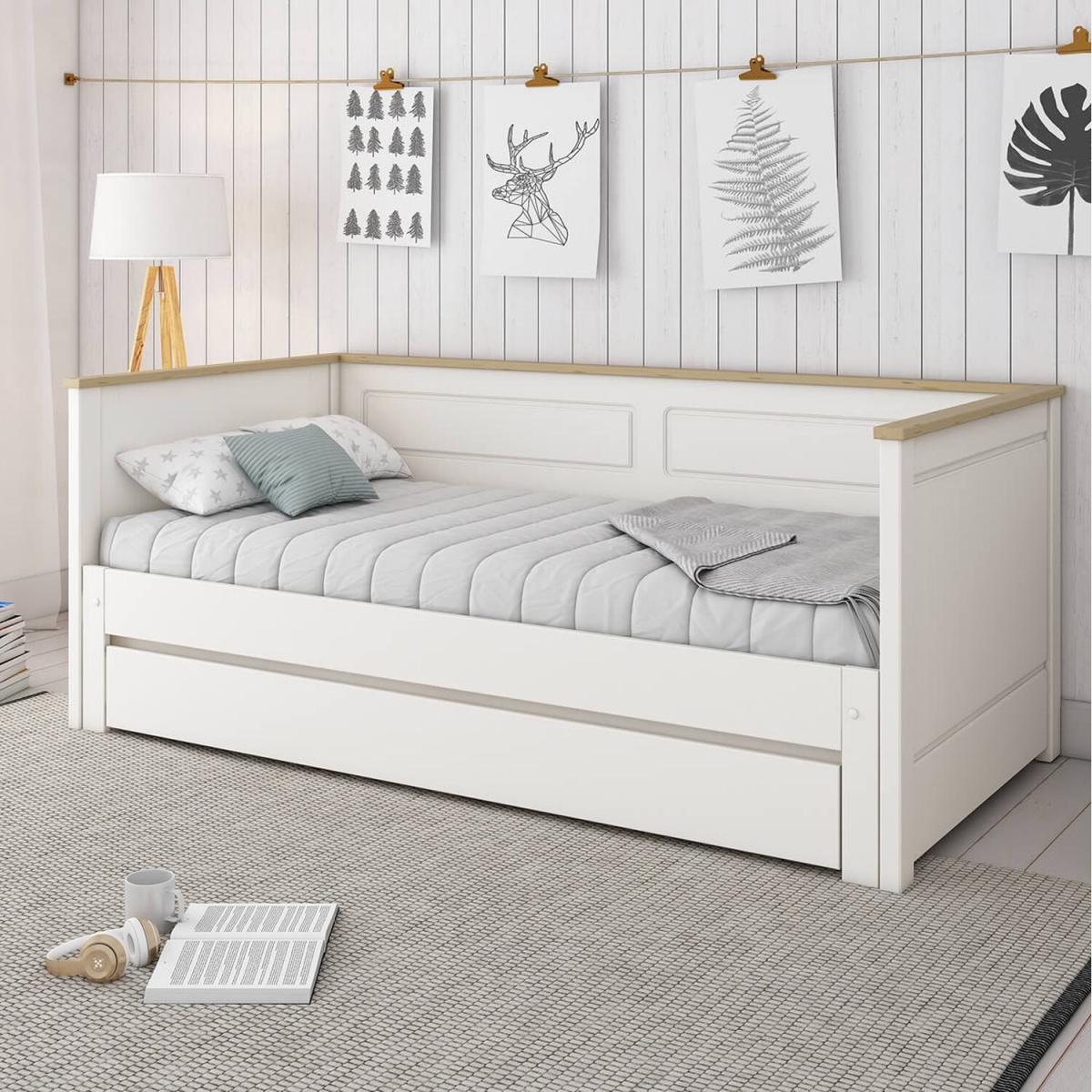 The Kids Avenue Heritage day bed 2 with storage drawer in a traditional design white and oak lacquered finish features a sturdy frame which can be pulled out and extended to fit two 90cm wide by 190cm long mattresses making it a perfect solution for extra guest sleepover space. The Heritage day bed 2 comes with a handy pull out under bed storage drawer a great space saving solution for storing bedding or toys. The cleaver design of both mattresses being stored together on top of the bed frame allows for storage space below. It is recommended by the manufacturer for use with two 10cm tall mattresses to maximise the back rest height remaining or for a higher seating and older children up to 15cm tall mattresses. The Kids Avenue Heritage day bed 2 with storage drawer is made from good quality pine and is suitable for use with two UK single 90 cm wide by 190 cm long mattresses designed to stack on top of each other when the bed frame is in single day bed configuration
