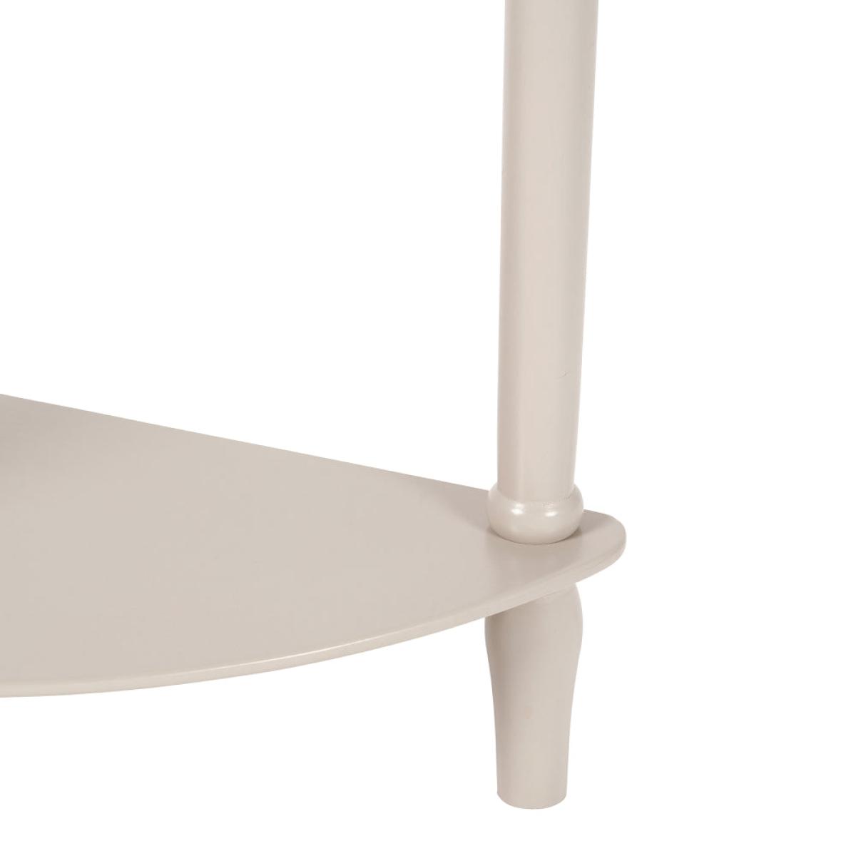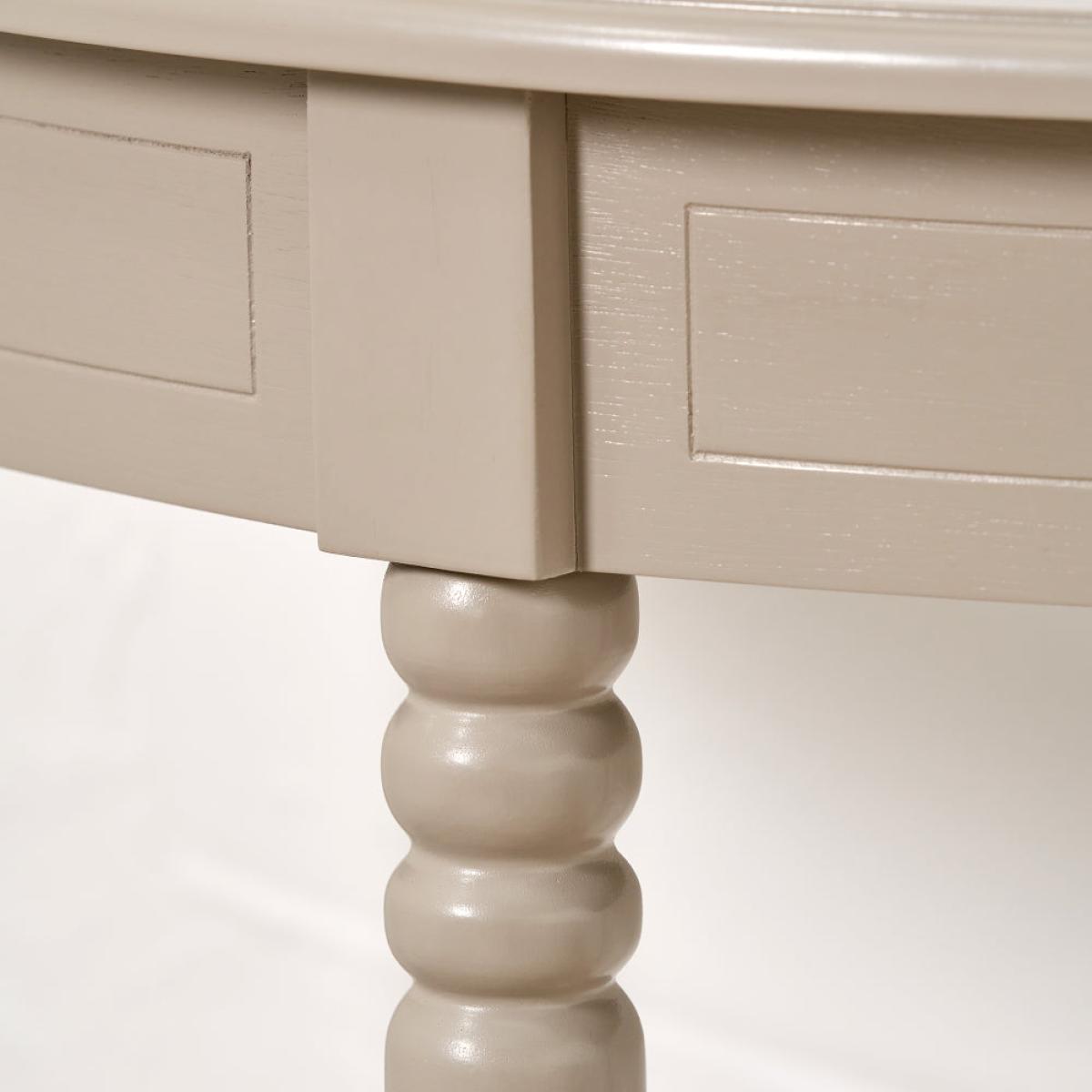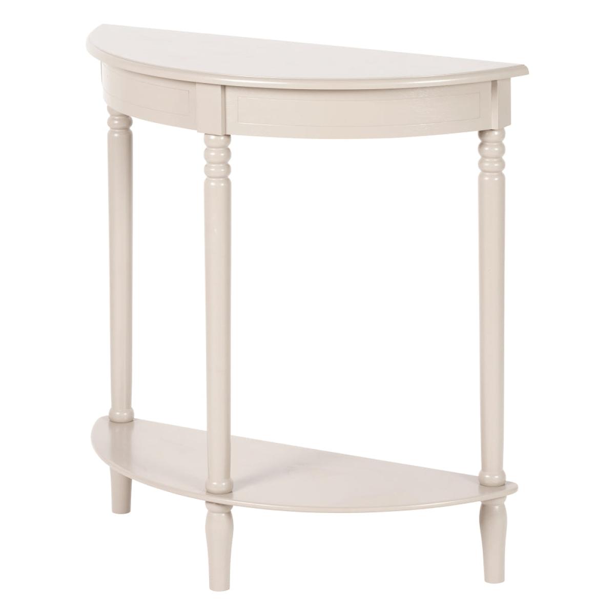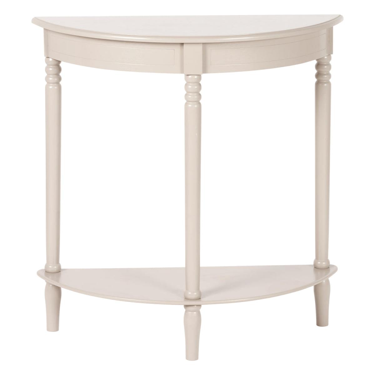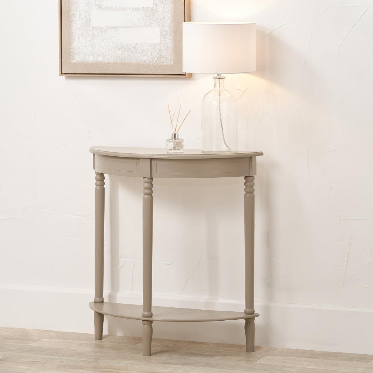 This attractive round half moon console table in a putty coloured finish is a design that will stand the test of time. Its shelf offers further storage in classic style.