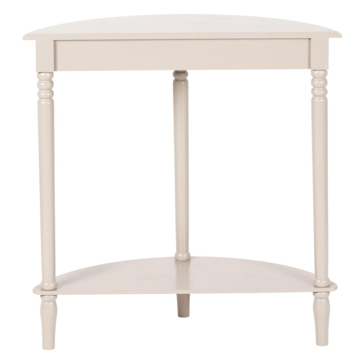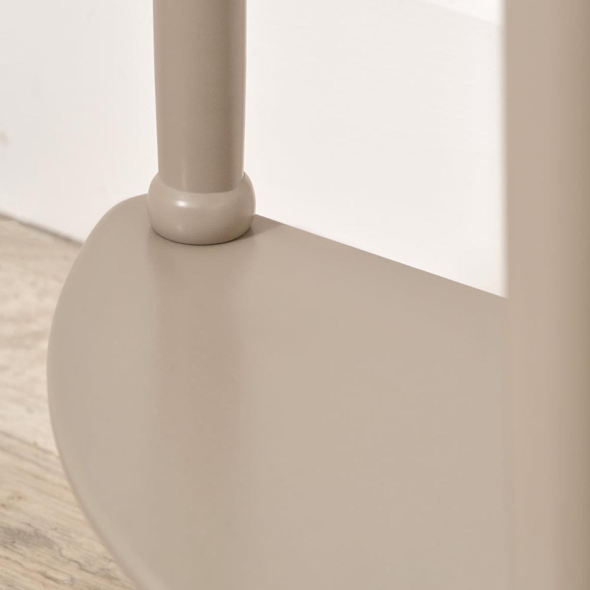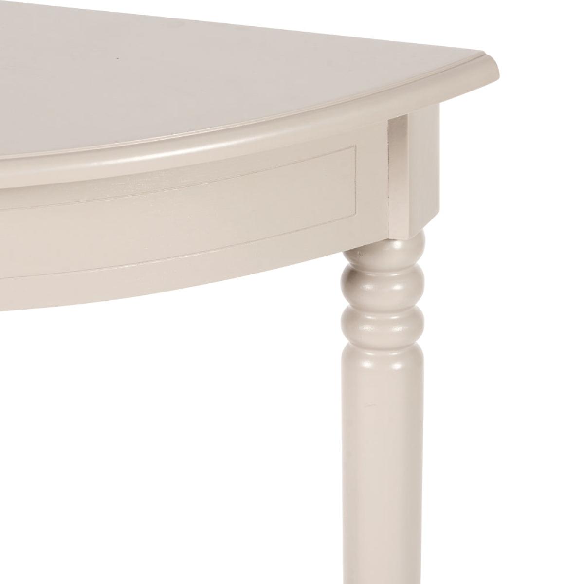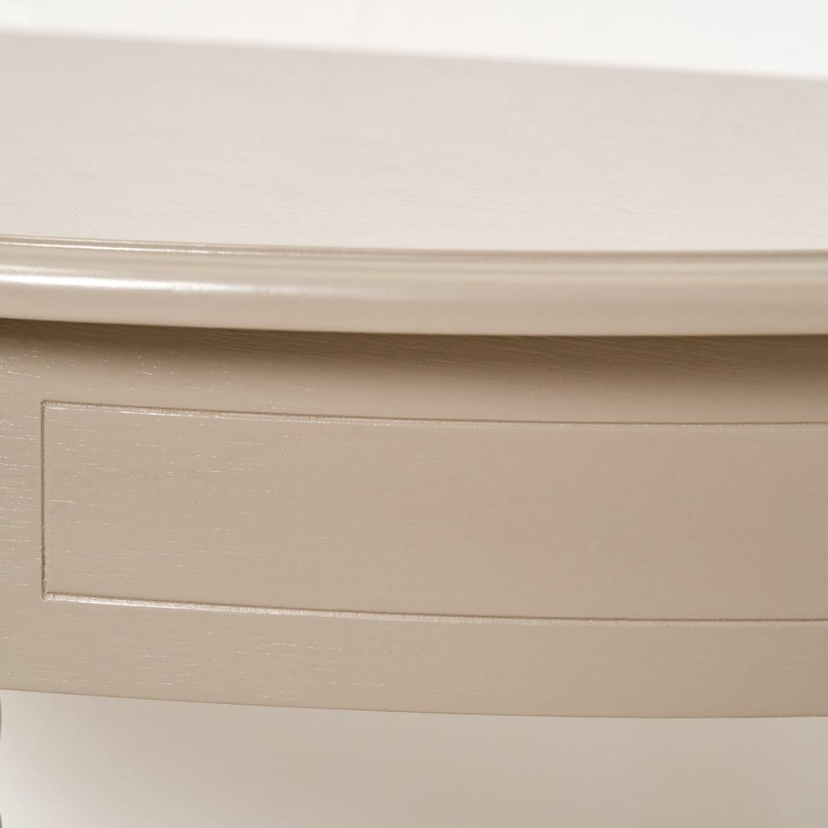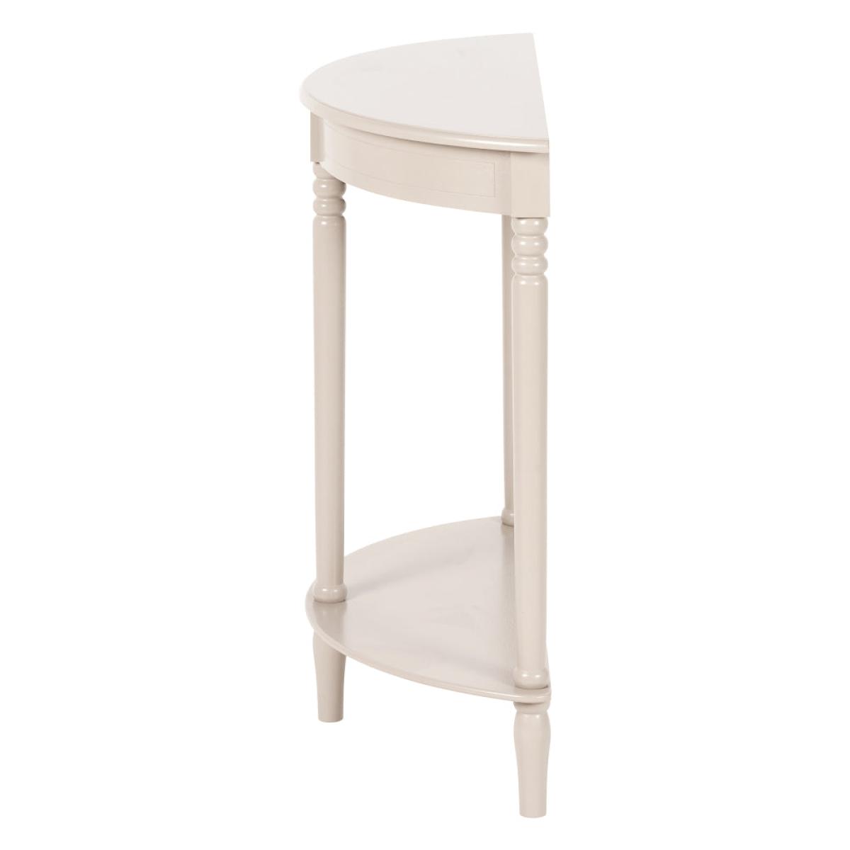 This attractive round half moon console table in a putty coloured finish is a design that will stand the test of time. Its shelf offers further storage in classic style.