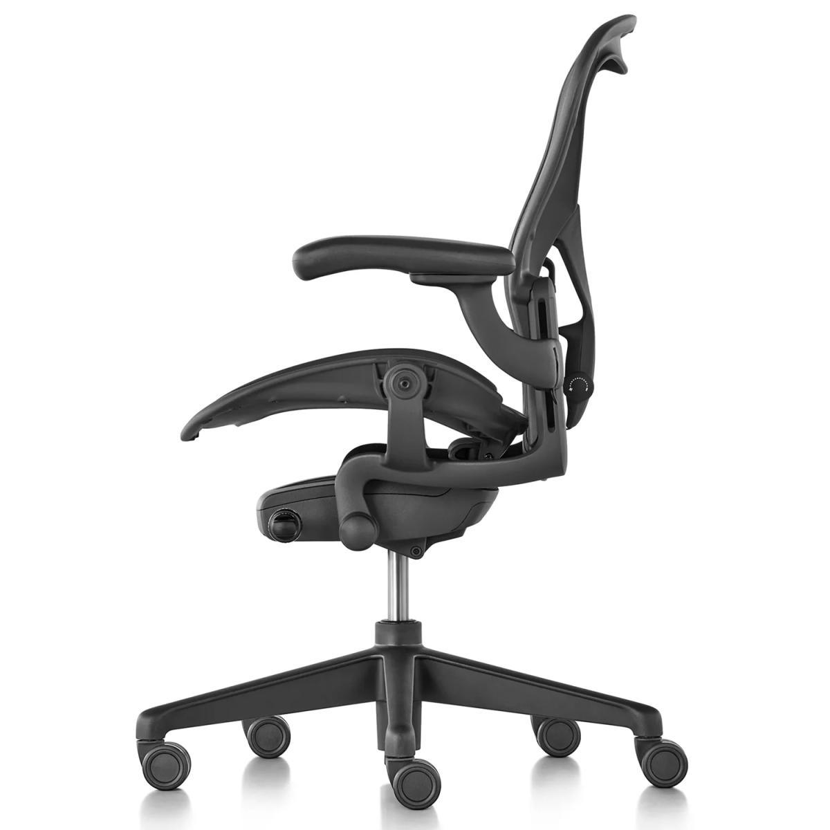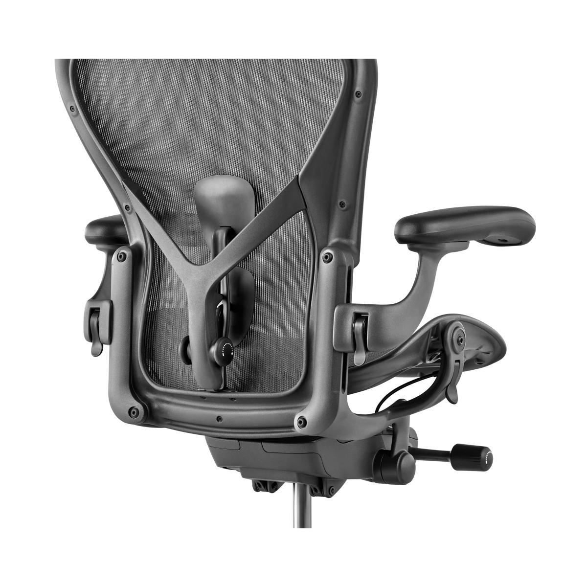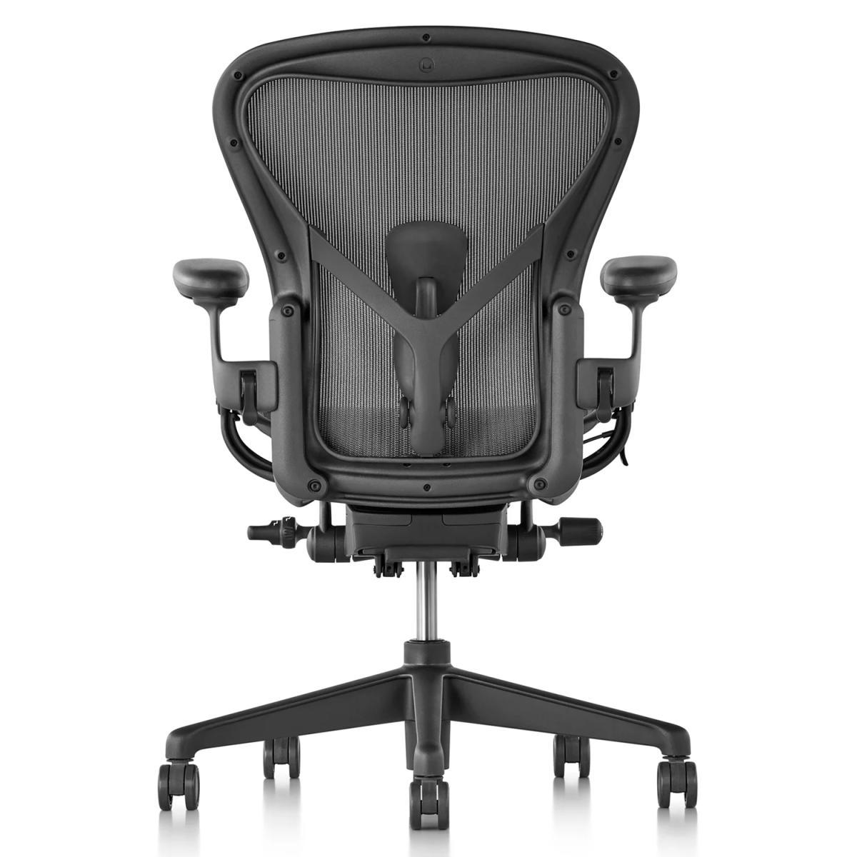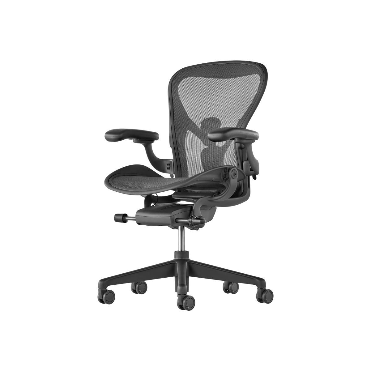 Made in the UK Part of Design Icons Herman Miller's Aeron office chair is designed to meet the needs of today's work, workers and work environments. Co-designed with industrial designer Don Chadwick, and using the latest research around the science of sitting, this innovative and ergonomic chair fully accommodates the widest possible range of activities and postures people adopt while working. The chair back and seat are linked, and tilt simultaneously at different ratios as you lean back to provide responsive support for your lower back. It's also easily adjustable, from intense forward-facing focus to a more relaxed, contemplative recline. Health-positive and cross-performing design Aeron’s innovative 8. Z Pellicle suspension mesh material on the backrest allows air, body heat and water vapour to pass through the seat and back for enhanced and comfortable temperature regulation. The backrest is also designed with eight zones of varying tensions to deliver increased comfort and ergonomic support. Posture Fit SL works with the frame and the 8. Z Pellicle to support the sacrum and lumbar region of the spine to keep you strong while you sit. Adjustable to suit your needs A forward shift in the frame encourages you to sit with a more natural seated posture. The height adjustable seat means you can keep your feet flat on the floor to support your lower back and the chair back can tilt to a position that's comfortable for you. The height and width adjustable arms also reduce muscular effort in your neck and shoulders to minimise pain. Protect your floor While this chair is suitable for the flooring specified, we suggest using floor pads or mats where possible, for added protection to your flooring and furniture. Want to see it first? You may want to see and get a feel for the furniture in one of our shops before ordering. We'll be able to tell you where the range you'd like to view is on display.