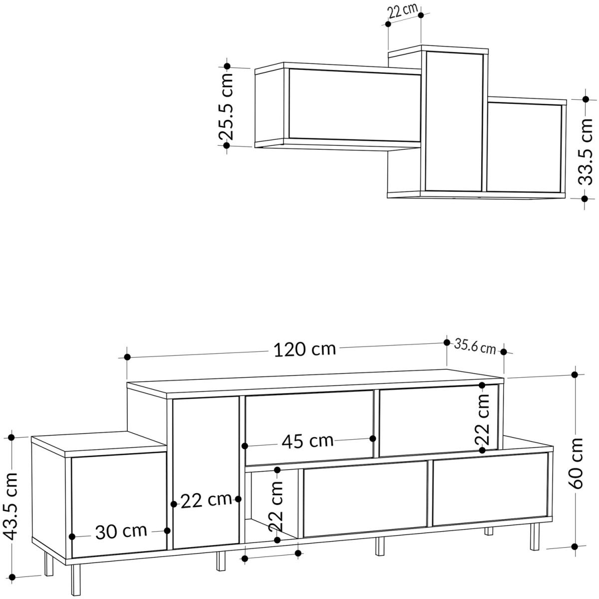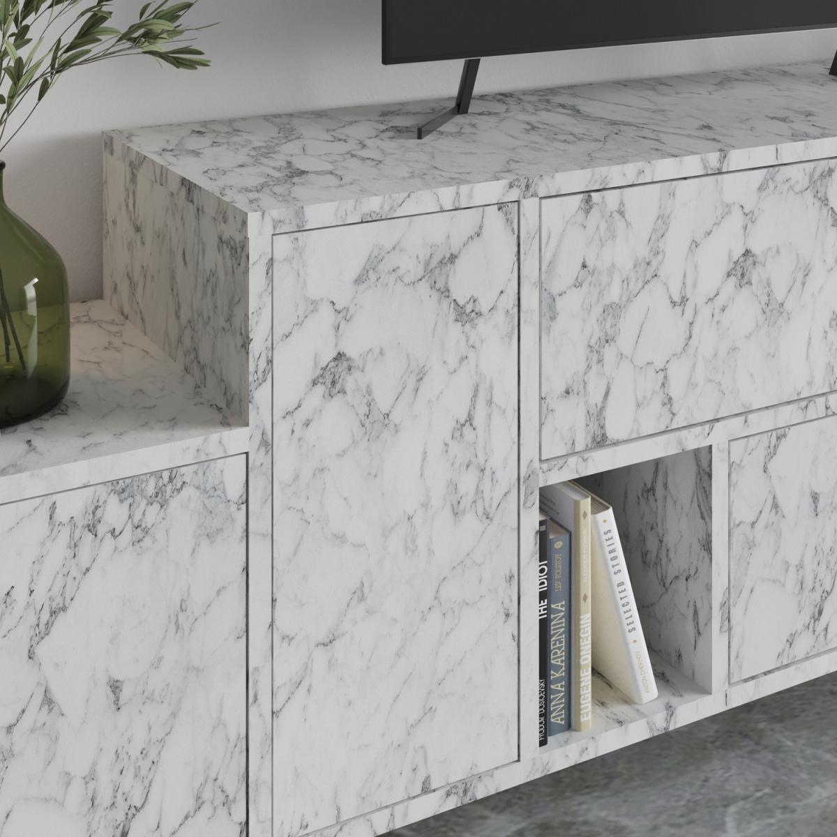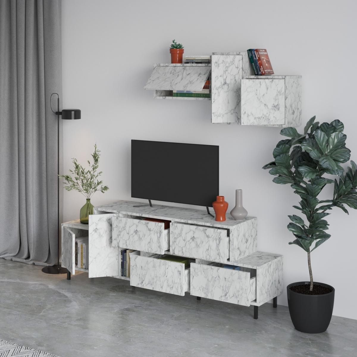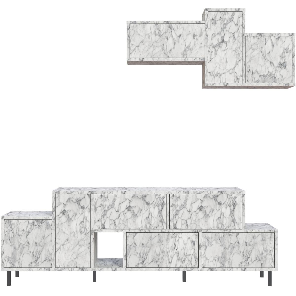 Introducing our stylish and functional TV stand that combines a unique geometric design with durable metal legs. It offers ample storage space with 4 drawers, 2 cabinets, and 1 open compartment on the low board, as well as a separate wall-mounted unit. The marble and wood effect finish creates an elegant look. With a total width of 172 cm and top width of 120 cm, it is suitable for TVs up to 50 inches. Multiple color options are available. This TV stand is a perfect fit for any home design and will become the focal point of your living room. Sturdy and recyclable packaging ensures secure delivery. Assembly is easy with clear instructions. The TV stand is made with high-quality engineered wood and a protective melamine finish. It is easy to maintain and clean,just use a damp cloth. With your creativity, it can be used as an entertainment unit, console, display unit, living room storage, or sideboard. The exceptional design will flawlessly match your current decor. The total width of 172 cm and top width of 120 cm make it suitable for TVs up to 50 inches.