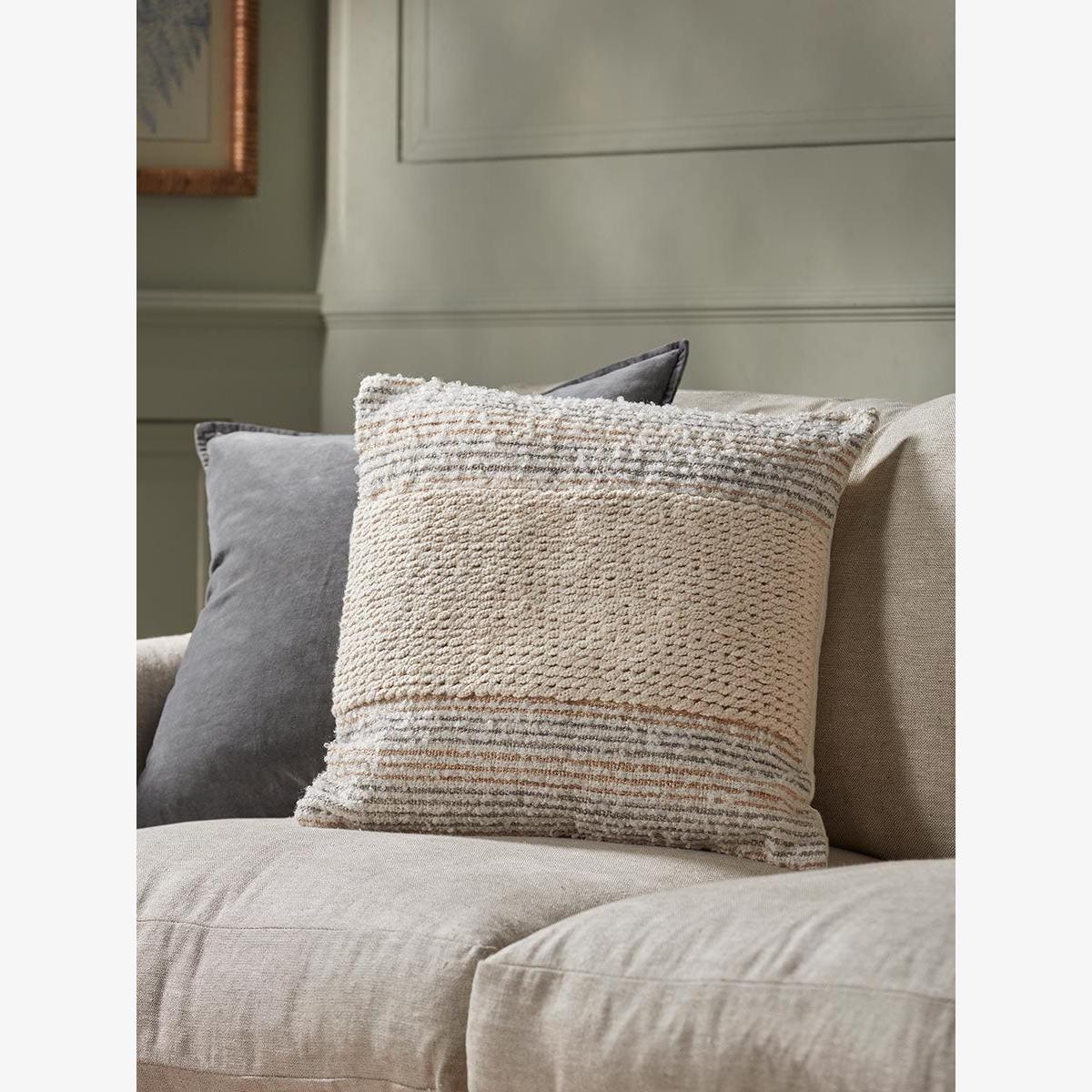 Enrich your home with the soft and welcoming tones of our Hernals Cushion. A chunky knit centre is contrasted by delicate earthy and blue stripes, adding a sense of calm to your space. Place on your armchair or sofa for a tranquil and restful space for you to relax.