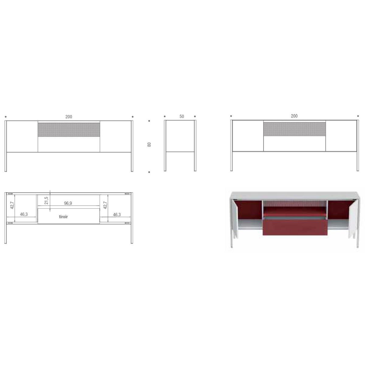 System of storage units with doors, drawers and open compartments for the different domestic, office and public environment. Collection composed of different storage units in terms of dimensional combinations and frontal equipment: - Low L200 P50 H80 cm. Available with 4 doors or 2 doors, a single drawer and an open compartment or two doors and a double drawer, - Medium L151 P50 H116 cm. Available with 3 doors or 3 doors and an open compartment. - High L103 P50 H152 cm. Available either with 2 doors or 2 doors and an open compartment. The open compartment is always provided with a perforated backrest.