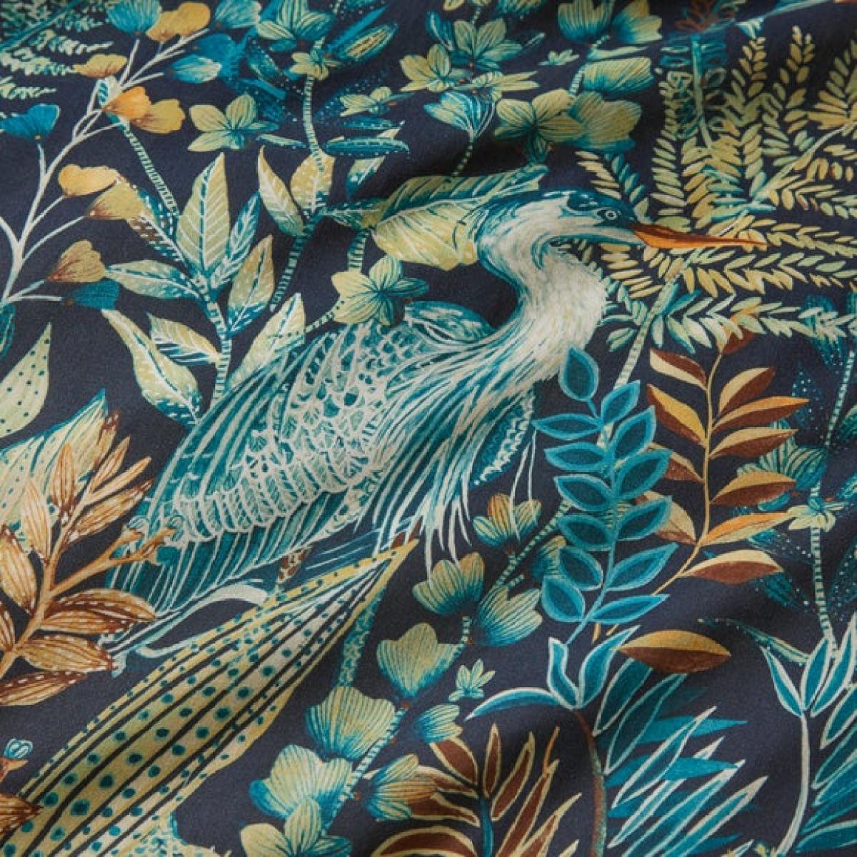 * Gentle but durable polycotton composition * Elegant Arts and Crafts inspired Design * Button closure * Corresponding items available * Machine Washable Step into a tranquil oasis with the Heron Retreat Bedding Set. Showcasing majestic herons and lush leaves in jewel-toned detail, this elegant print on a navy backdrop makes a rich visual statement. The polycotton fabric offers both softness and resilience, blending beauty and practicality in perfect harmony. This collection is verified by OEKO-TEX® and independently tested for harmful substances as well as manufactured using sustainable processes under socially responsible working conditions. MADE IN GREEN by OEKO-TEX® is a unique product label to trace the countries and production facilities - search the product label for more information.