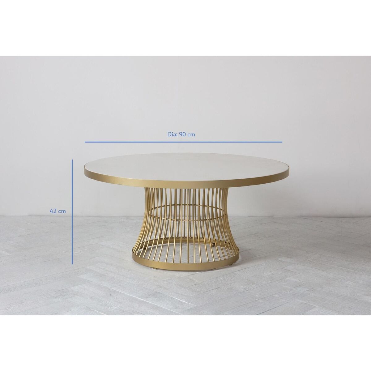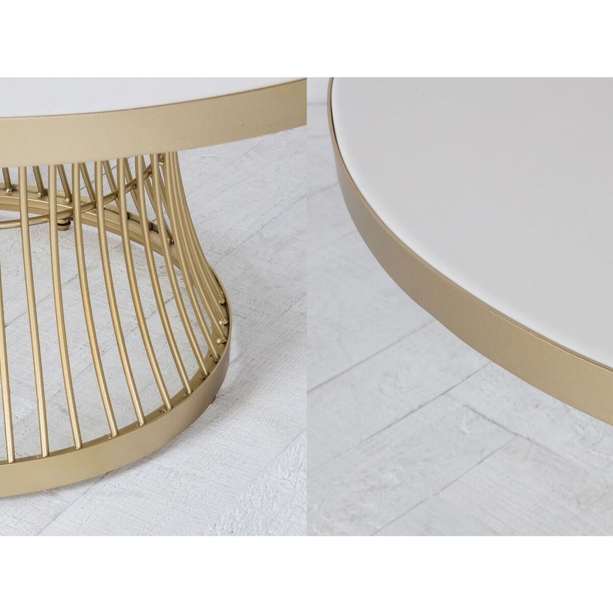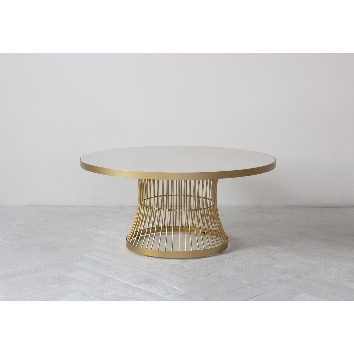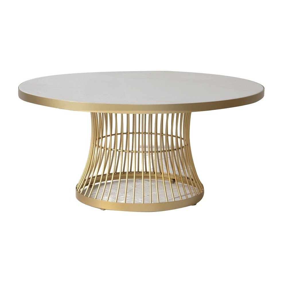 The Heron is a contemporary art deco coffee table with champagne cage-style base and white glass table top.