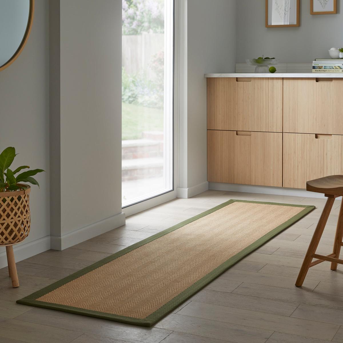 * 100% Jute base* Hard-wearing qualities* Slip-resistant latex backing* Natural jute and cotton border Add simple style to your space with the Herringbone Border Runner. Pairing natural jute with a cotton border for a timeless, minimalist look in your space. With a 100% jute base, the Herringbone Border Runner is ideal for busy zones due to its hard-wearing qualities and slip-resistant latex backing. We love using the Herringbone Border Runner to create a welcoming layer on hallway floors, or to add a layer of comfort to hard-floors in kitchens. Safe for use on a heated floor. Use a suction type vacuum - rotating brushes may damage this rug. Re-roll your rug pile out for 24 hours to reduce curling. An anti-slip backing is included on this rug. Blot spills immediately with a clean, dry white cloth. Do not rub. Colour may vary as this product is made from natural fibres. Please do not place this rug near an open fire. Please do not leave children or infants unattended.