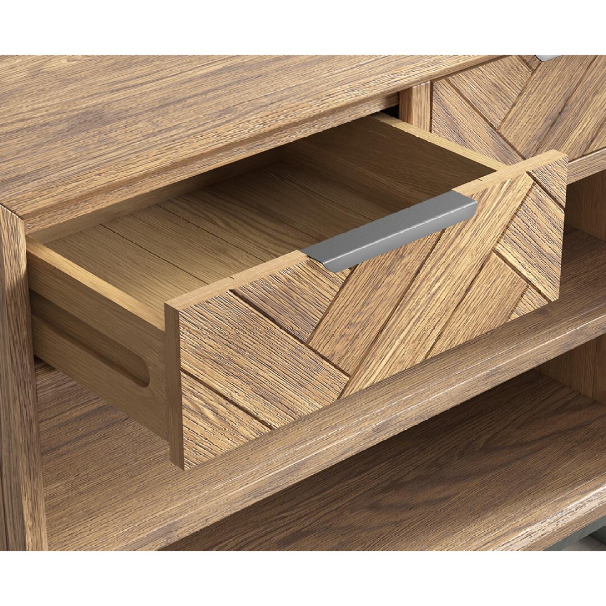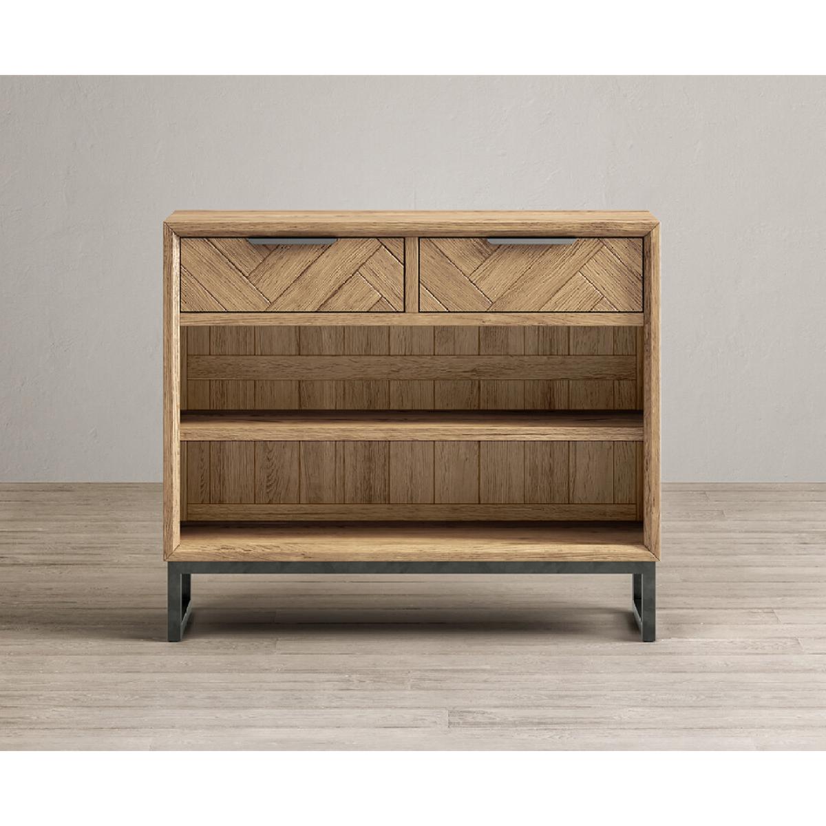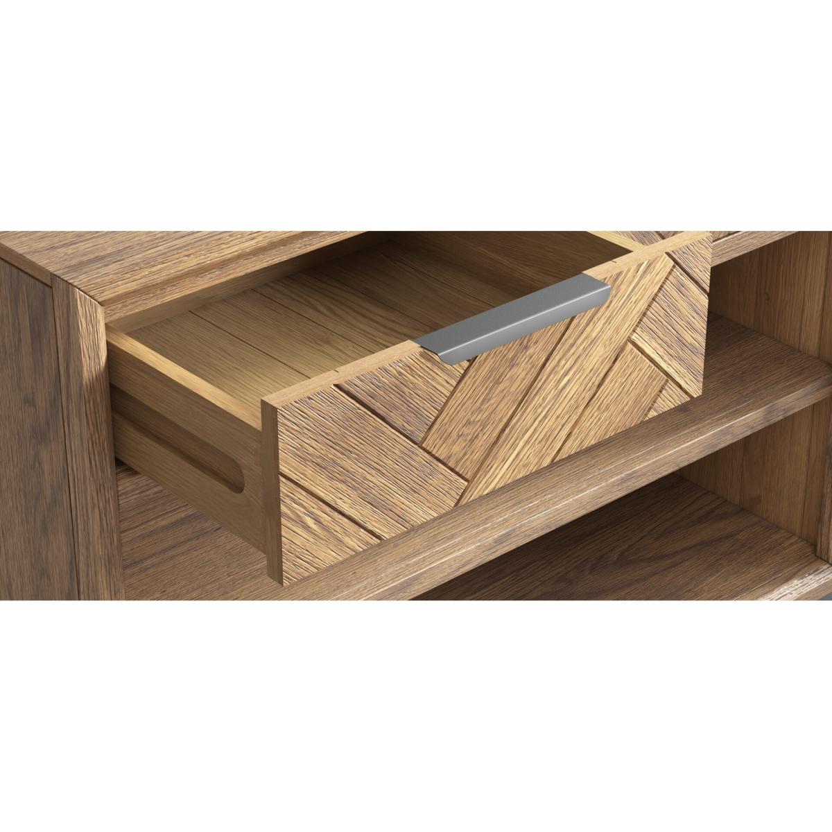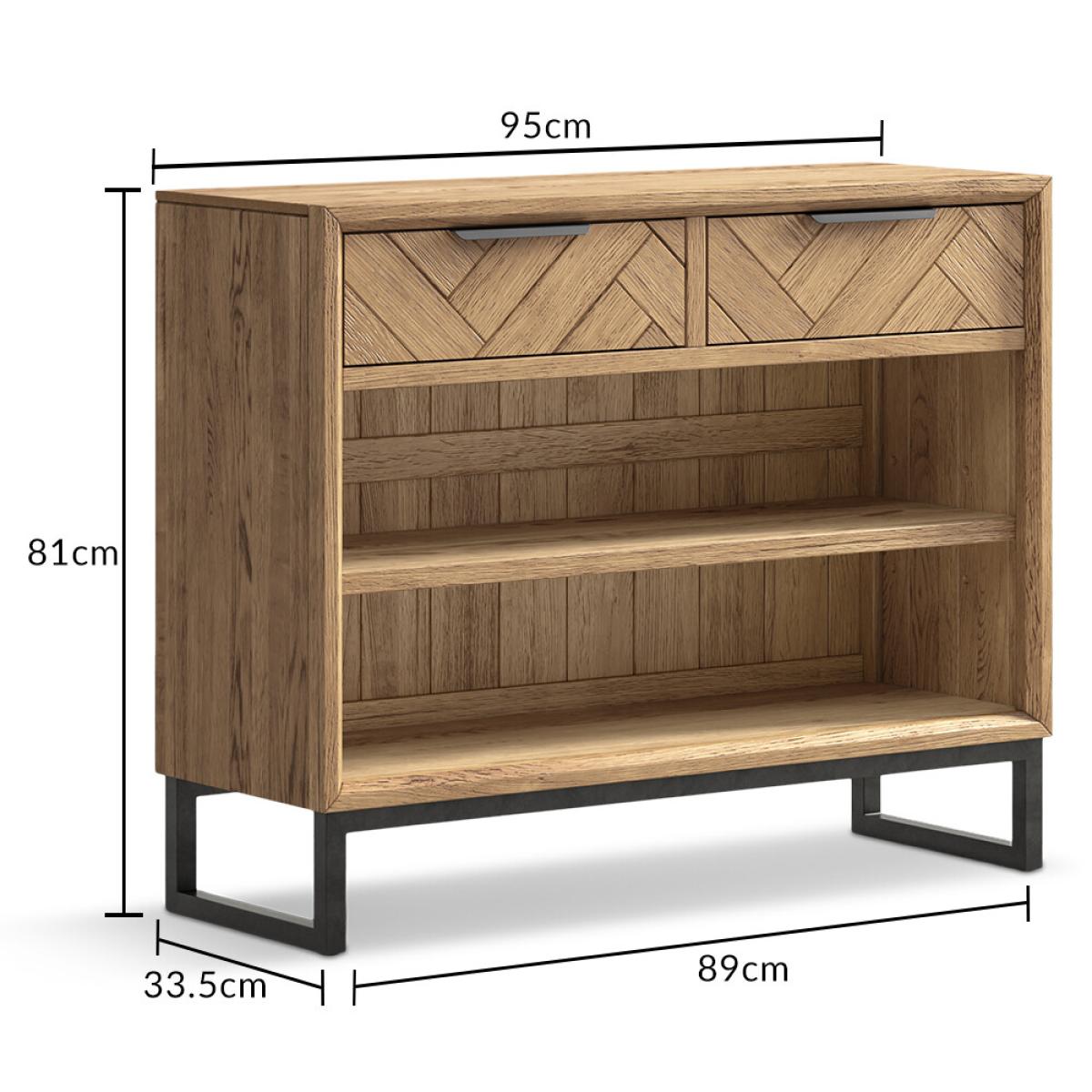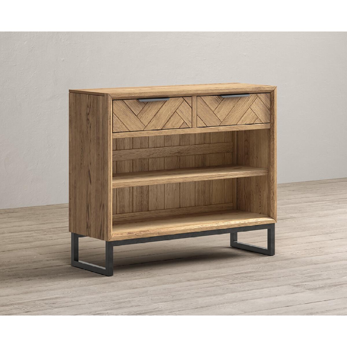 The Herringbone Solid Oak Console Table is crafted from 100% solid oak with a brushed Herringbone design, shelves and dovetail drawers.