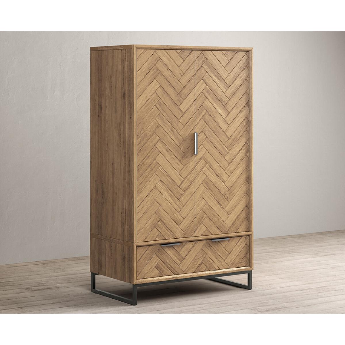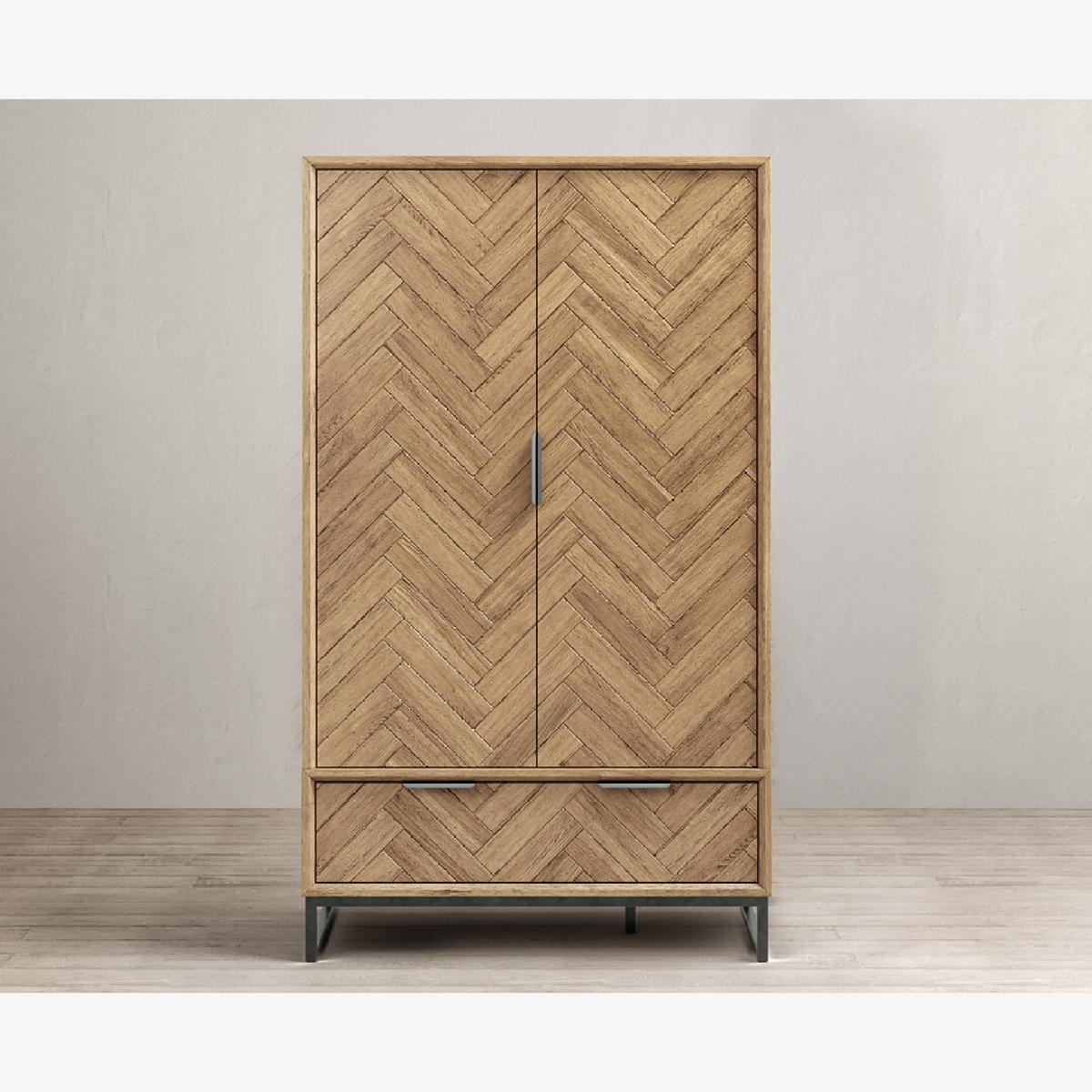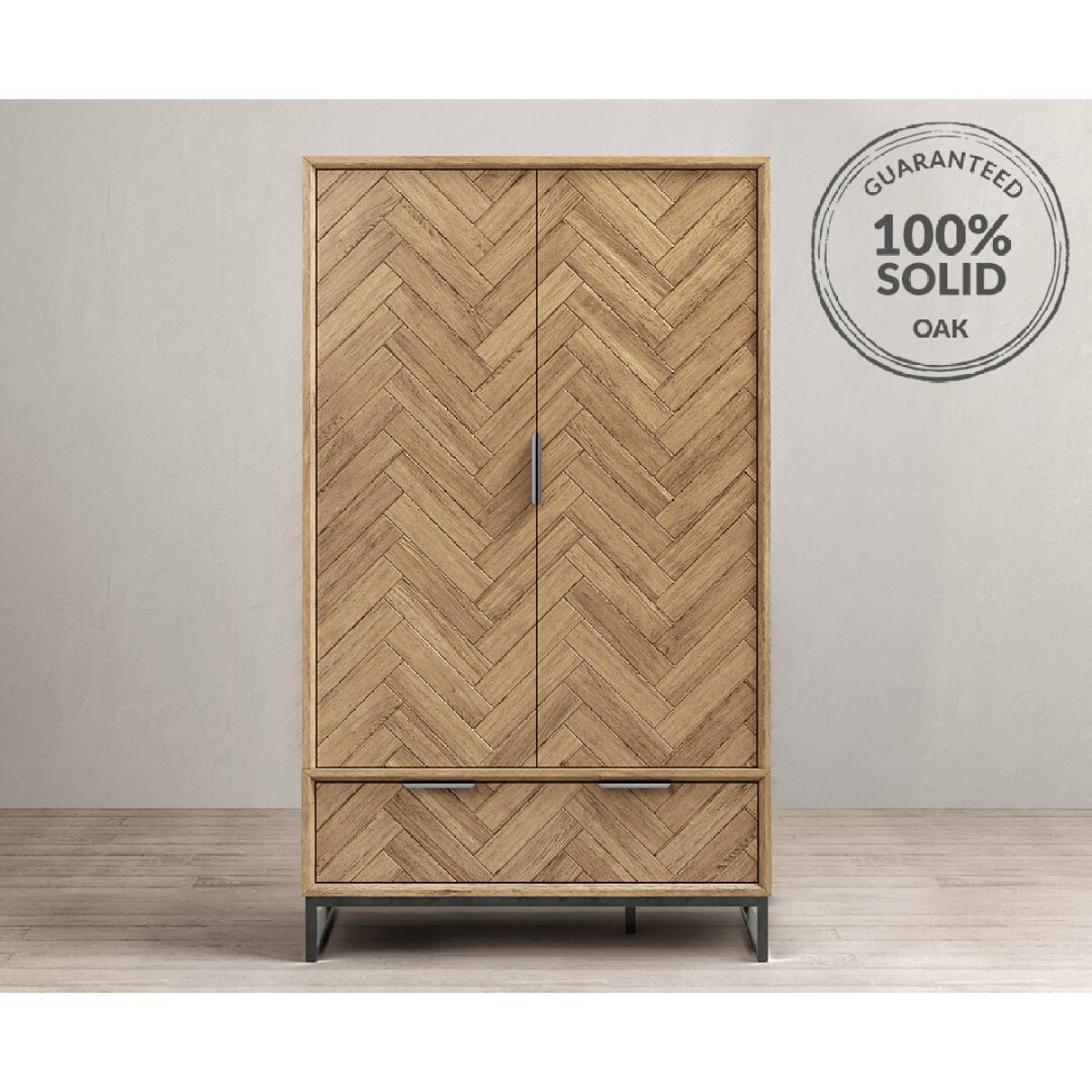 The Herringbone Solid Oak Double Wardrobe is a 100% solid oak double wardrobe with a Herringbone design, complete with a dovetail drawer.