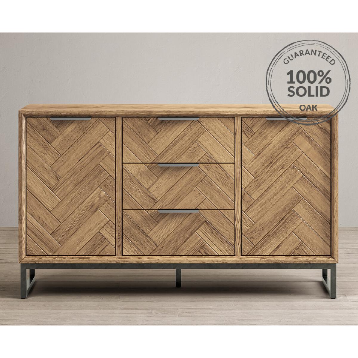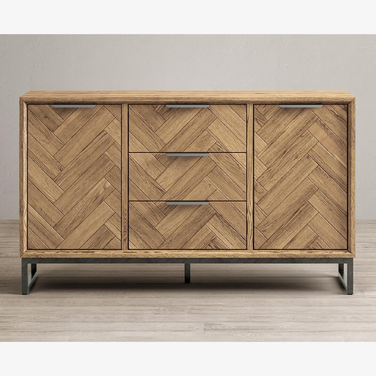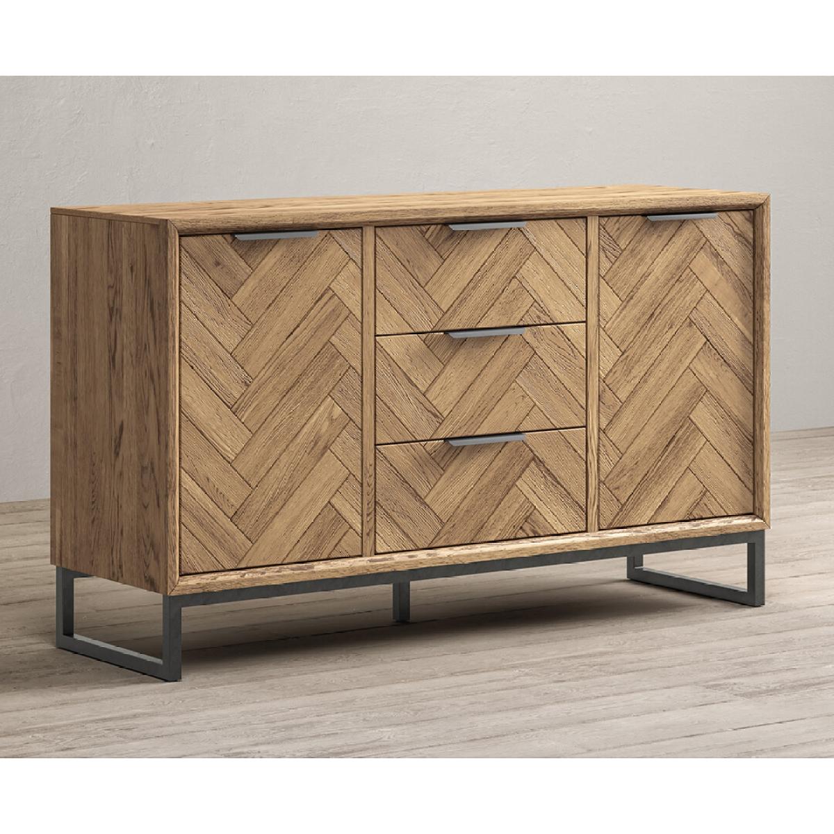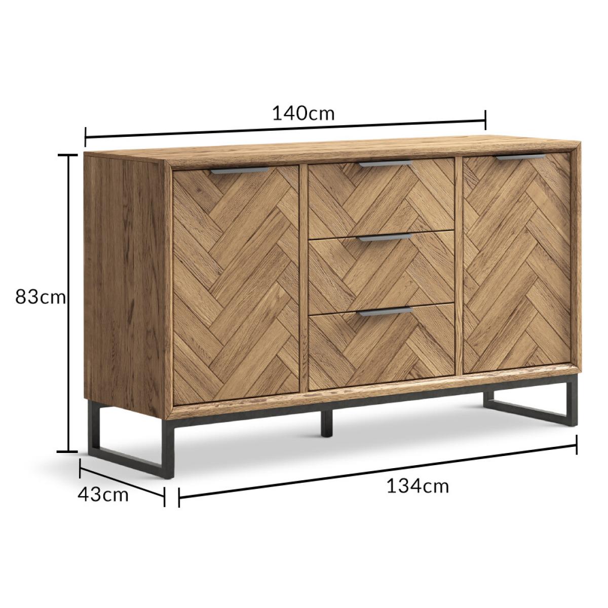 The Herringbone Solid Oak Large Sideboard is crafted from 100% solid oak with a brushed Herringbone finish and features two cupboards and dovetail drawers.