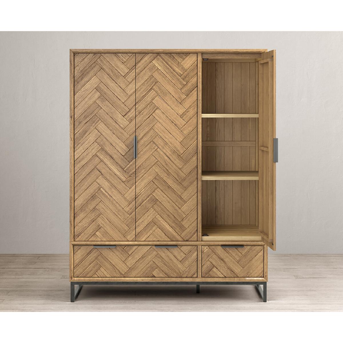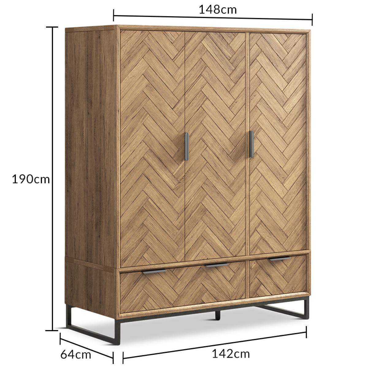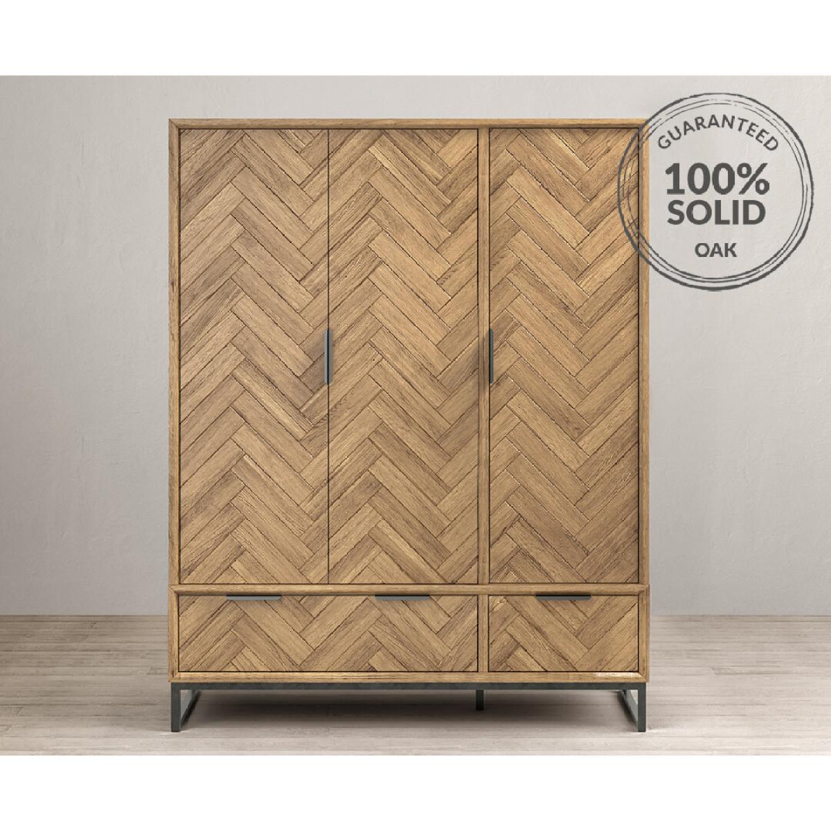 The Herringbone Solid Oak Triple Wardrobe is a large solid oak wardrobe with plenty of hanging space, removable shelves and dovetail drawers.