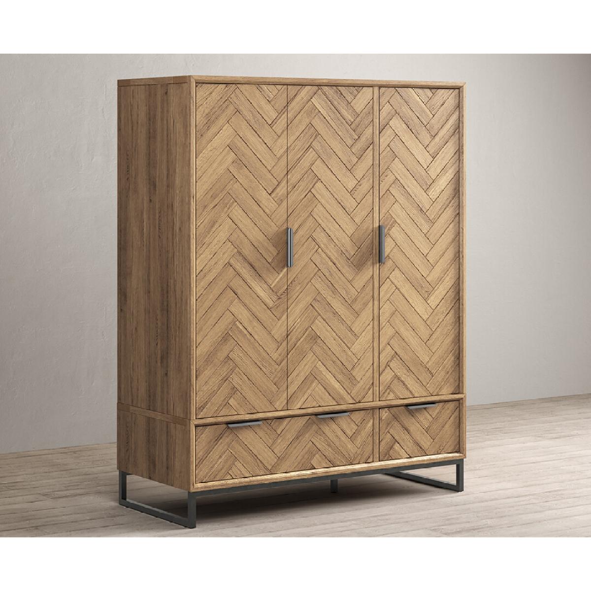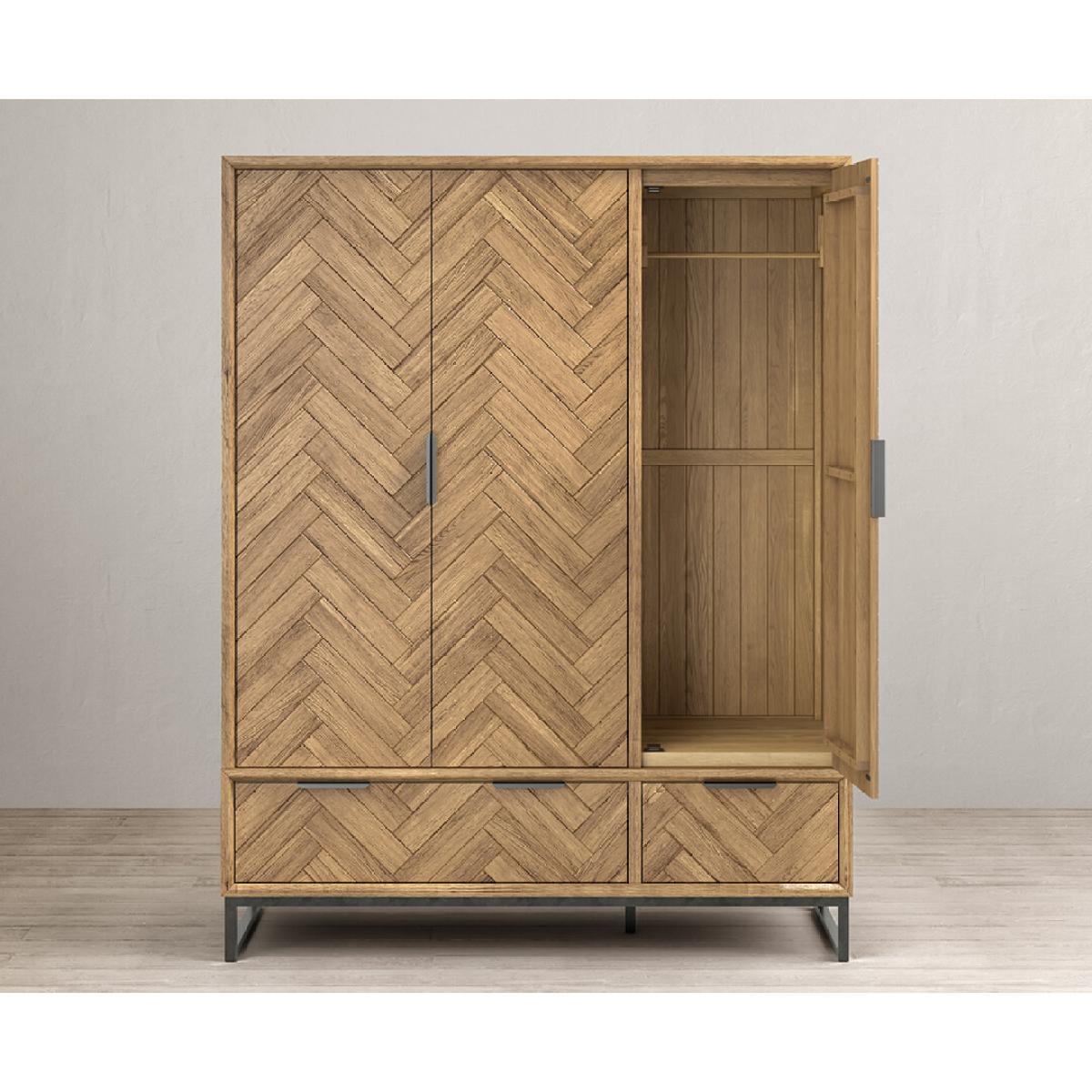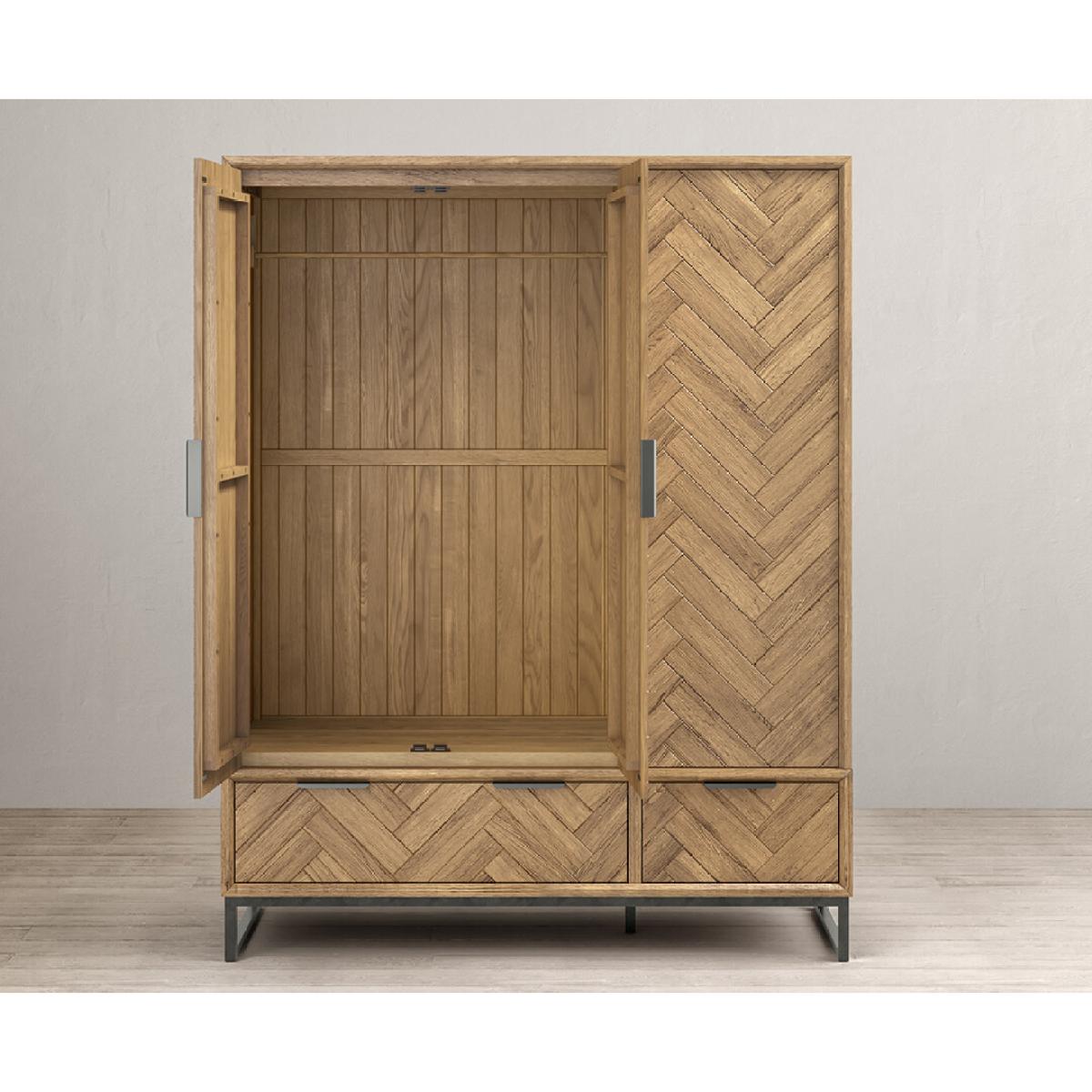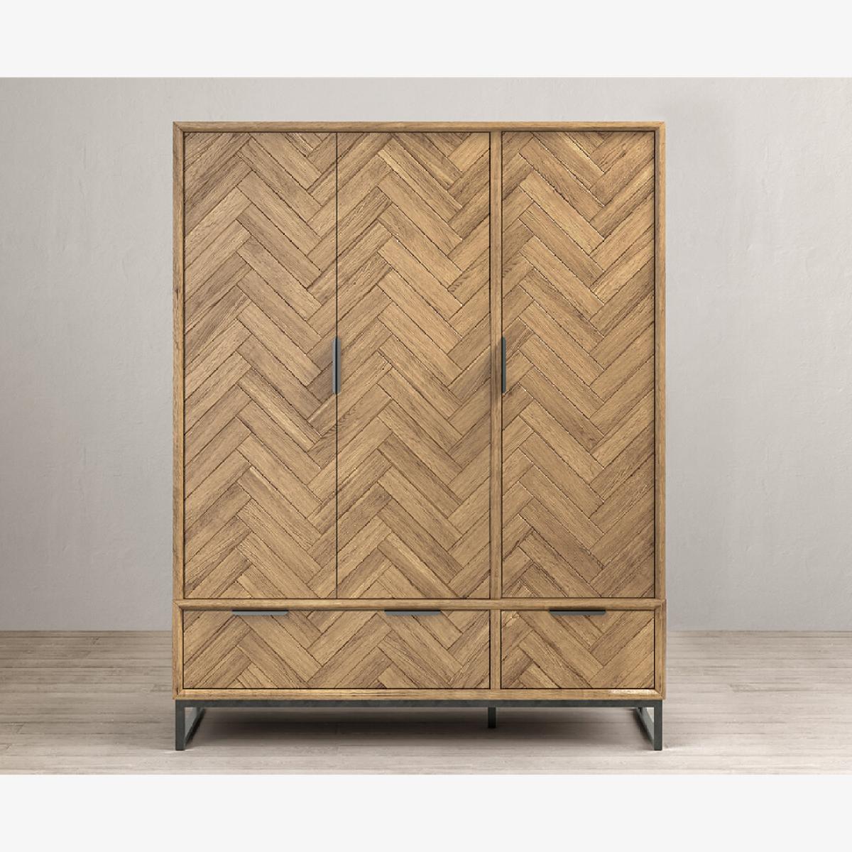 The Herringbone Solid Oak Triple Wardrobe is a large solid oak wardrobe with plenty of hanging space, removable shelves and dovetail drawers.