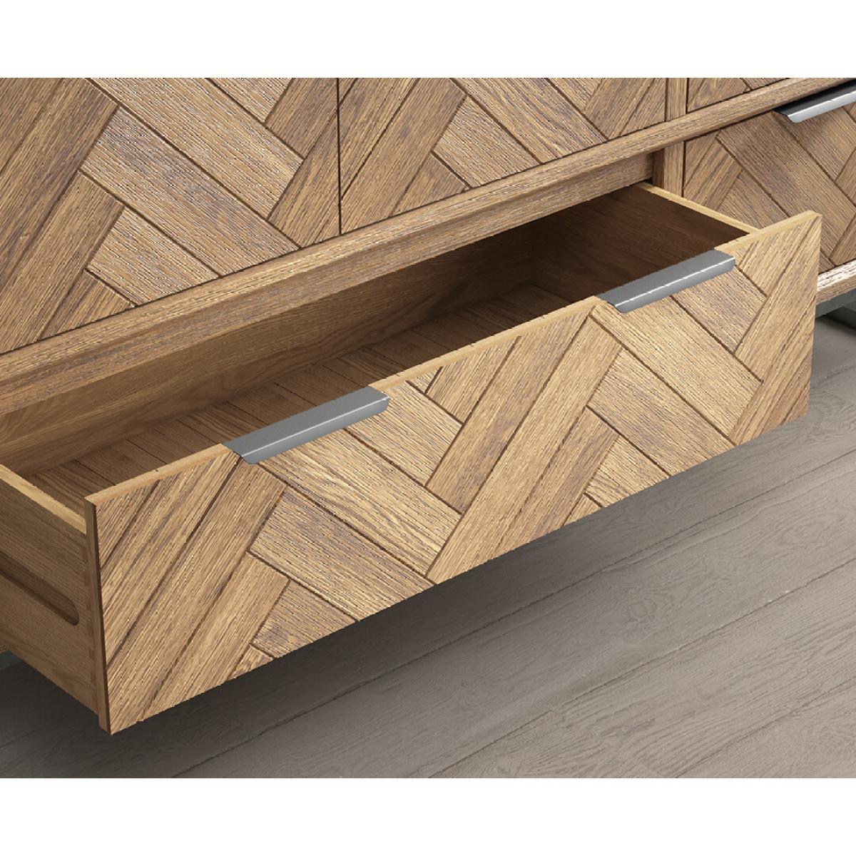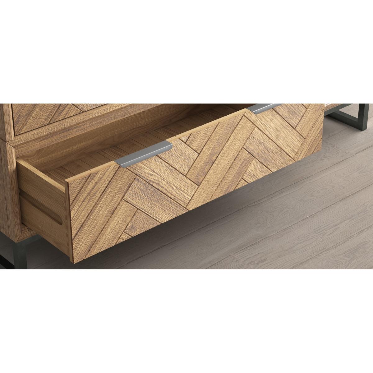 I always reach for this herringbone oak wardrobe when I want solid storage with a touch of pattern. The natural oak grain and metal legs slot straight into Scandi, contemporary or industrial schemes, and its triple doors plus lower drawers mean you can separate hanging space, folded clothes and accessories without extra units. For styling, keep the top surface simple - perhaps a round mirror, a ceramic vase and a pair of woven baskets - and line the drawers with linen organisers to stop small items getting lost. Pair it with muted greys or an off-white wall and a sisal rug to let the wood’s warmth really stand out.