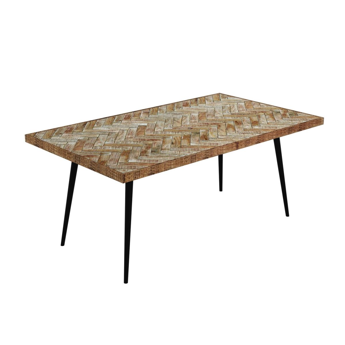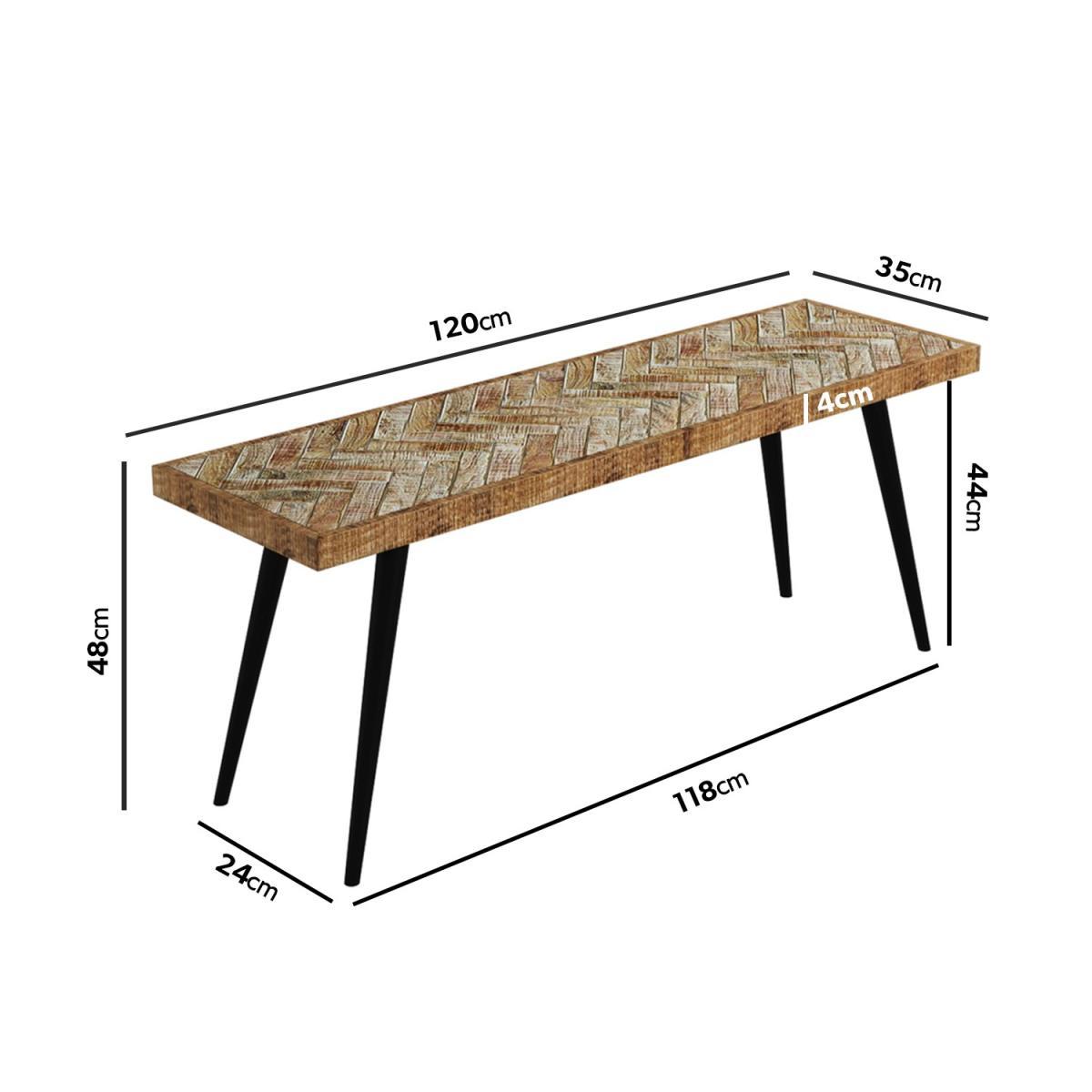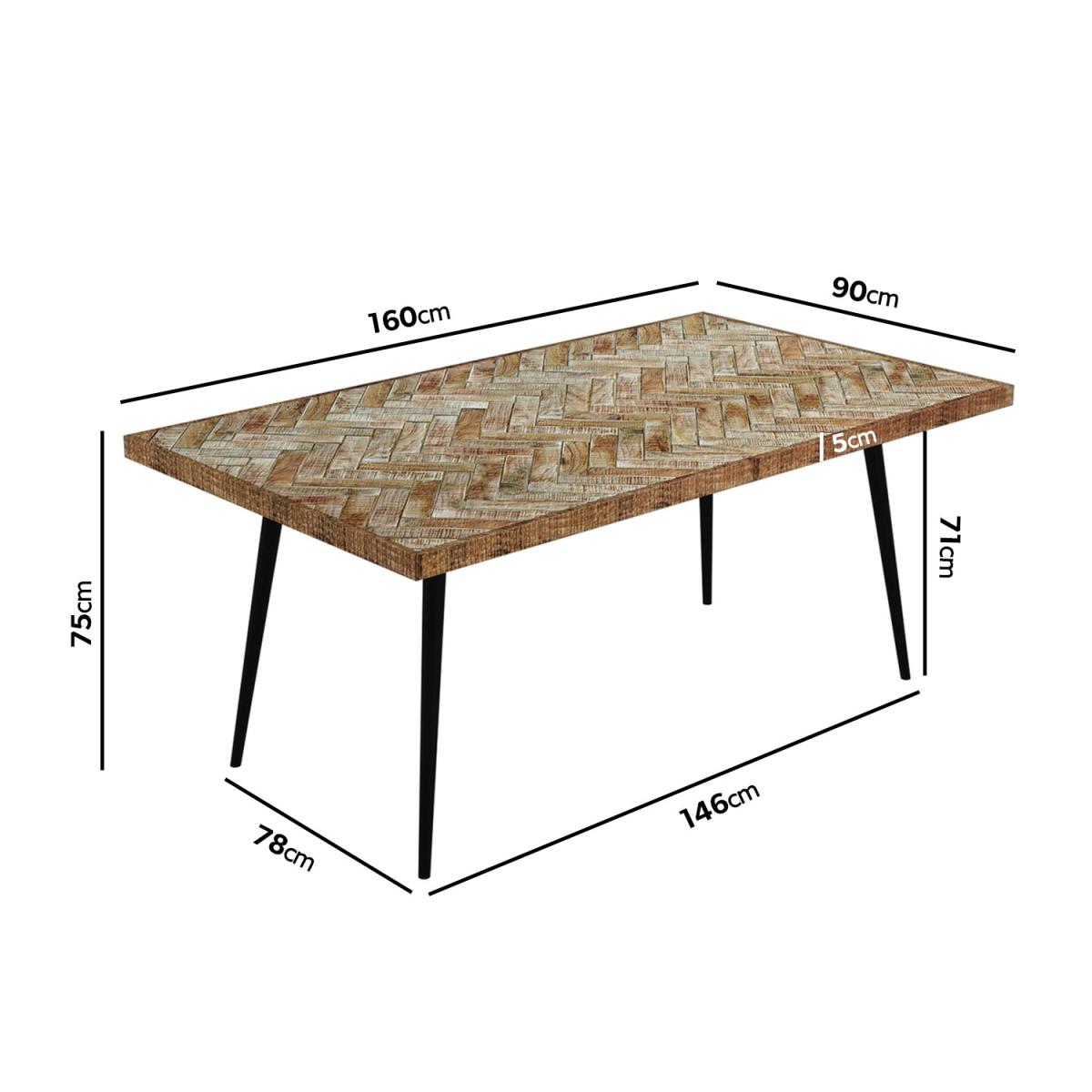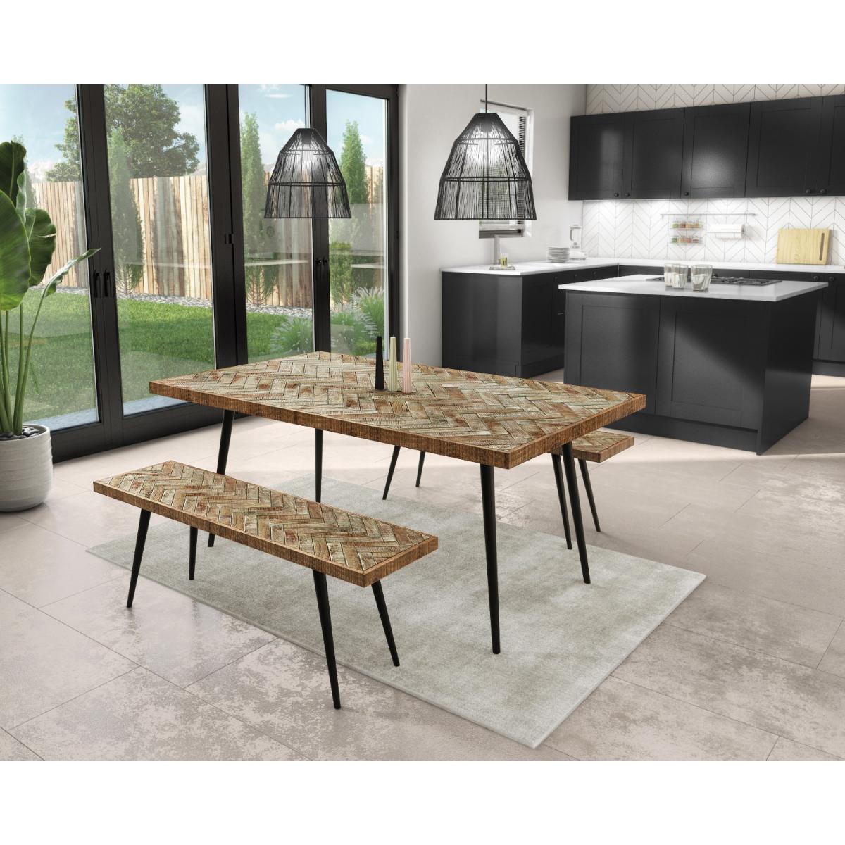 . This bundle includes. 1 x Arno Solid Wood Herringbone Dining Table. 2 x Solid Wood Herringbone Dining Benches Features we love Solid mango wood dining set with herringbone finish. Includes 2 solid wood benches and one table. Comfortably seat 4 – ideal for families. Solid wood tops offer durability and longevity. All pieces are complete with tapered black legs Need to know. Dining Table Information. Dimensions. H75 x W160 x D90 cm Inside the leg dimensions. H71 x W146 x D78 cm Seats. 4 Colour. Natural wood Finish. Natural distressed finish and powder-coated metal Material. Solid mango wood and metal Weight. 39kg Assembly required. Yes Dining Bench Information. Dimensions. W120 x D35 x H48 cm Inside the leg dimensions. W118 x D24 x H44 cm Number of benches. 2 Seats. 2 Weight. 13kg Colour. Natural wood and black (legs) Finish. Natural distressed finish and powder-coated metal Material. Solid mango wood and metal Assembly required. Yes.