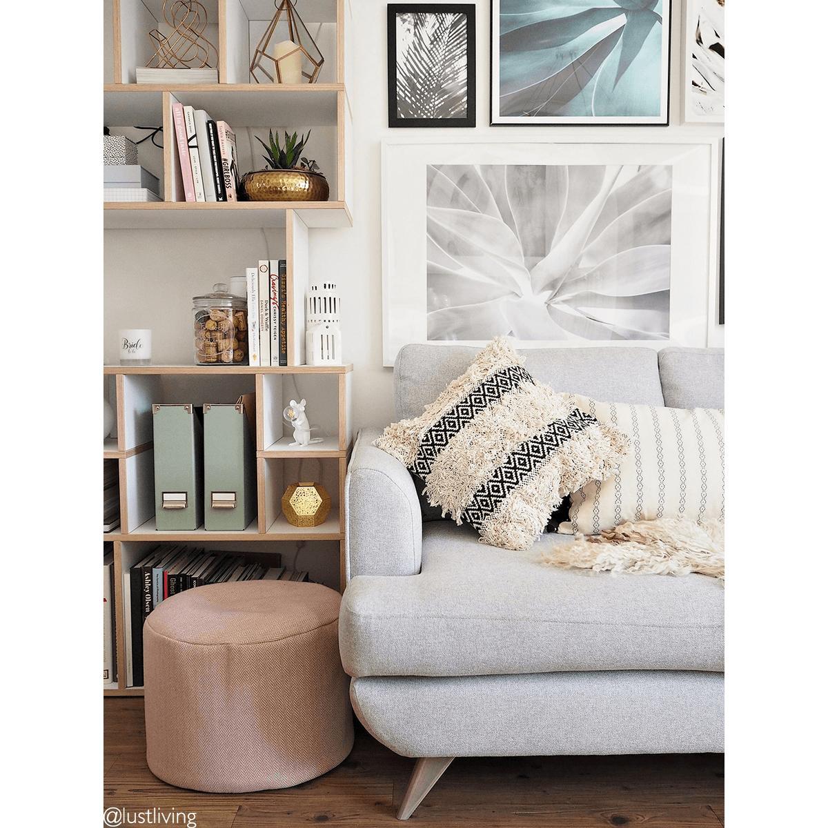 I love this little number for its versatility and soft aesthetic. The blush hue adds warmth to neutral schemes, while the herringbone wool fabric provides texture and cosy appeal. It’s perfect as a footstool in a living room or lounge, but can also double up as a compact occasional seat or side table with a tray on top. It works particularly well in contemporary or Scandi-inspired interiors, where its subtle colour enhances a pared-back palette. For styling tips, pair it with a layered rug to create a cosy corner, or mix with plush cushions and soft throws to build a relaxed, inviting atmosphere. Its rounded shape makes it easy to move around and incorporate into various settings.