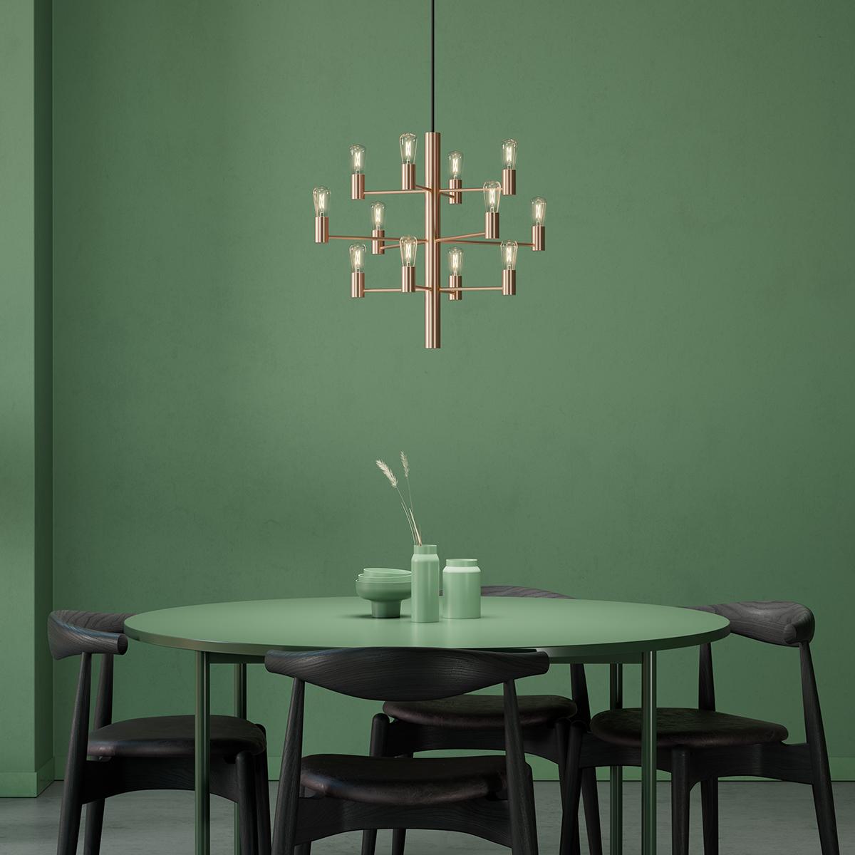 The Manola chandelier from the Danish brand Herstal is a light fixture brimming with style and elegance. 12 dimmable bulbs spread a warm and atmospheric light across any room to create a gentle and welcoming ambience. It can also be placed in a hallway with slightly elevated ceilings. Available in several colours. Includes light bulbs.