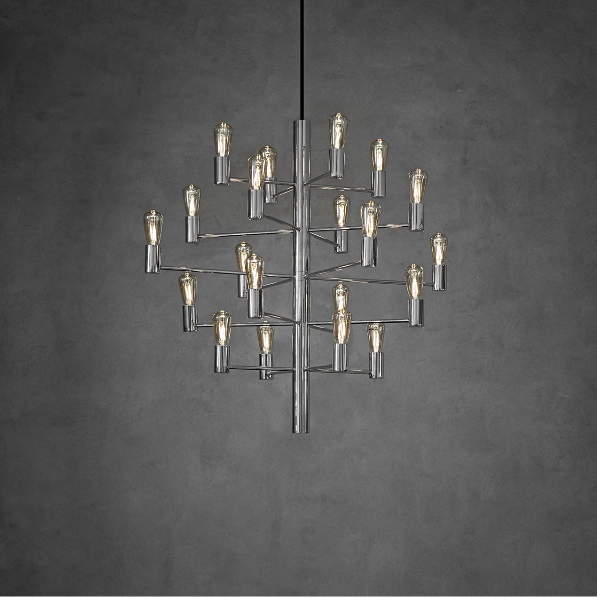 The Herstal Manola 20 candelier is a striking piece that combines modern elegance with a bit of retro flair. I love how its chrome finish adds a sleek, reflective quality, making it ideal for contemporary or minimalist interiors, but it also works well in retro or eclectic schemes when paired with warmer accents. Practical styling tips include installing it in spaces with high ceilings to truly showcase its impressive silhouette, or using dimmable bulbs to adjust its mood depending on the setting. It pairs nicely with simple, understated furniture to let the chandelier be the focal point, and its multiple bulbs provide excellent general illumination for dining areas, living rooms, or grand hallways.
