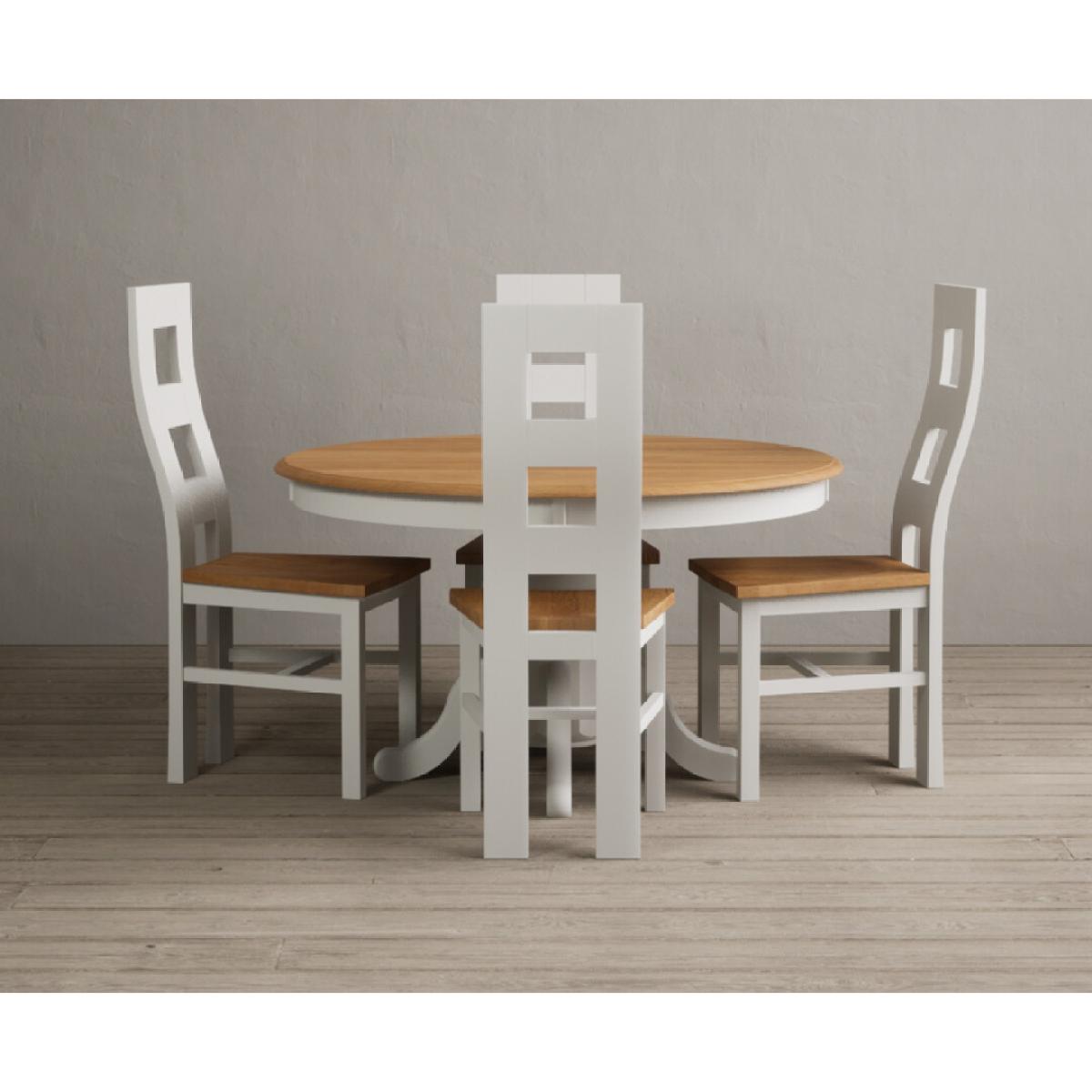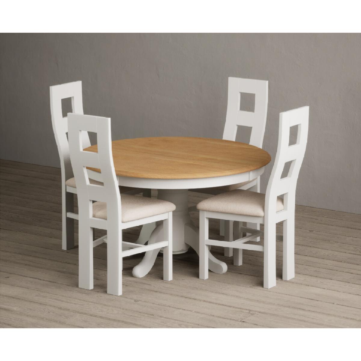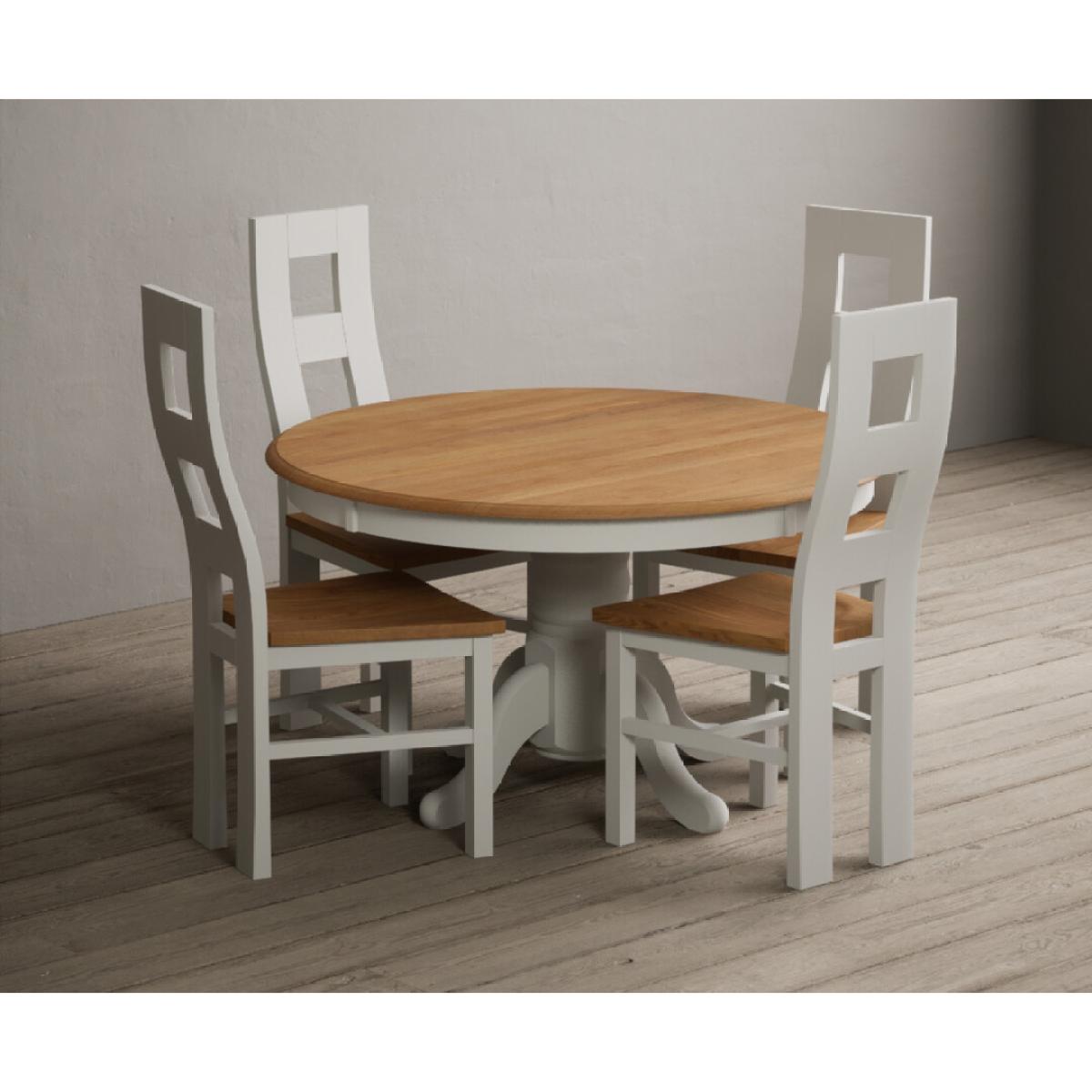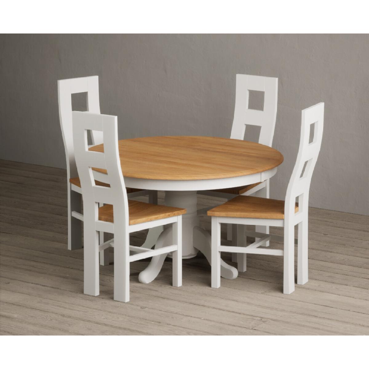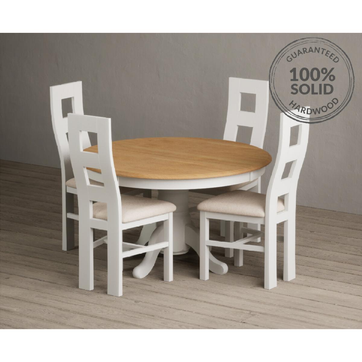 Hertford 120cm Fixed Top Oak and Signal White Painted Round Pedestal Table with Flow Back Chairs features a round solid wood table with a white painted pedestal support and solid oak top, with matching dining chairs.