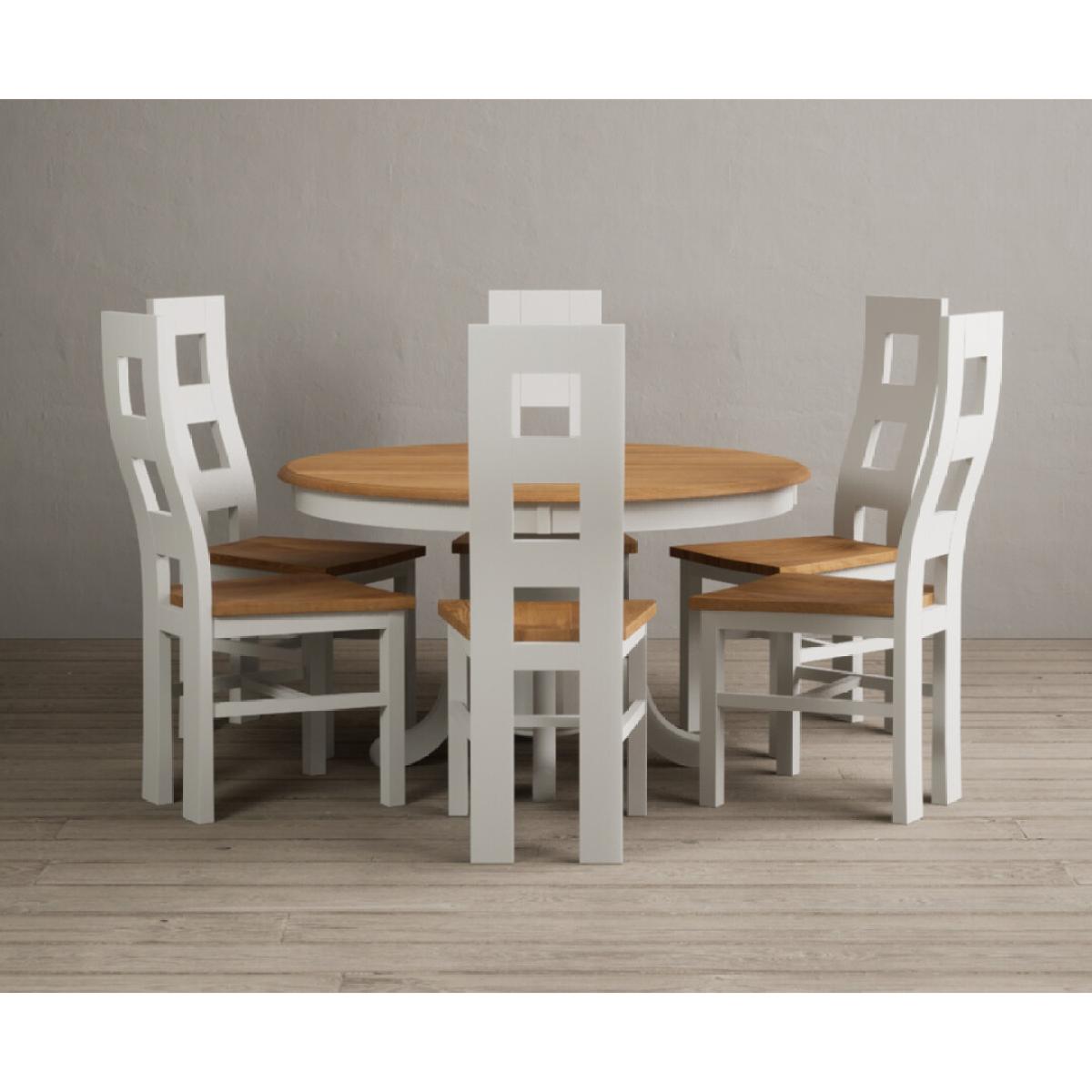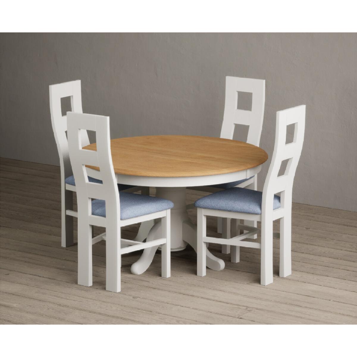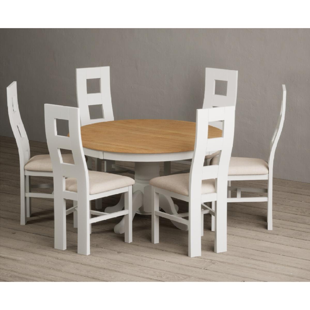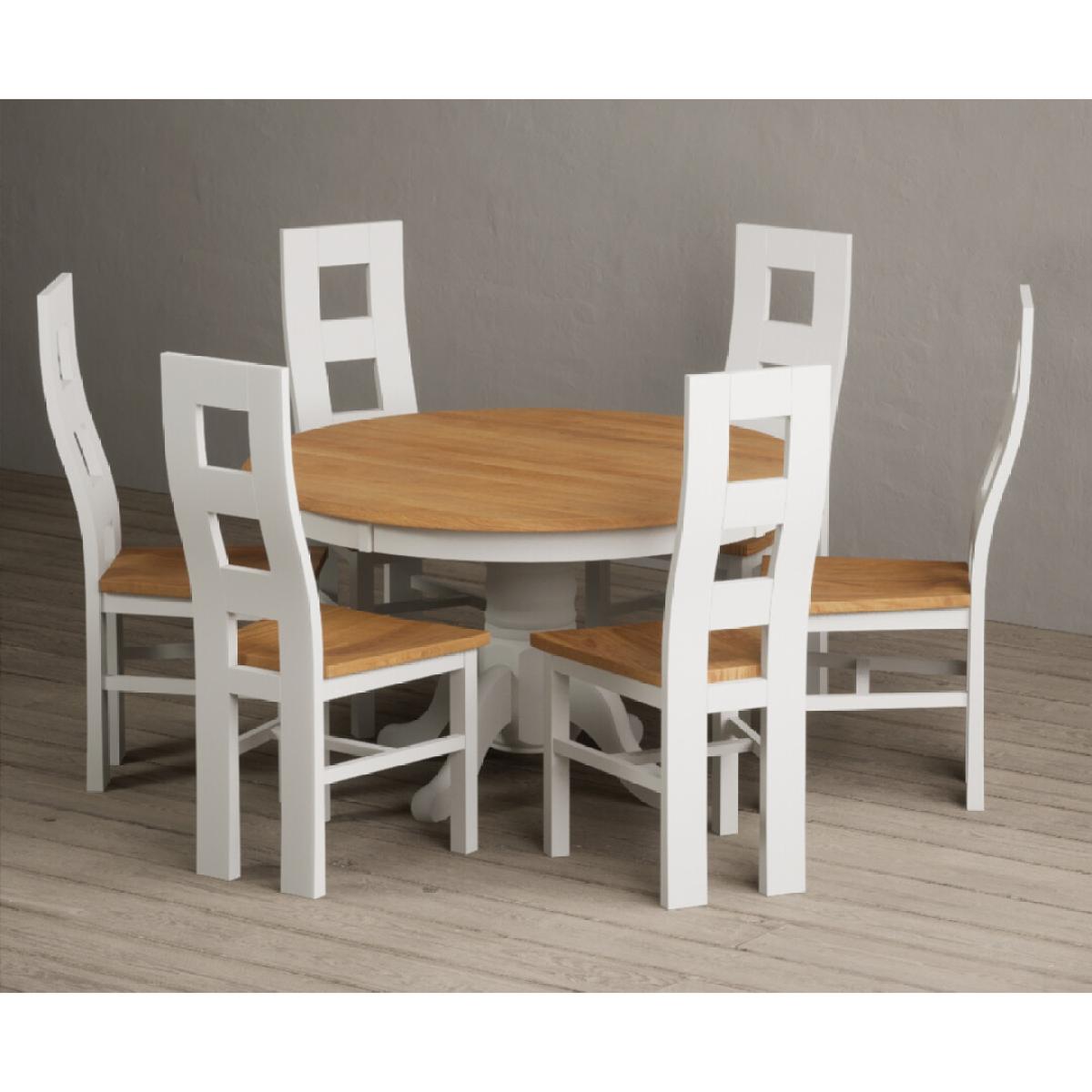 Hertford 120cm Fixed Top Oak and Signal White Painted Round Pedestal Table with Flow Back Chairs features a round solid wood table with a white painted pedestal support and solid oak top, with matching dining chairs.