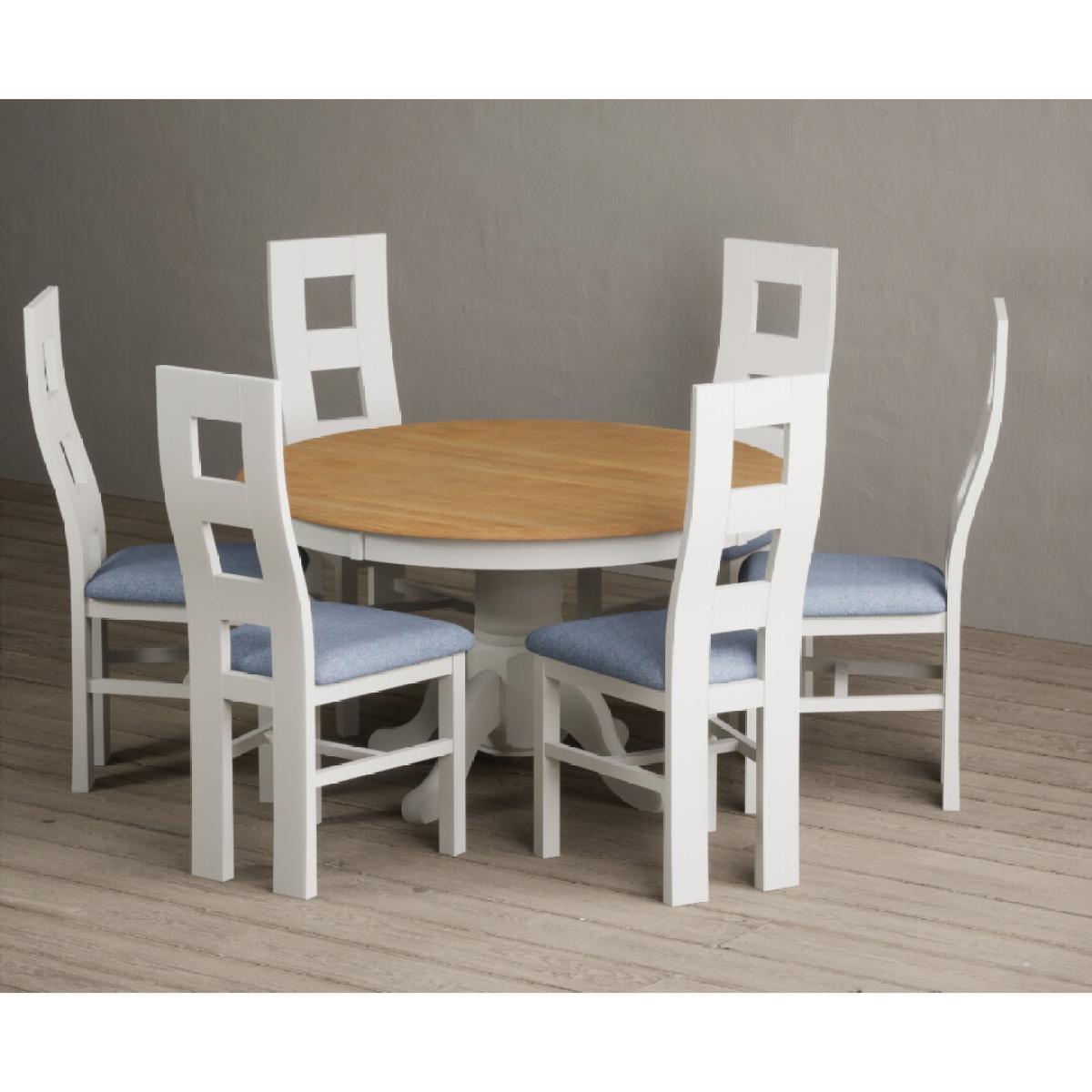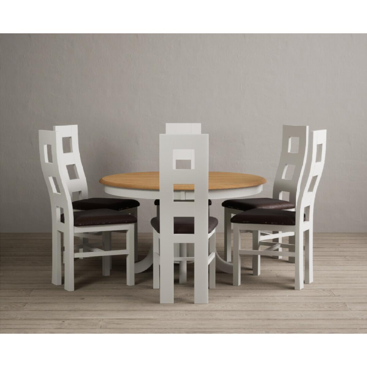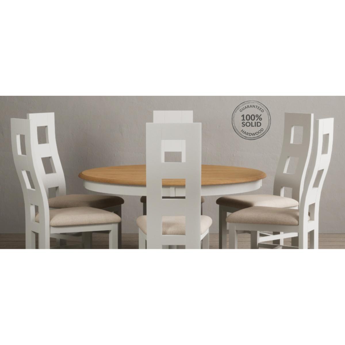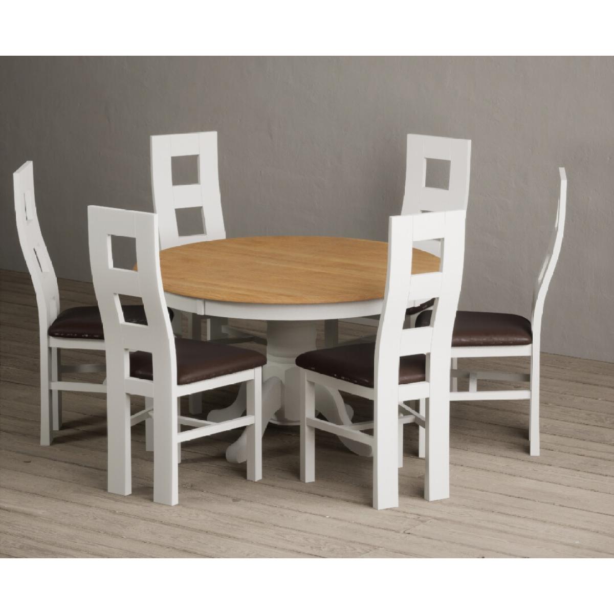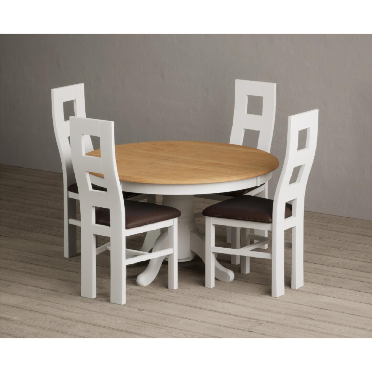 Hertford 120cm Fixed Top Oak and Signal White Painted Round Pedestal Table with Flow Back Chairs features a round solid wood table with a white painted pedestal support and solid oak top, with matching dining chairs.