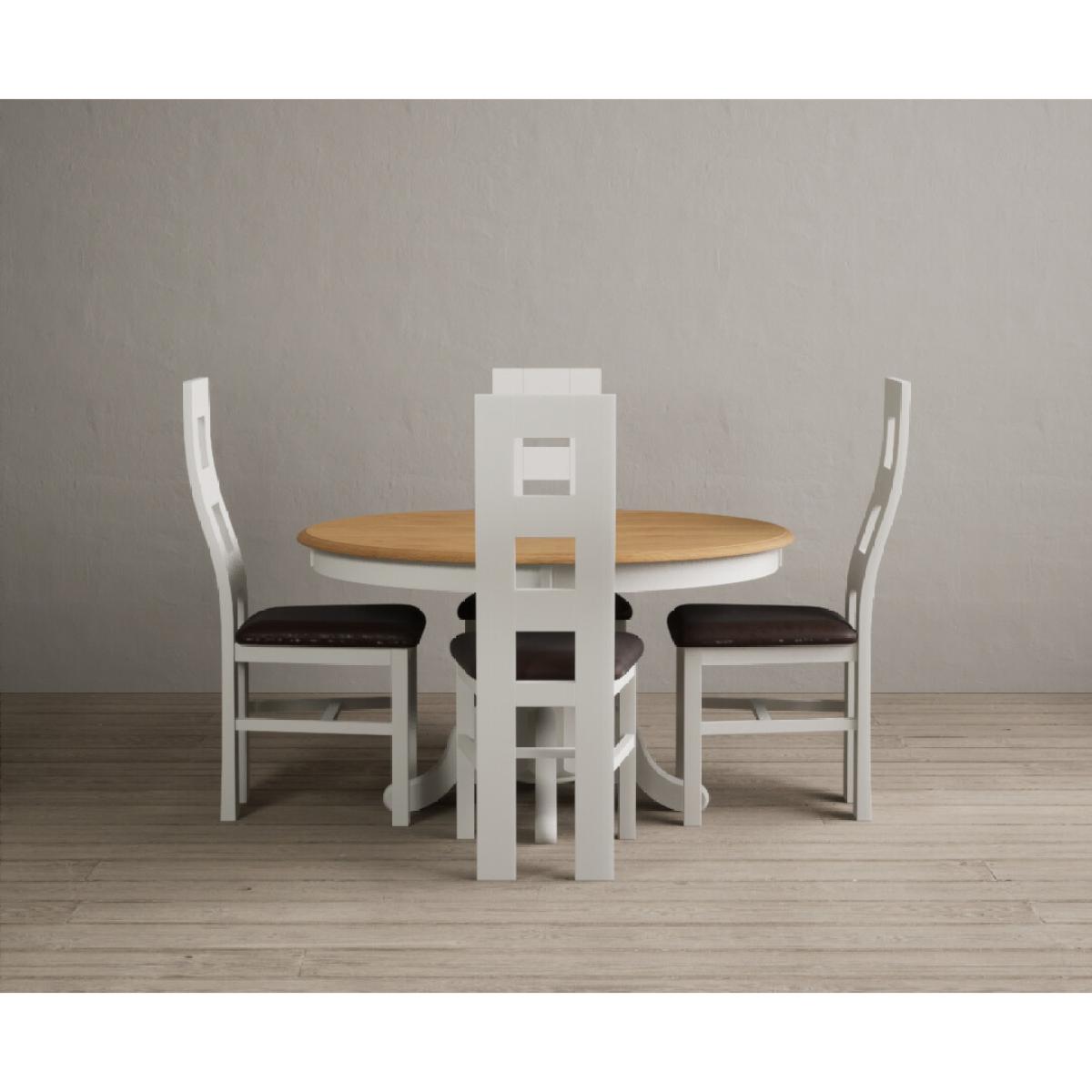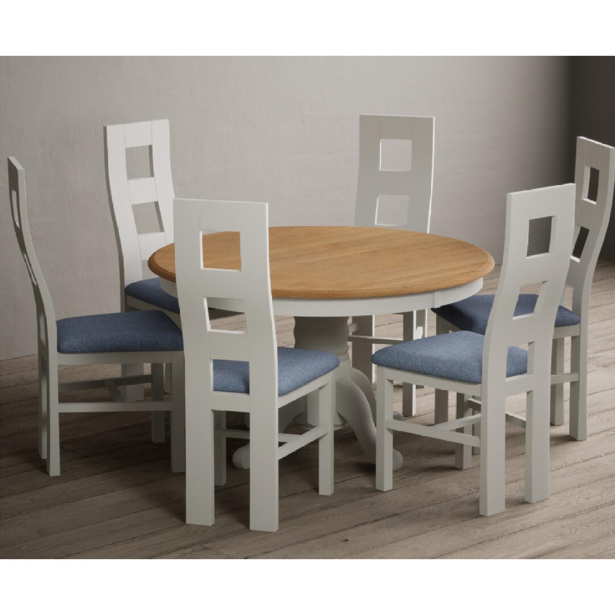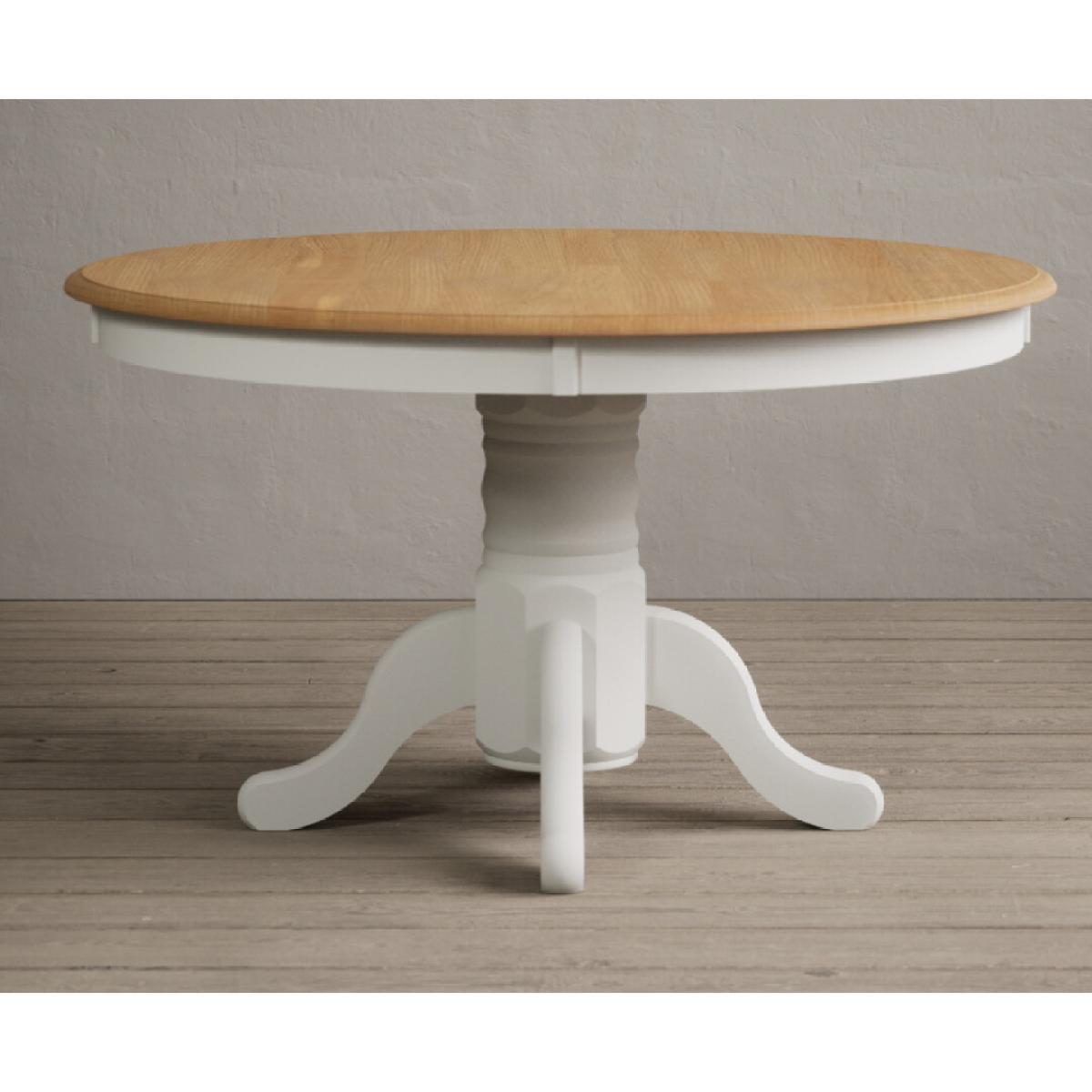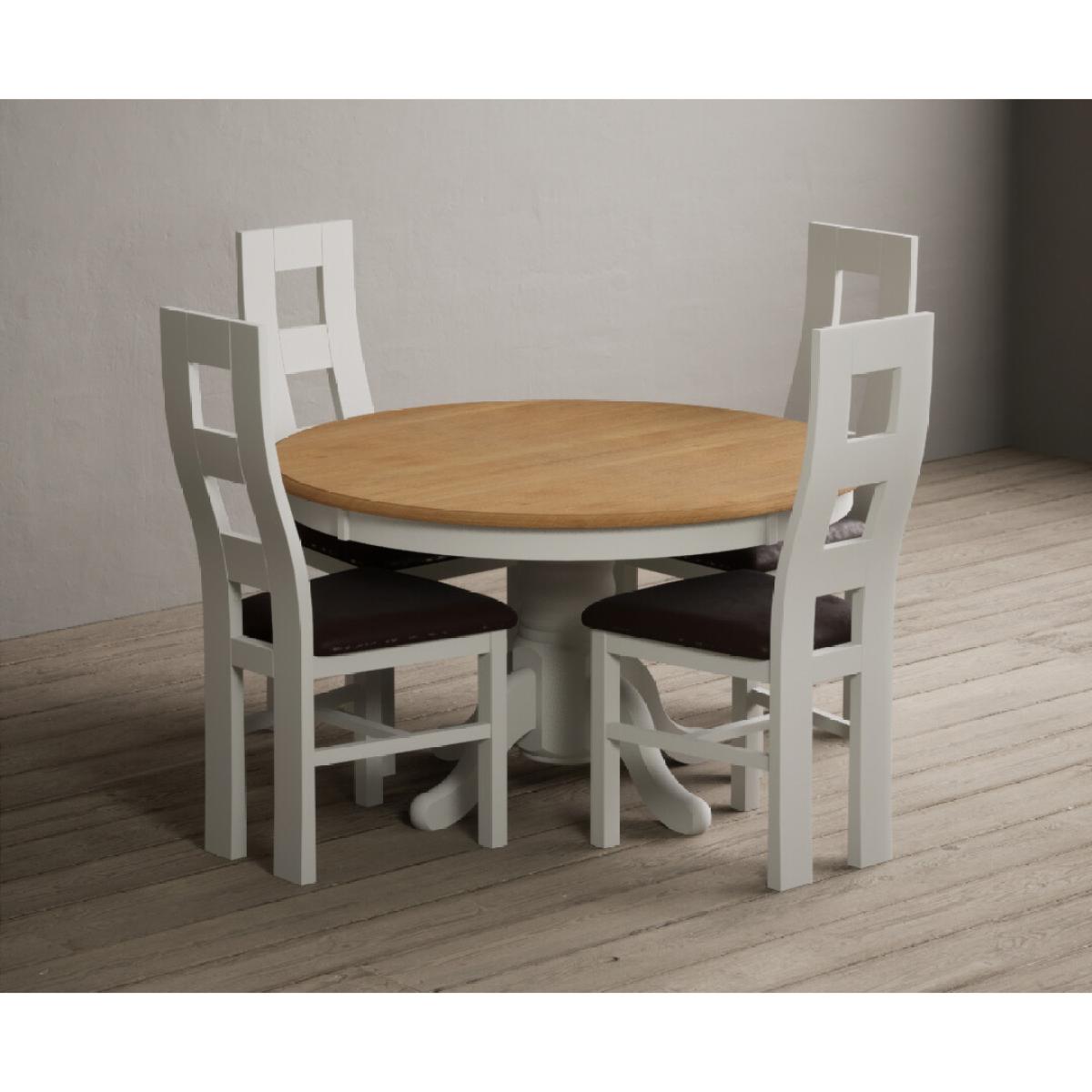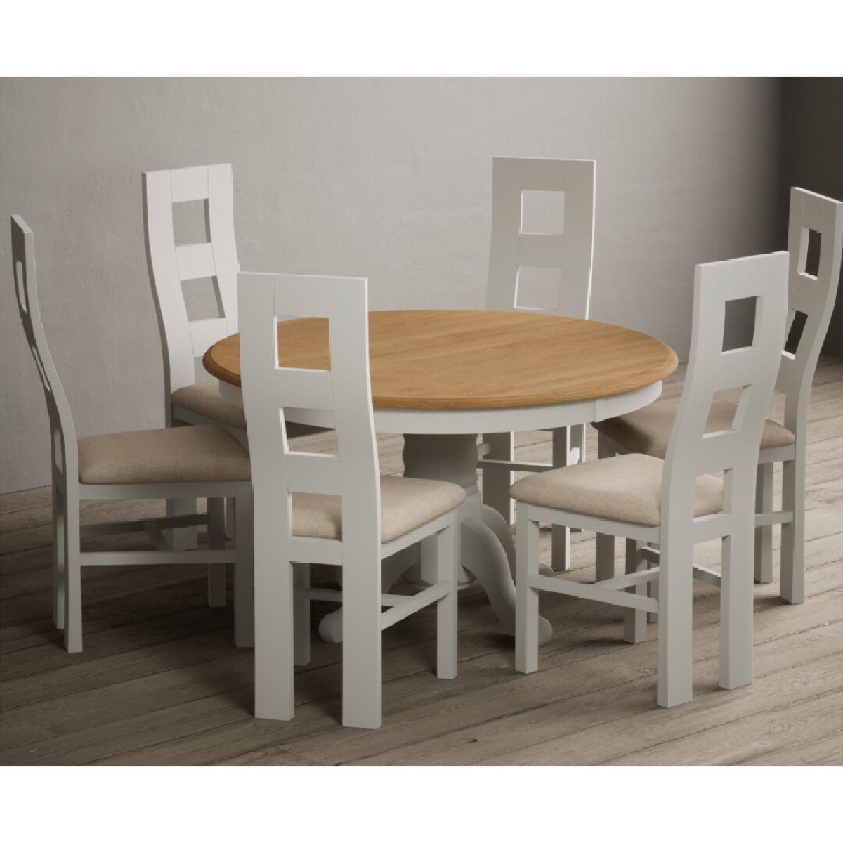 Hertford 120cm Fixed Top Oak and Signal White Painted Round Pedestal Table with Flow Back Chairs features a round solid wood table with a white painted pedestal support and solid oak top, with matching dining chairs.