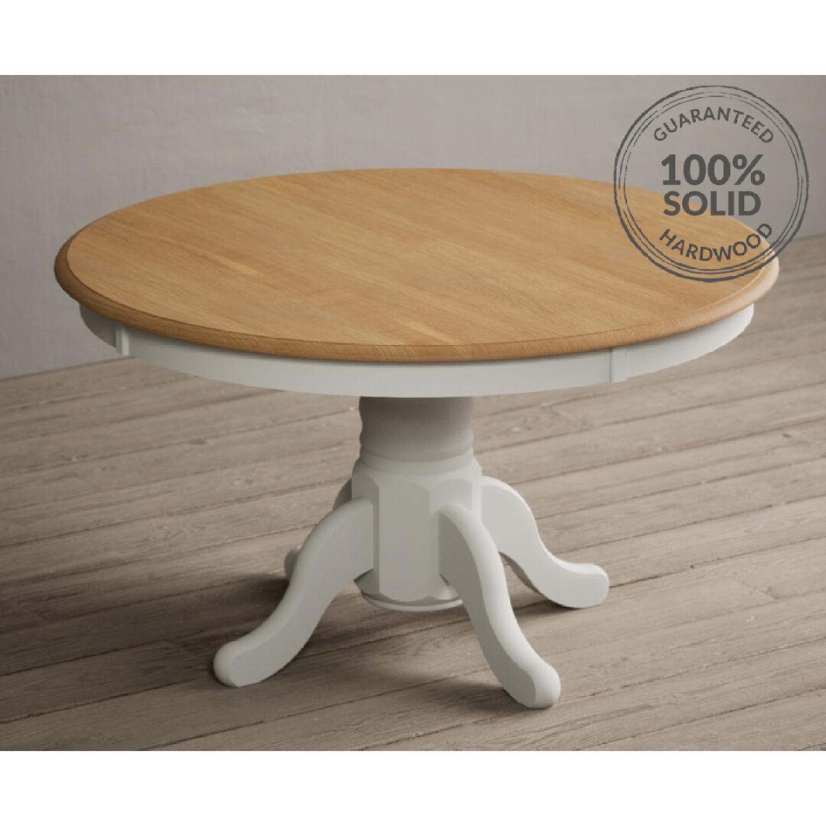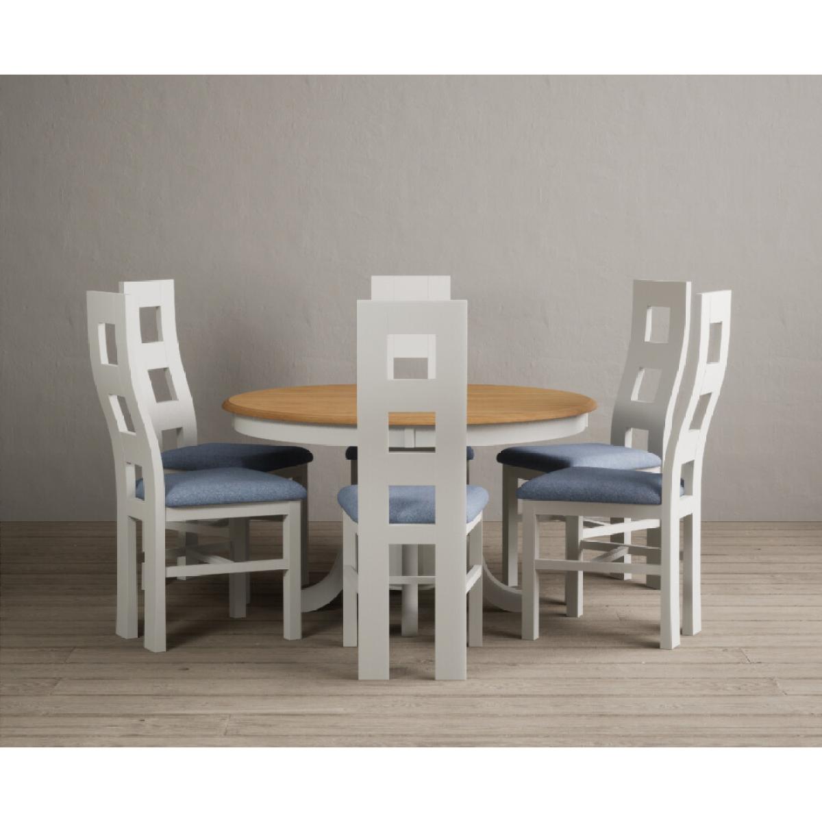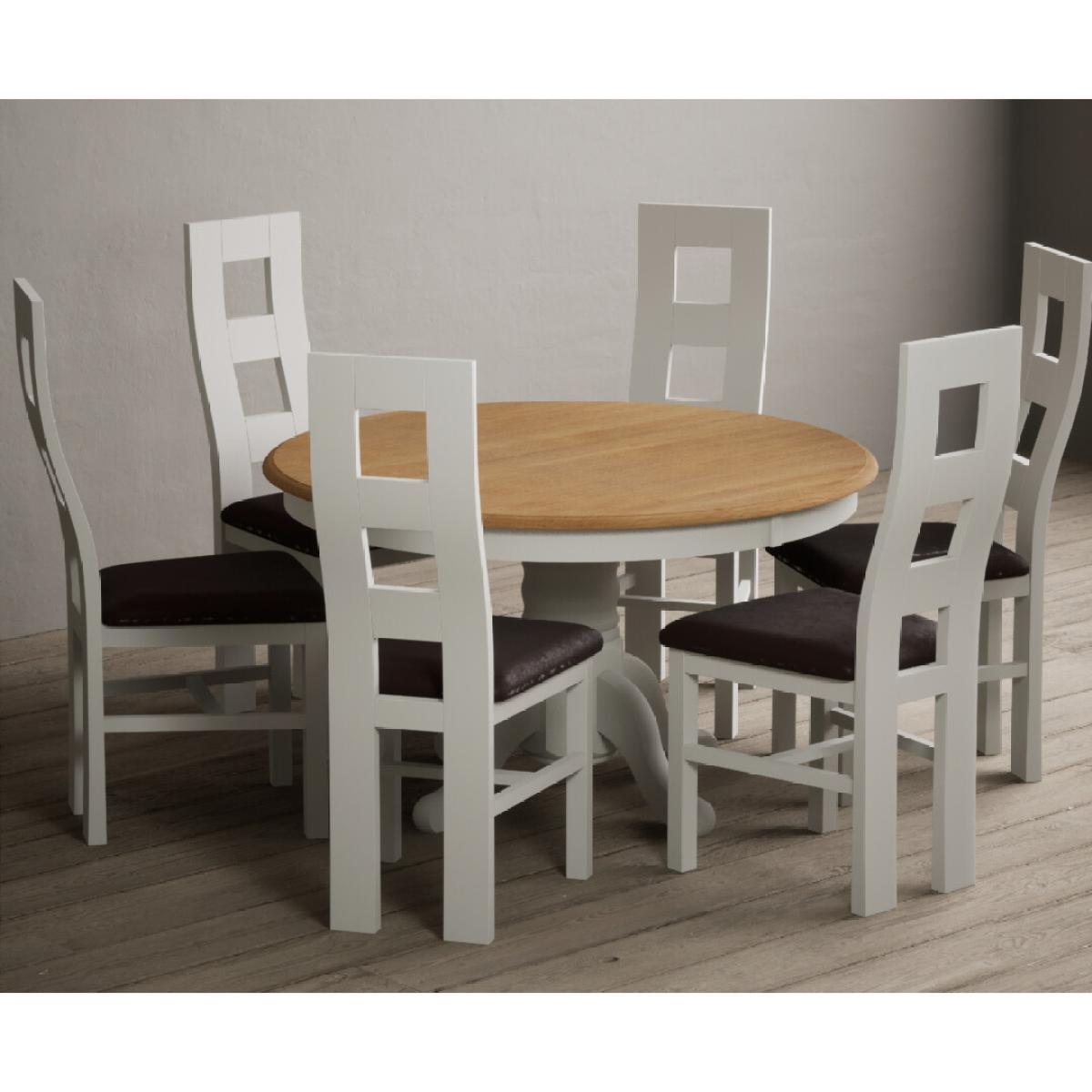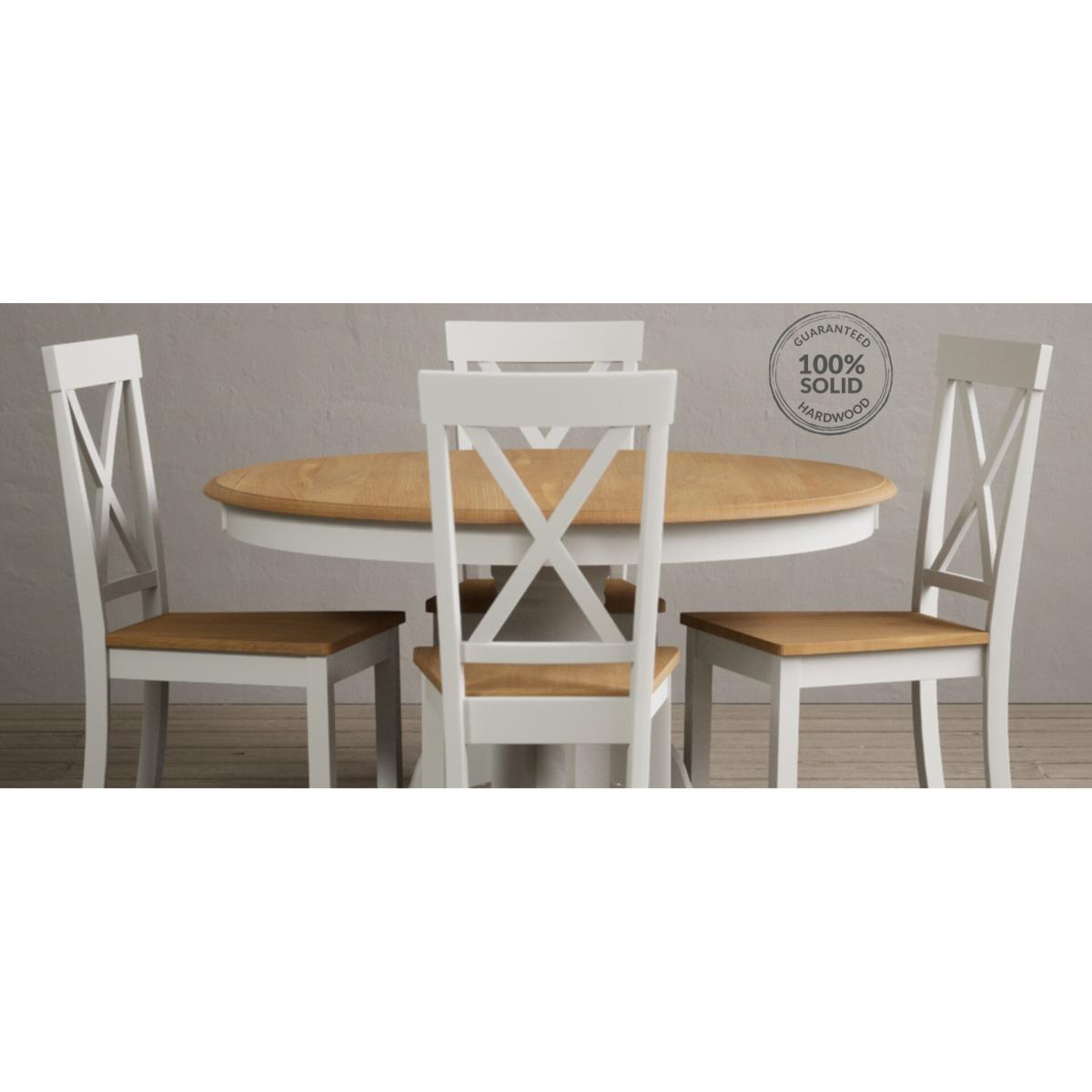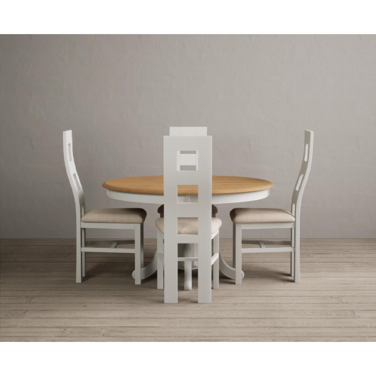 Hertford 120cm Fixed Top Oak and Signal White Painted Round Pedestal Table with Flow Back Chairs features a round solid wood table with a white painted pedestal support and solid oak top, with matching dining chairs.