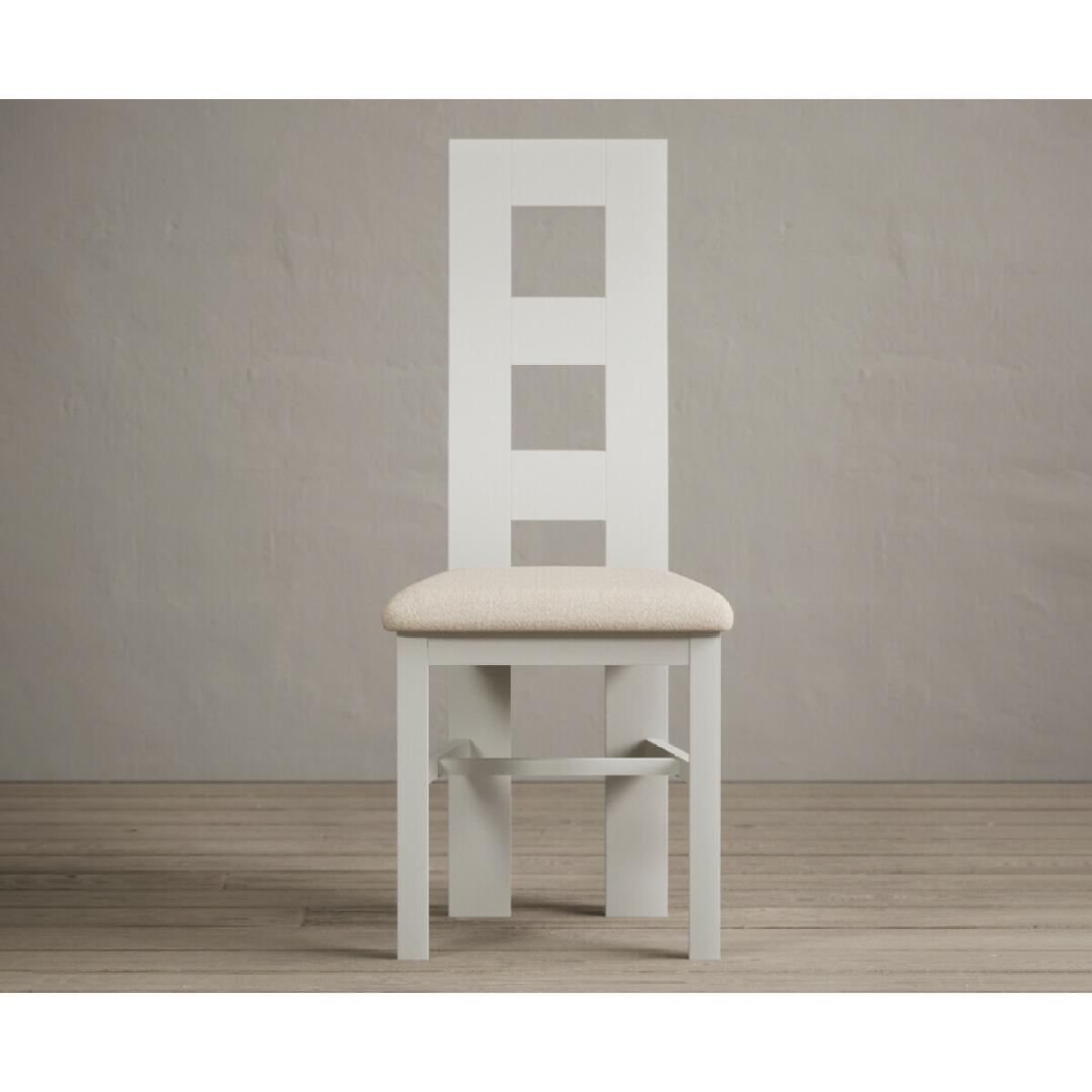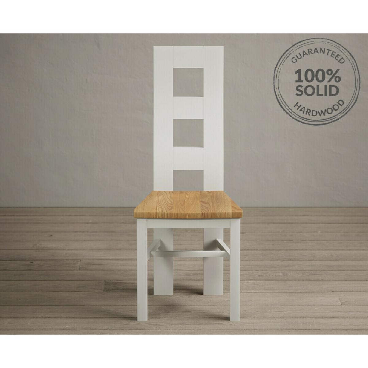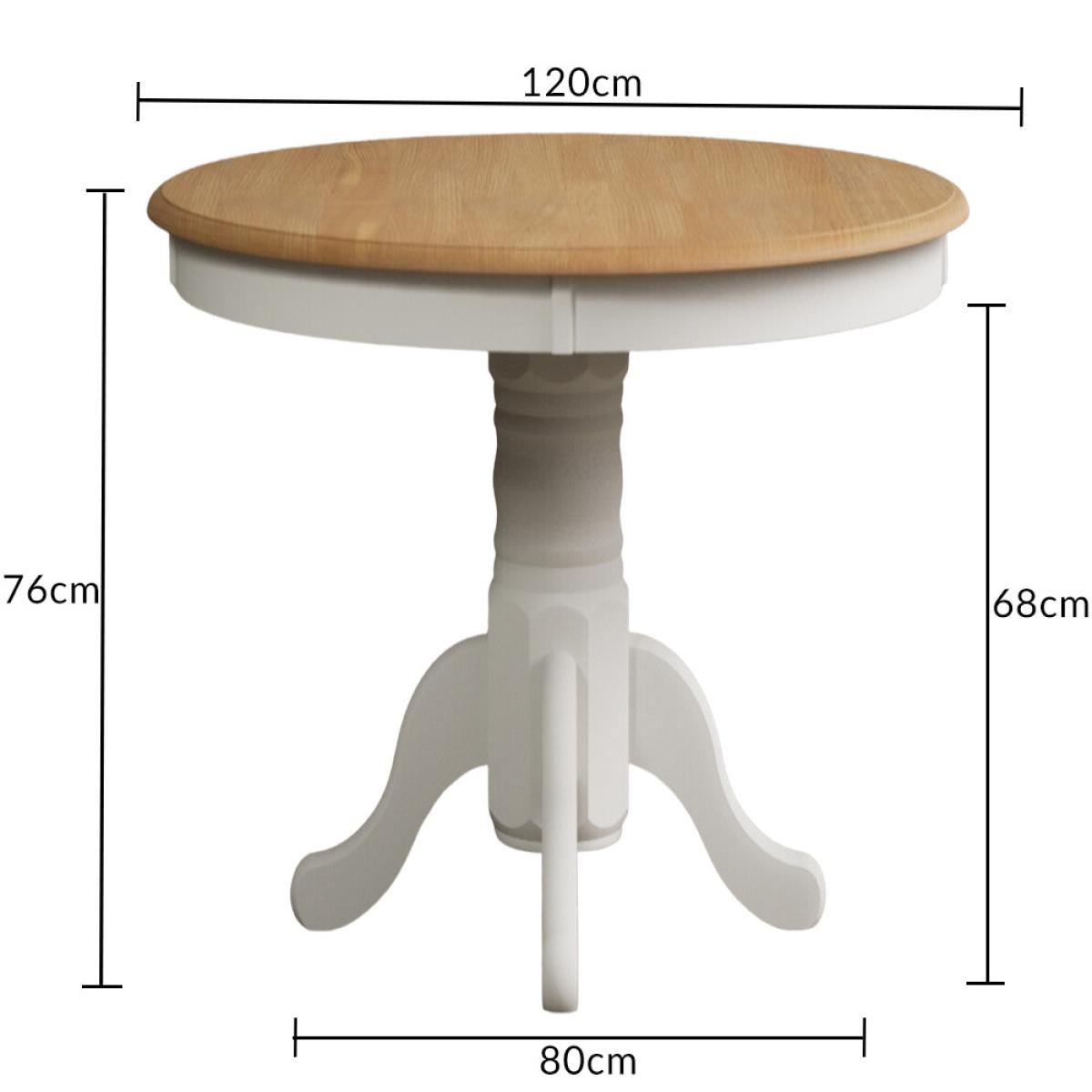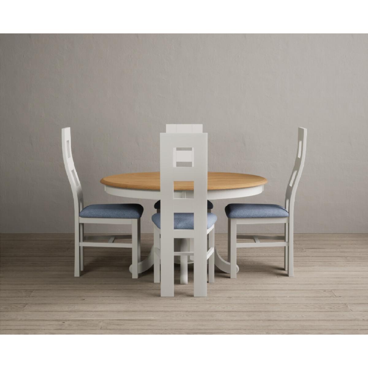 Hertford 120cm Fixed Top Oak and Signal White Painted Round Pedestal Table with Flow Back Chairs features a round solid wood table with a white painted pedestal support and solid oak top, with matching dining chairs.
