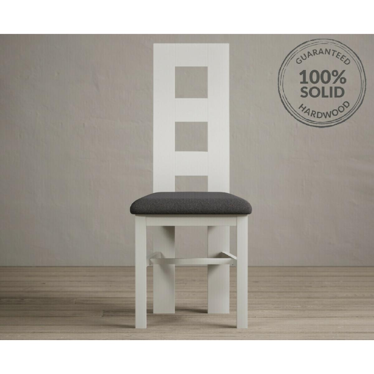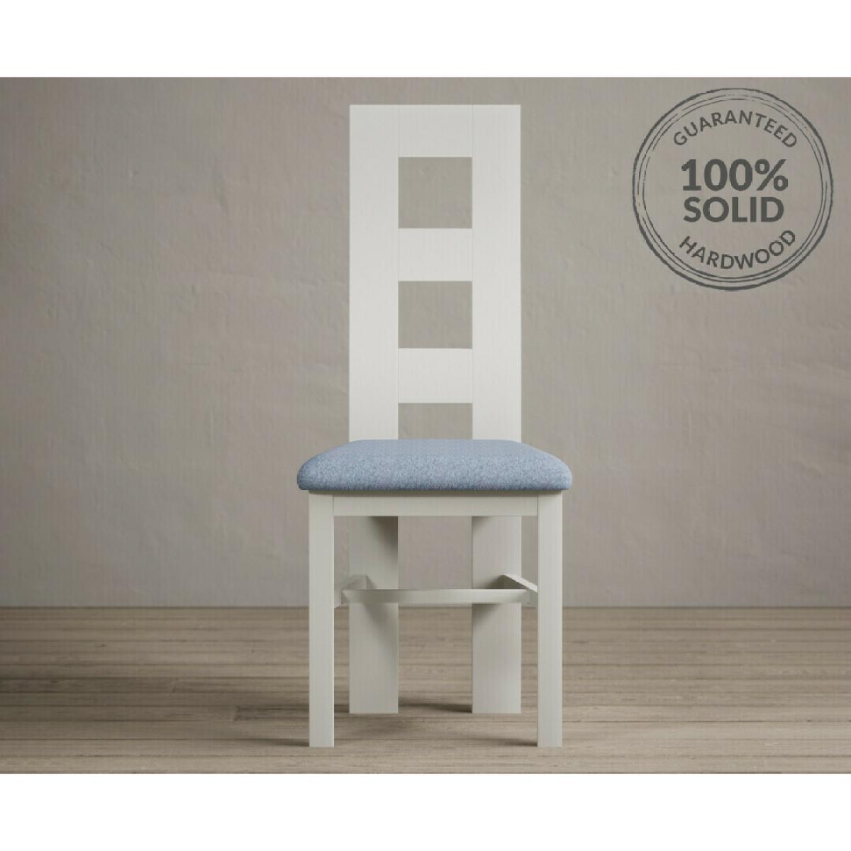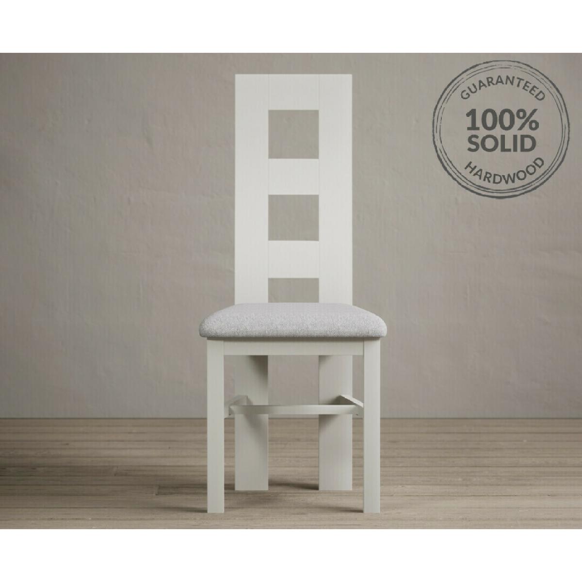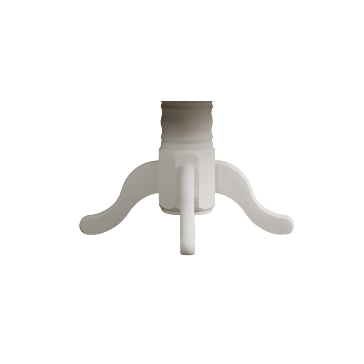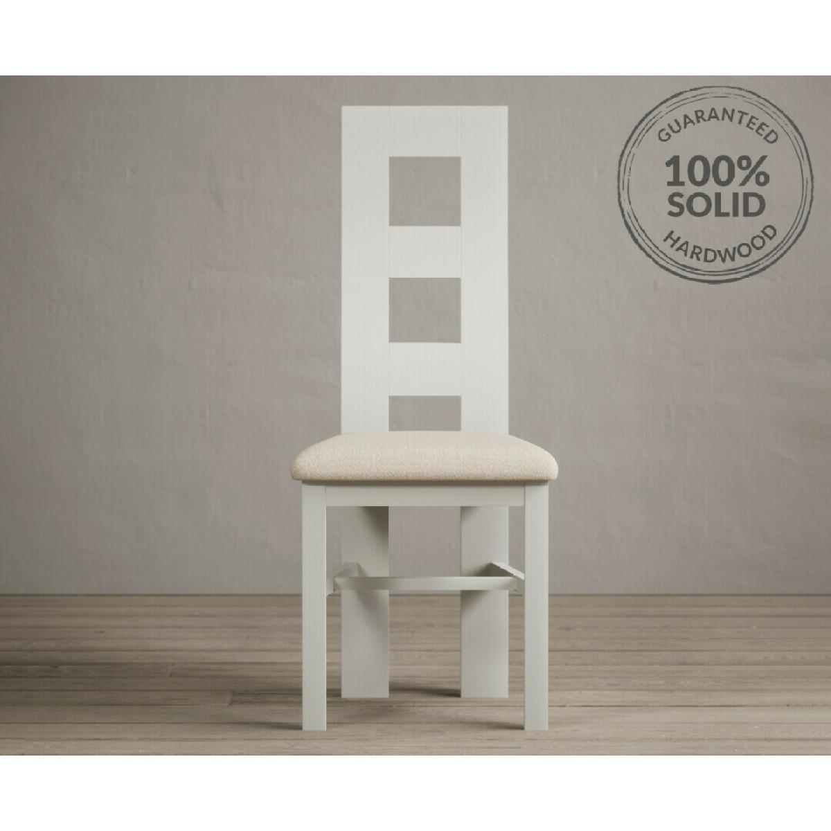 Hertford 120cm Fixed Top Oak and Signal White Painted Round Pedestal Table with Flow Back Chairs features a round solid wood table with a white painted pedestal support and solid oak top, with matching dining chairs.