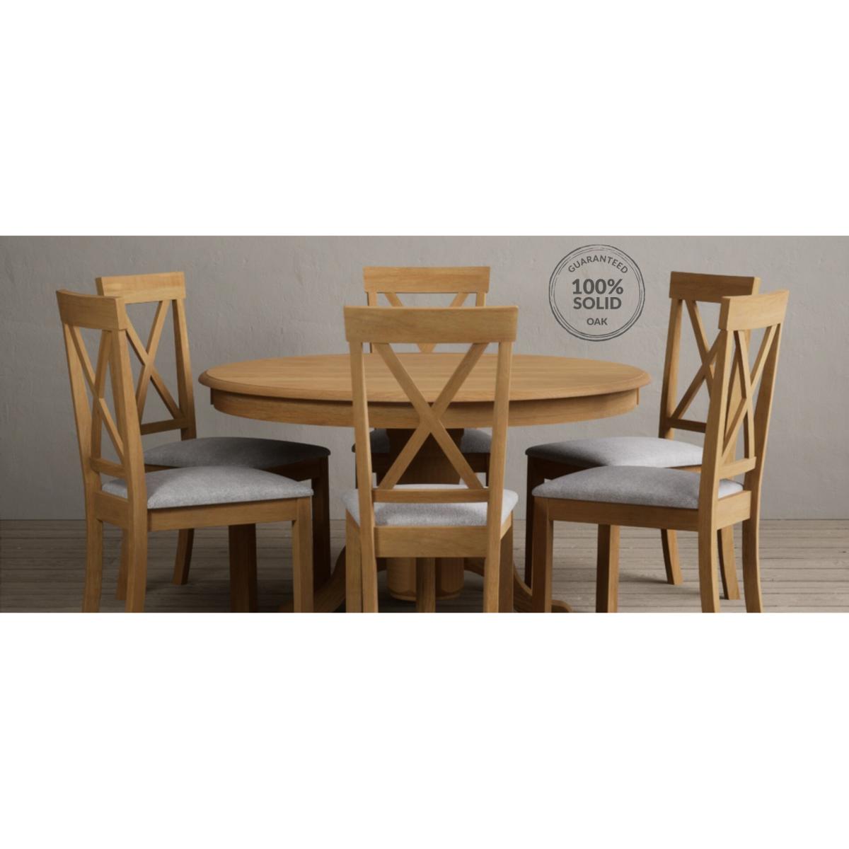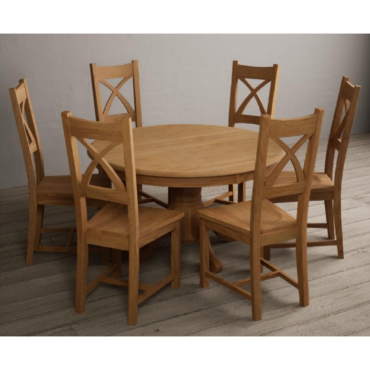 The Hertford 120cm Fixed Top Solid Oak Round Pedestal Table with X Back Chairs is a stylish and sturdy dining set with matching solid oak chairs.