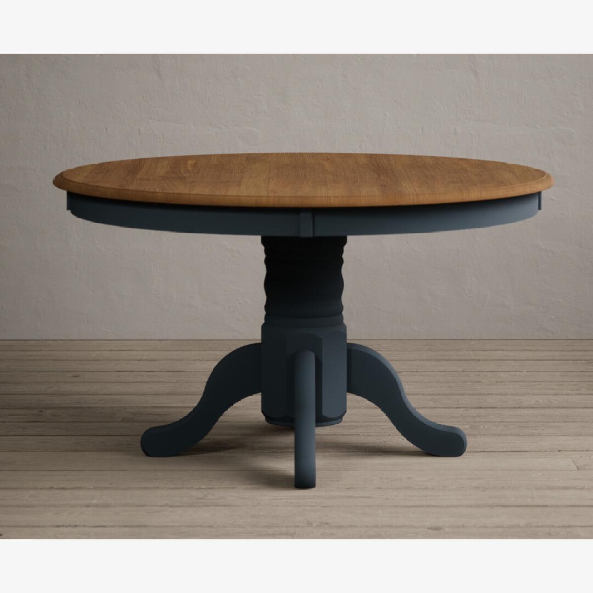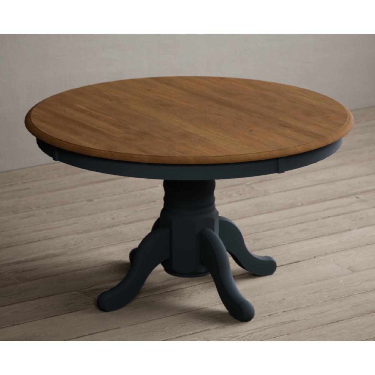 The Hertford 120cm Oak and Dark Blue Painted Dining Table features a 100% solid oak table top and sturdy dark blue painted pedestal.