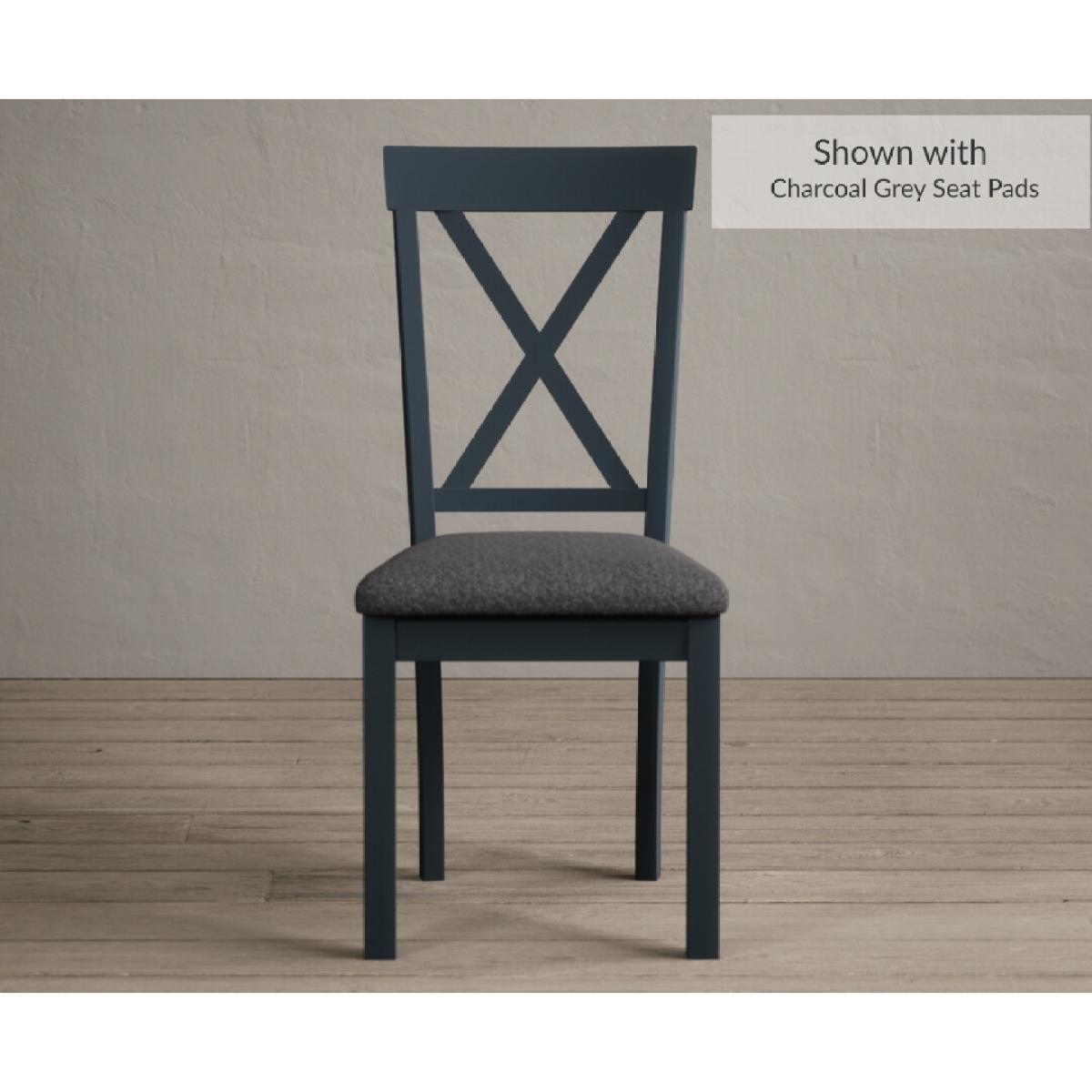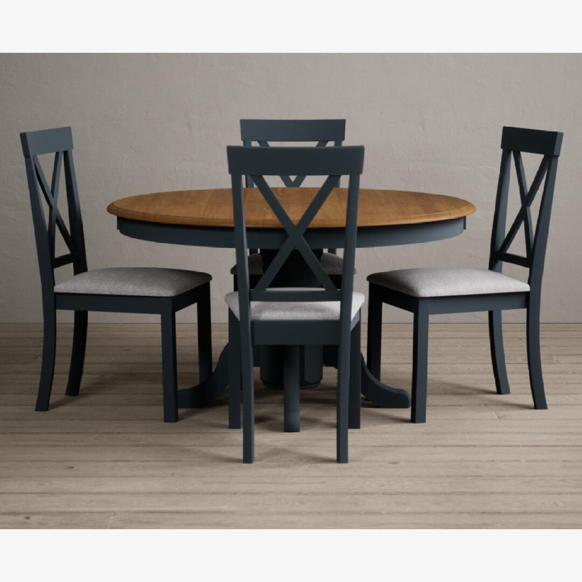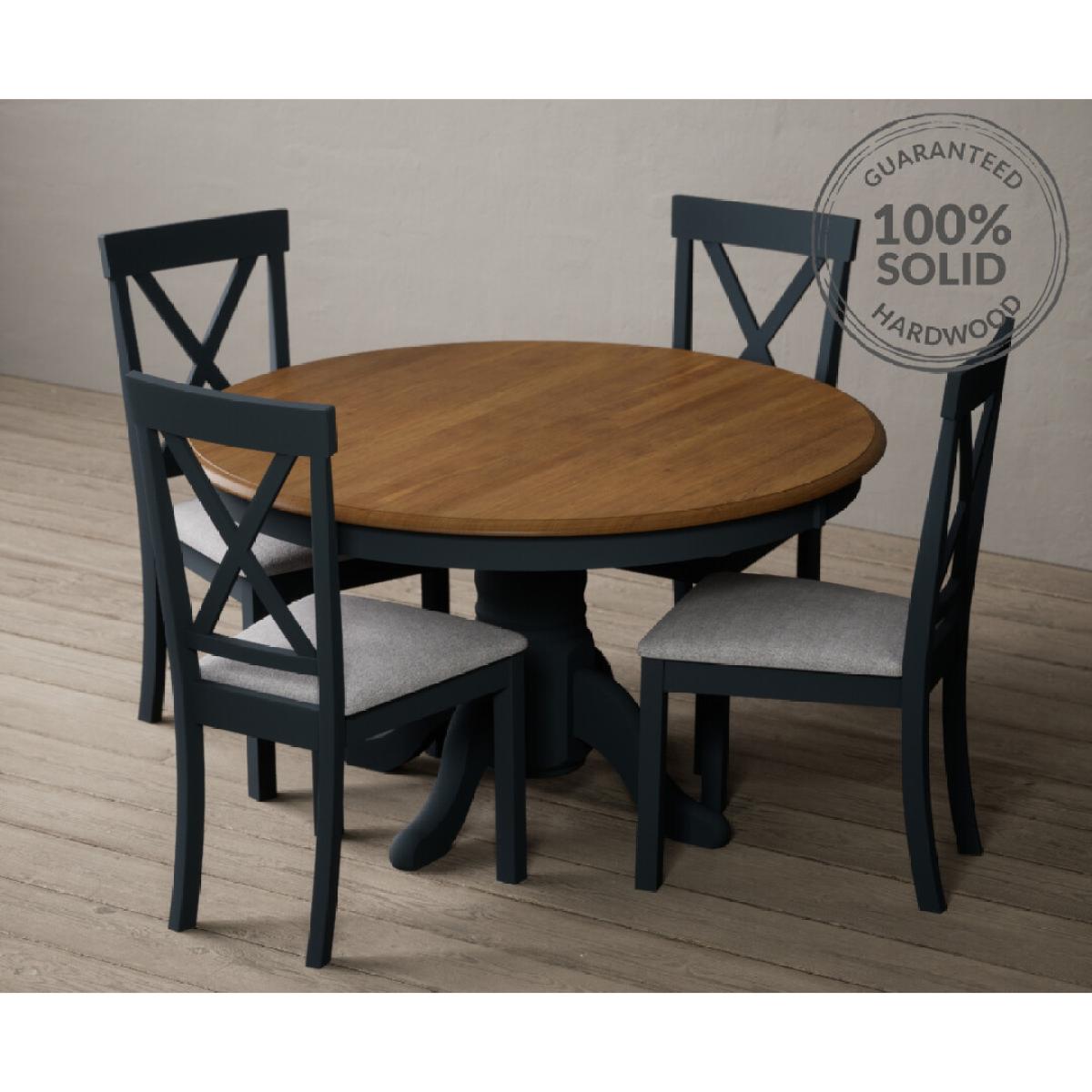 The Hertford 120cm Oak and Dark Blue Painted Round Pedestal Table with Hertford Chairs is a blue painted round solid wood table with a 100% solid oak tabletop, matched with blue painted chairs.