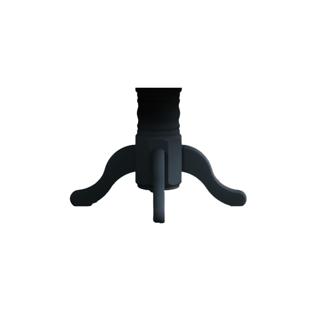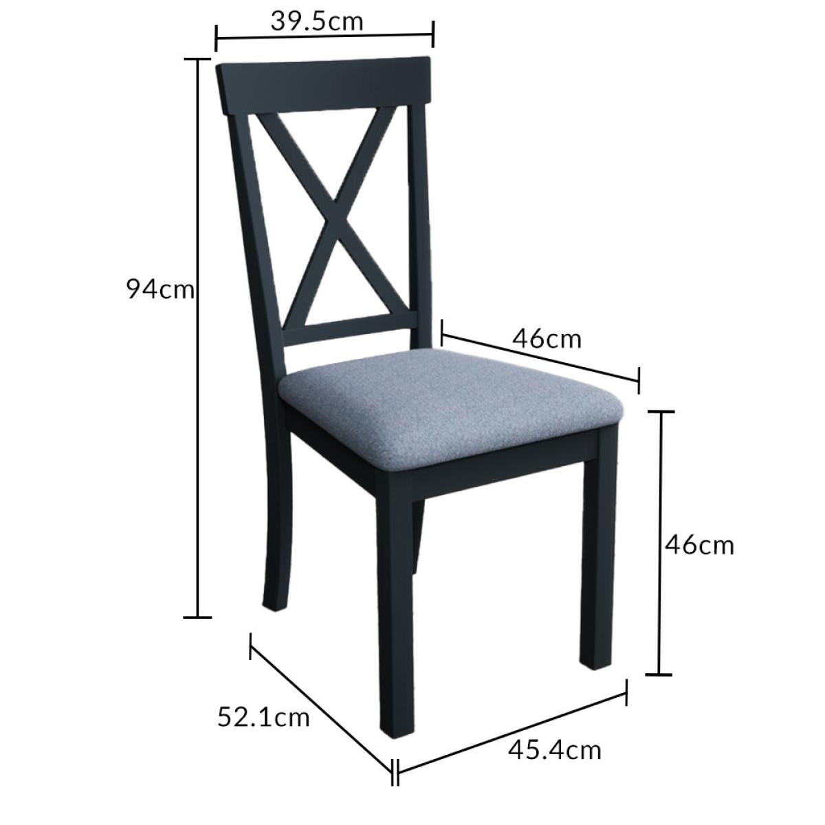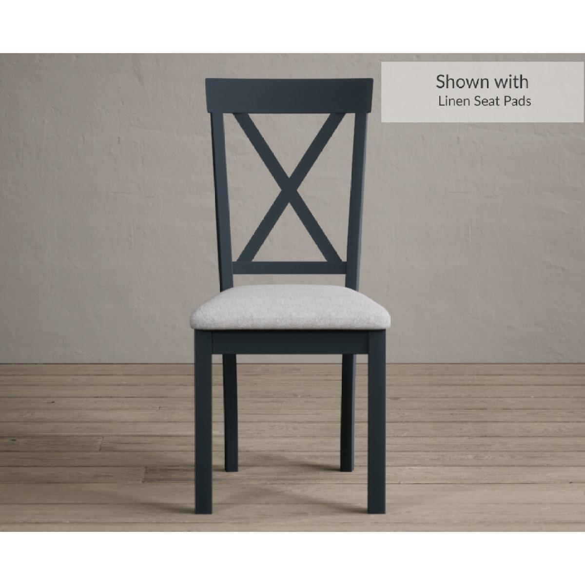 The Hertford 120cm Oak and Dark Blue Painted Round Pedestal Table with Hertford Chairs is a blue painted round solid wood table with a 100% solid oak tabletop, matched with blue painted chairs.