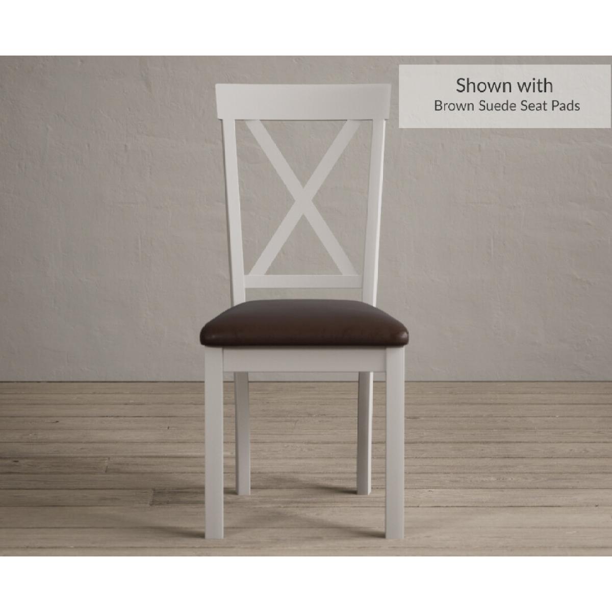 The Hertford 120cm Oak and Soft White Painted Round Pedestal Table with Hertford Chairs is a white painted round dining table with a 100% solid oak table top accompanied by matching painted chairs.