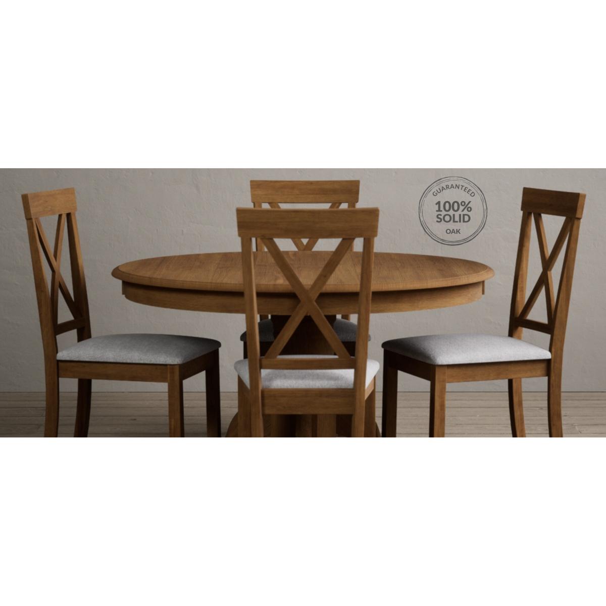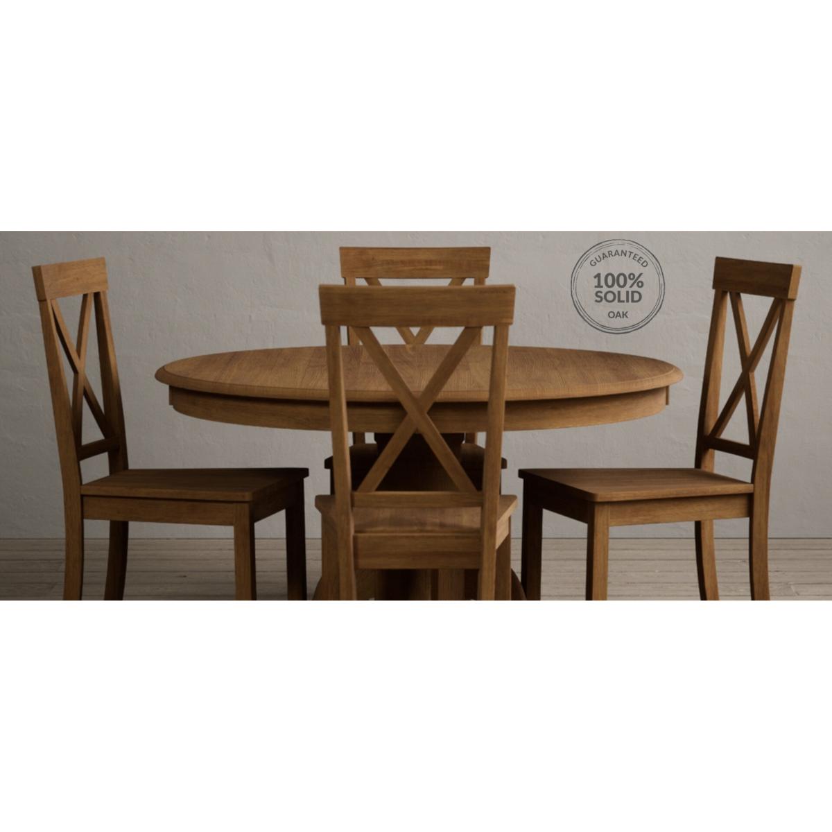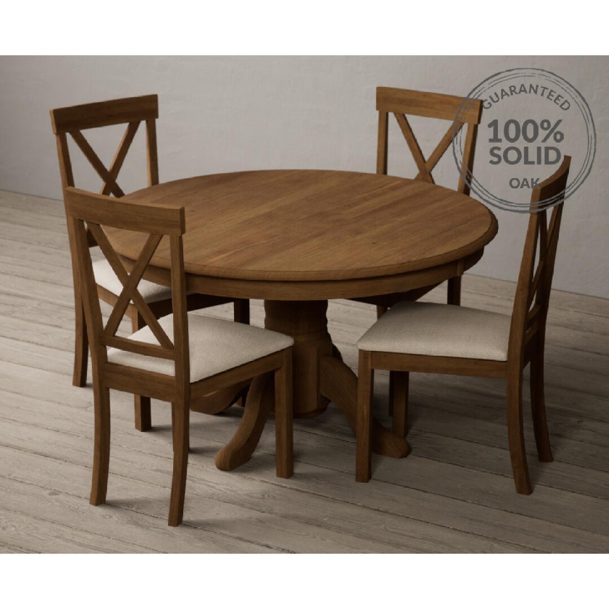 The Hertford 120cm Rustic Oak Round Pedestal Table with Hertford Chairs is a 100% solid oak dining set with a rustic finish featuring a round solid oak dining table and matching chairs.