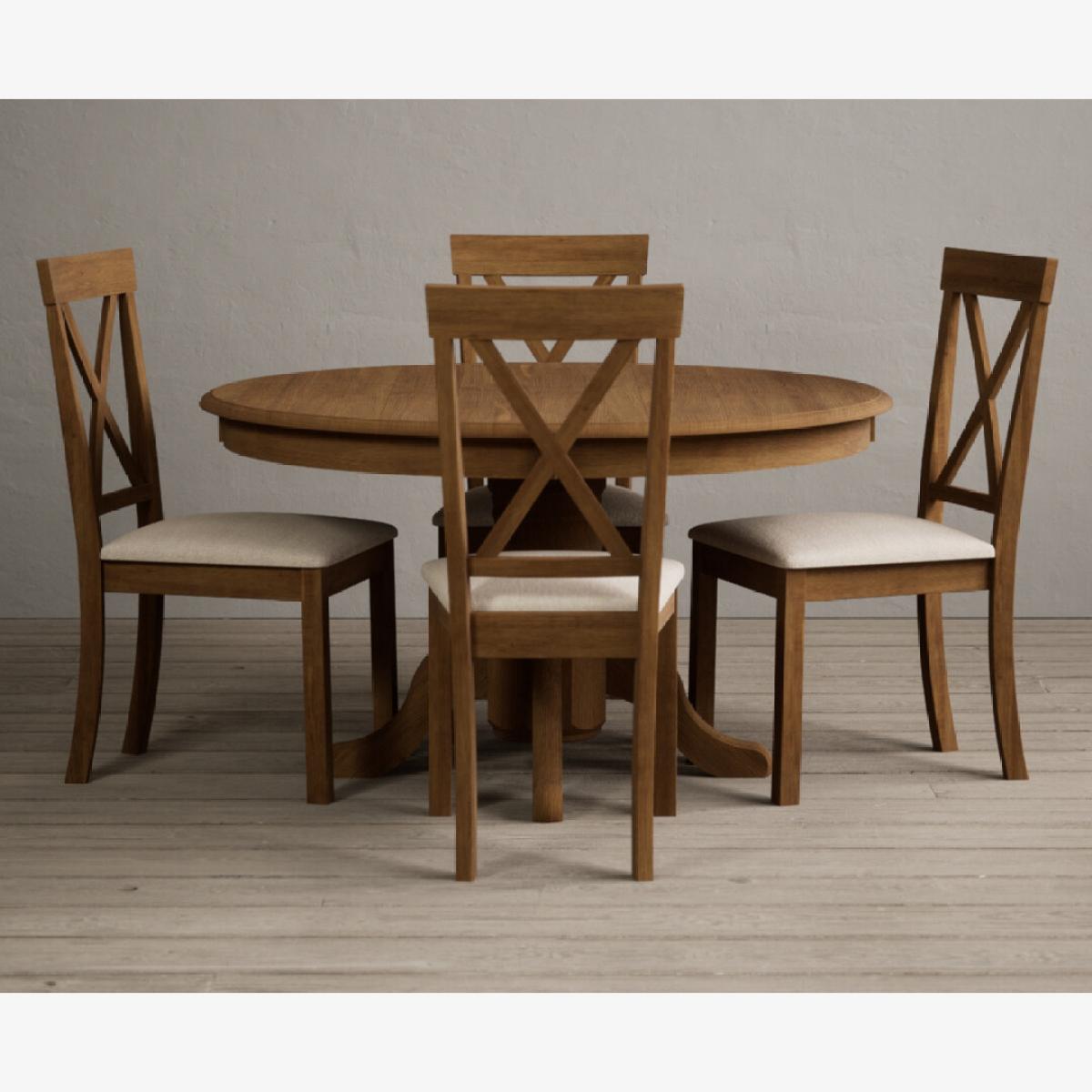 The Hertford 120cm rustic oak round table paired with linen chairs offers a classic, versatile look that works beautifully in both traditional and modern interiors. I love how the warm oak finish adds a cosy, inviting feel, making it ideal for family meals or casual gatherings. It’s a practical choice, as the round shape promotes better conversation and the linen chairs add a touch of softness. Styling tips include complementing it with neutral or pastel tableware for a fresh look, or adding a runner and seasonal centrepiece for visual interest. It works particularly well in country-style, farmhouse, or eclectic interiors, but can also blend seamlessly into contemporary spaces with the right accessories. Keep the surroundings simple to highlight the natural wood grain and craft a welcoming dining area.