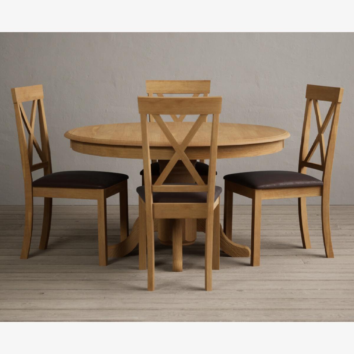 The Hertford 120cm Solid Oak Round Pedestal Table with Hertford Chairs is a 100% solid oak dining table set with a pedestal dining table and matching chairs.